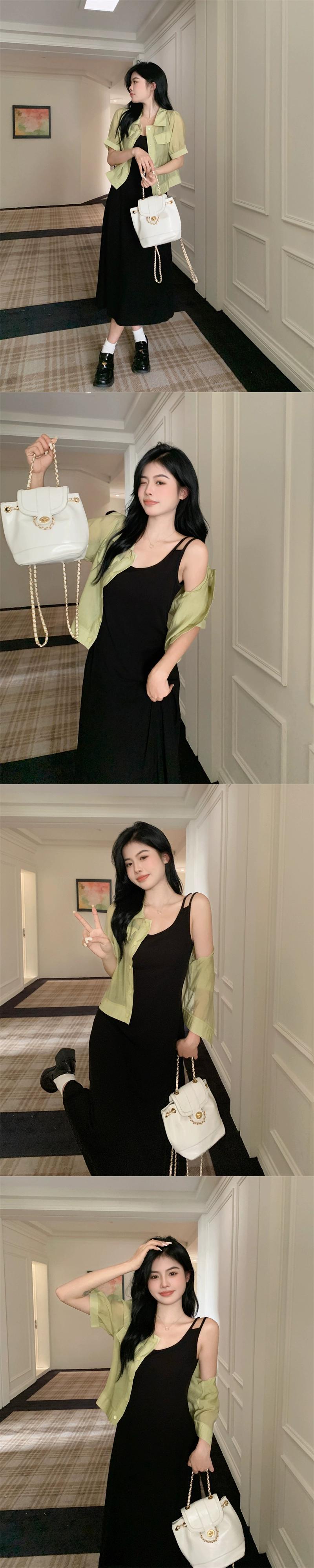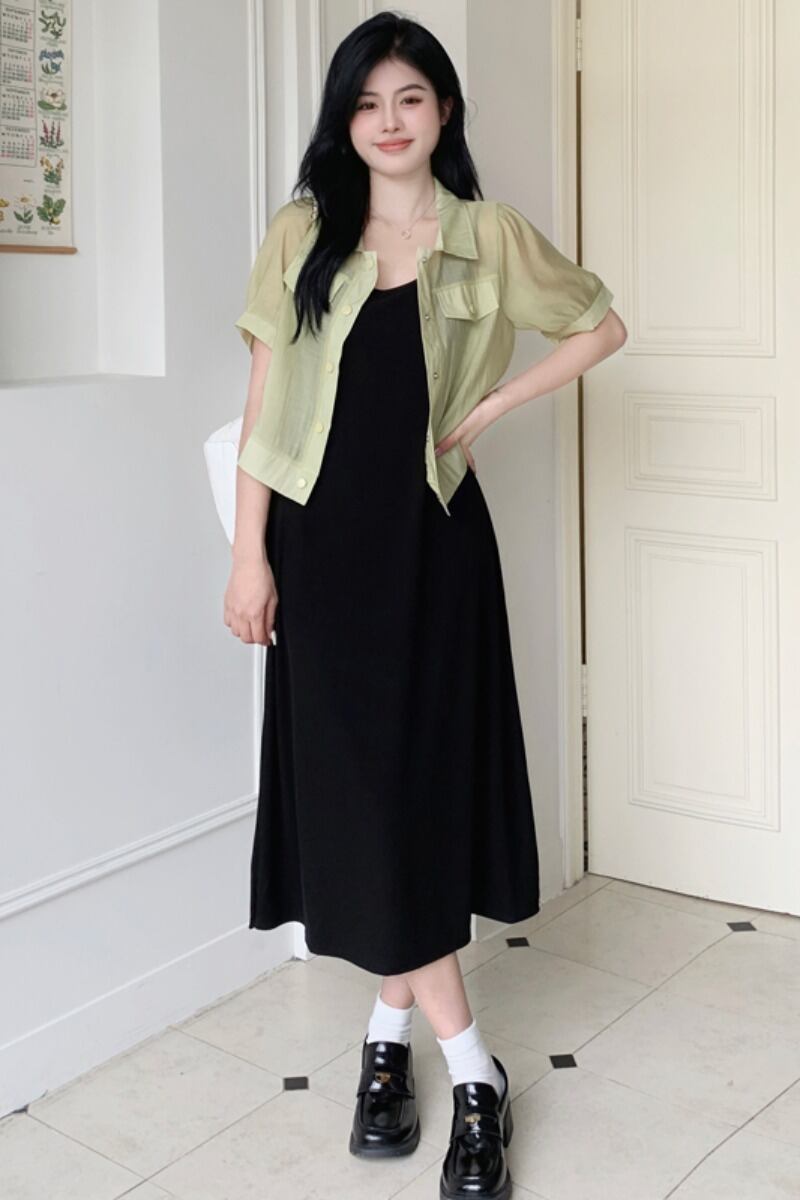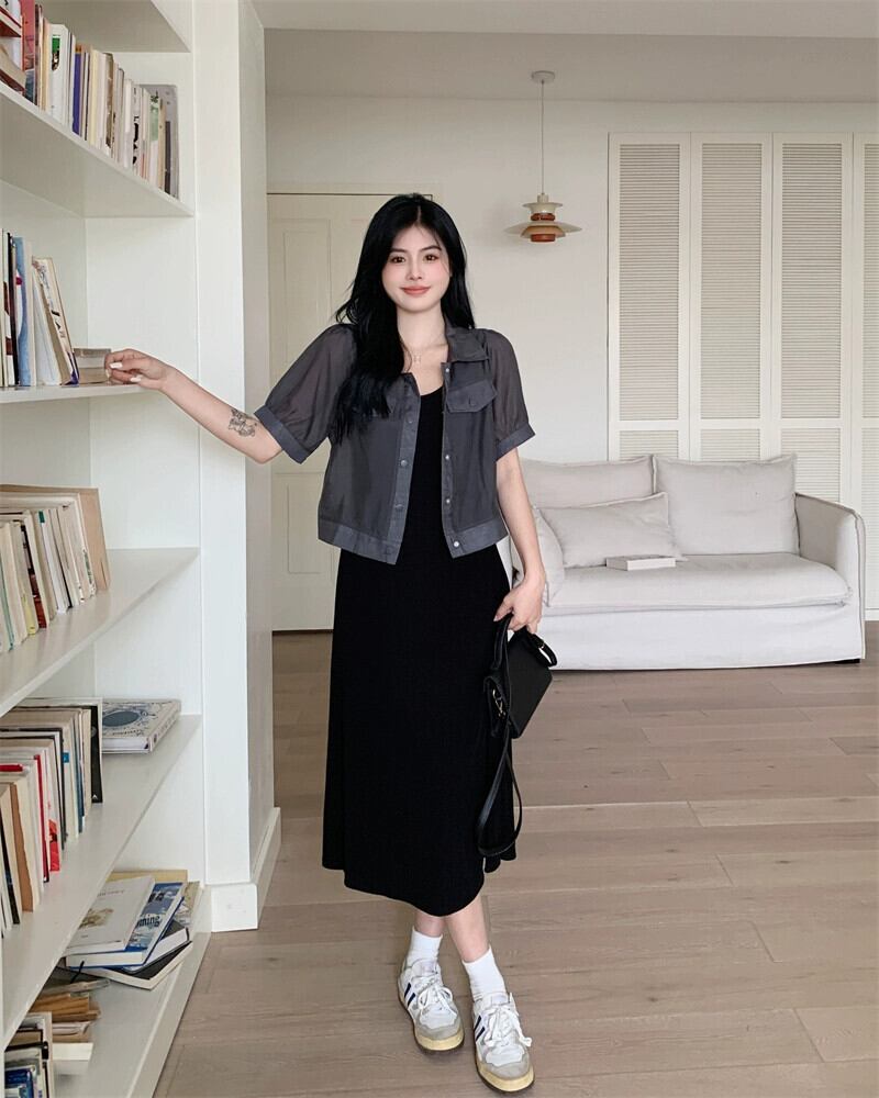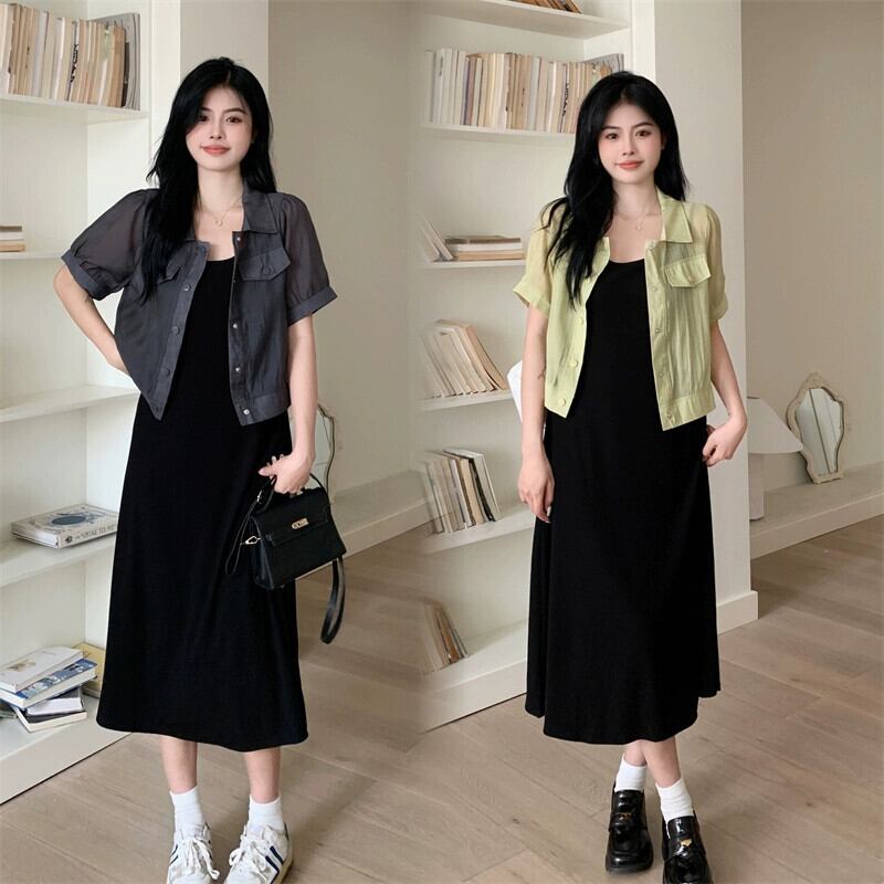 プラスサイズの婦人服 2023 夏ドレスファットシスターシックニッチカーディガントップフレンチカジュアルサスペンダースカート 2 点セット 大きめサイズ サマー 夏物 8884170674419758