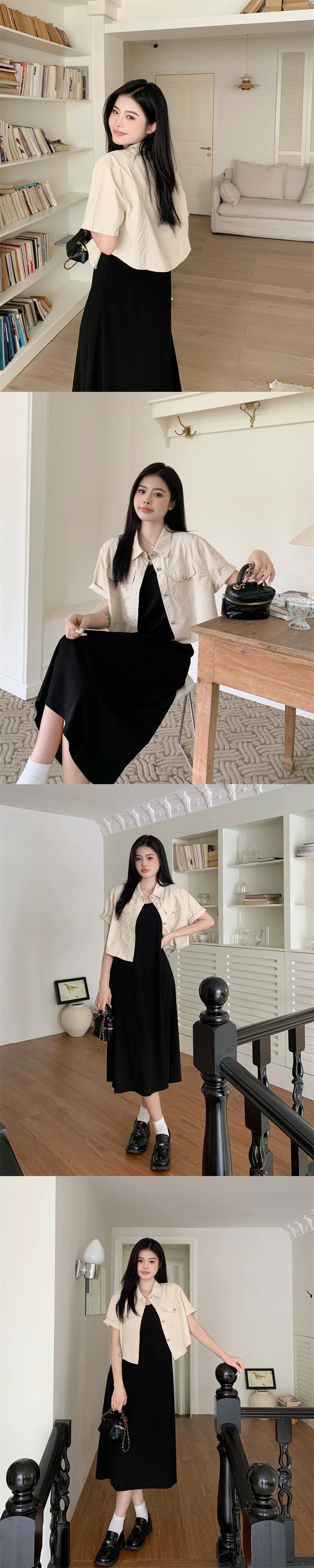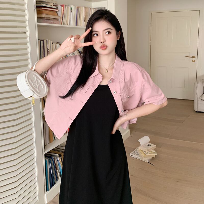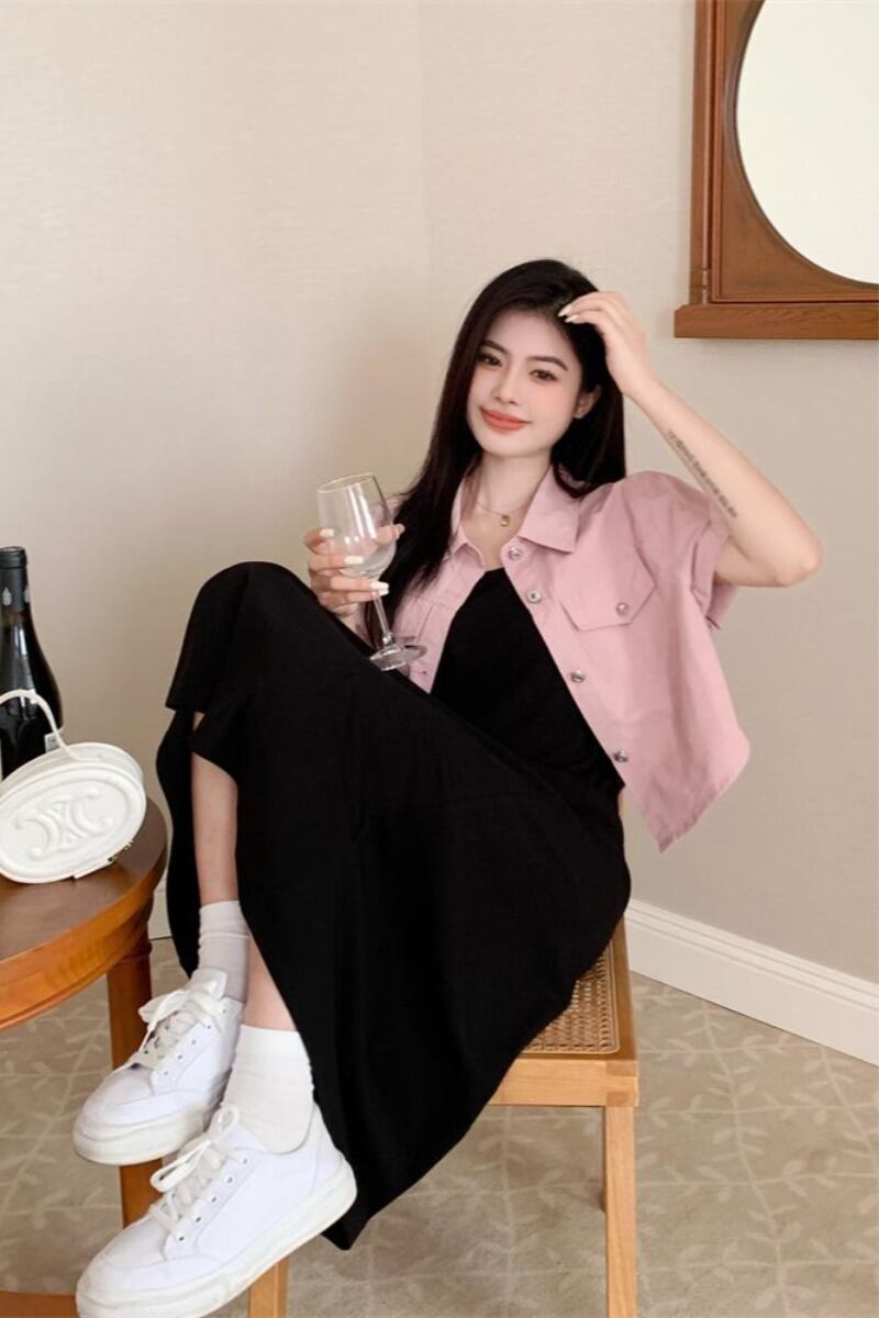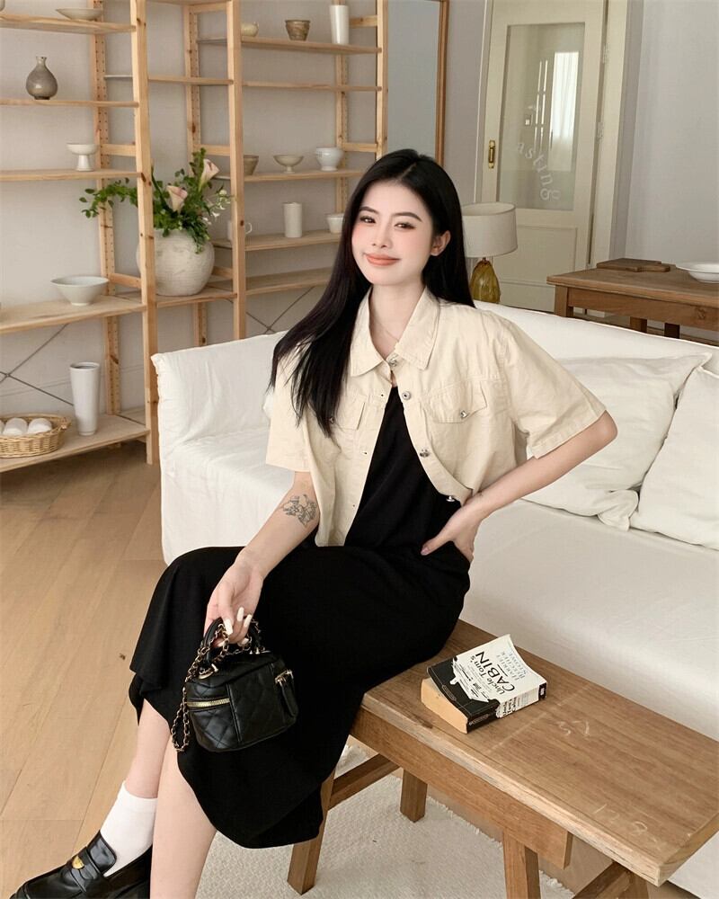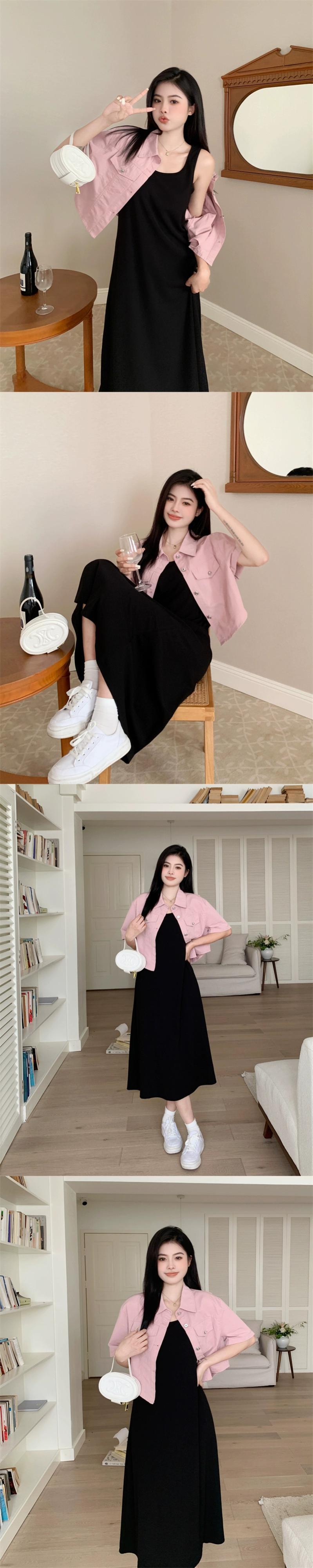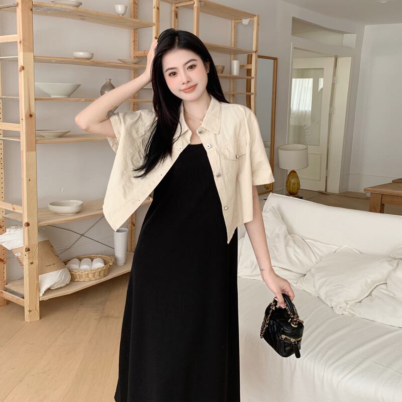 プラスサイズの婦人服 2023 夏服ファットシスターデザインルーズトップス年齢を軽減する無地サスペンダードレス 2 点セット 大きめサイズ サマー 夏物 ソリッドカラー 8884195233362597
