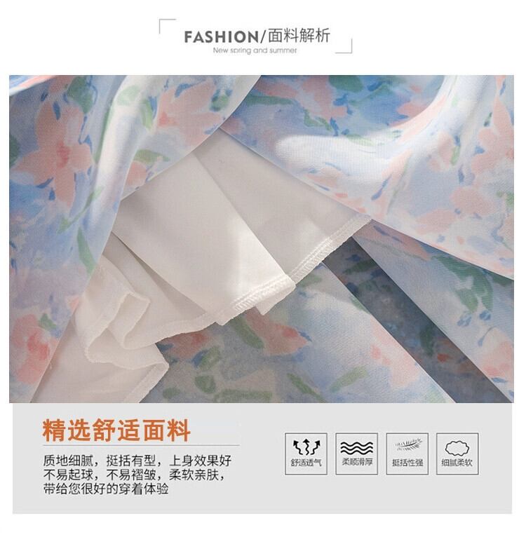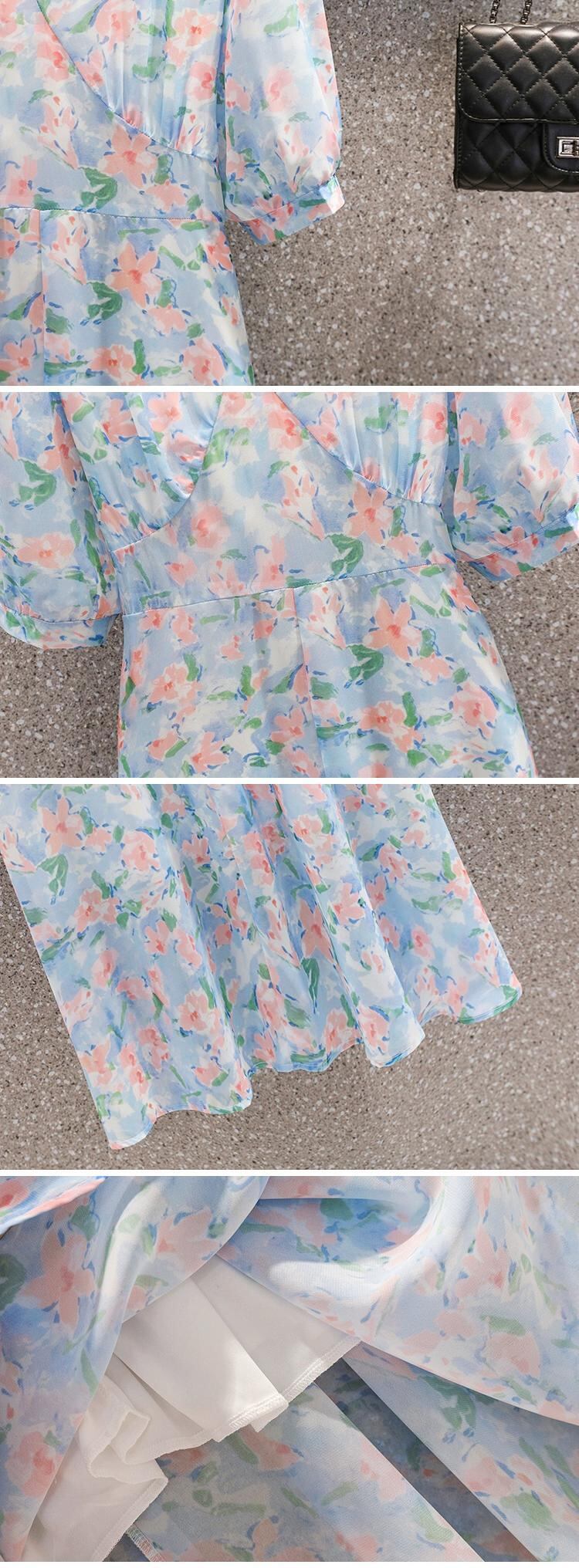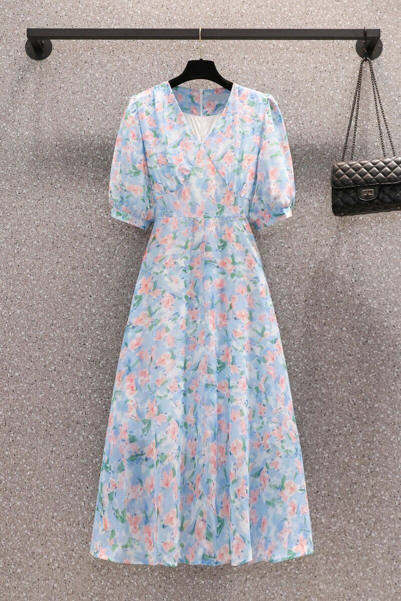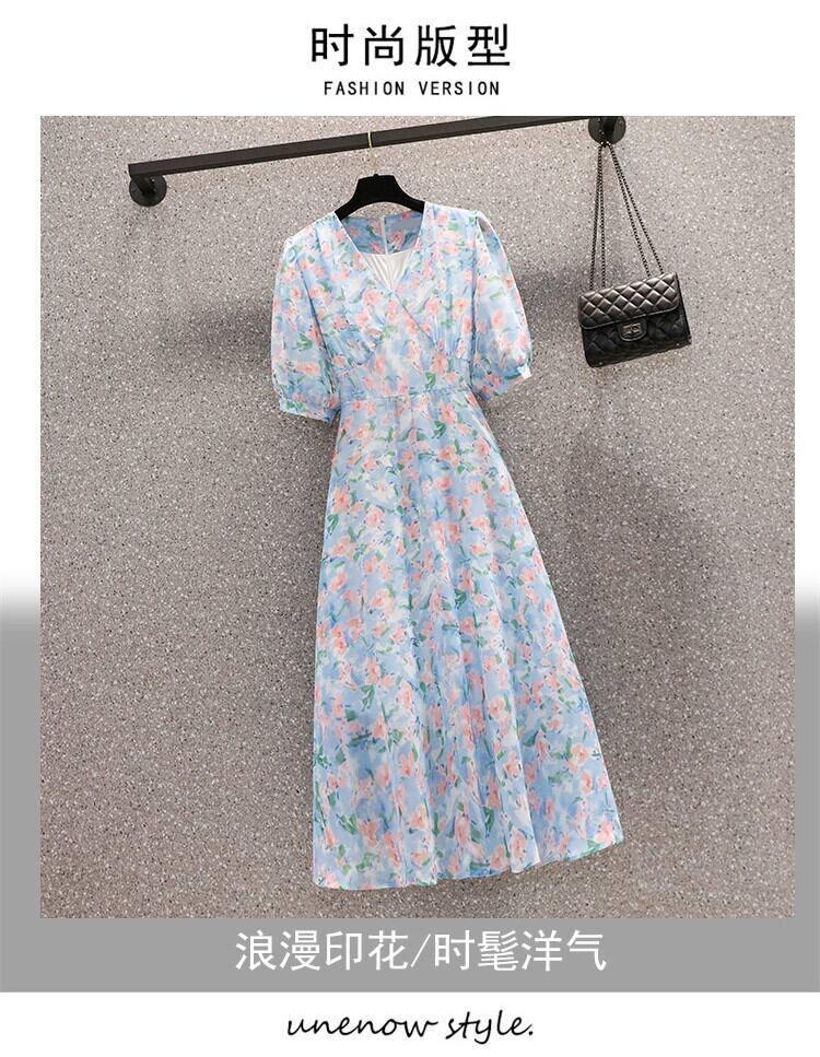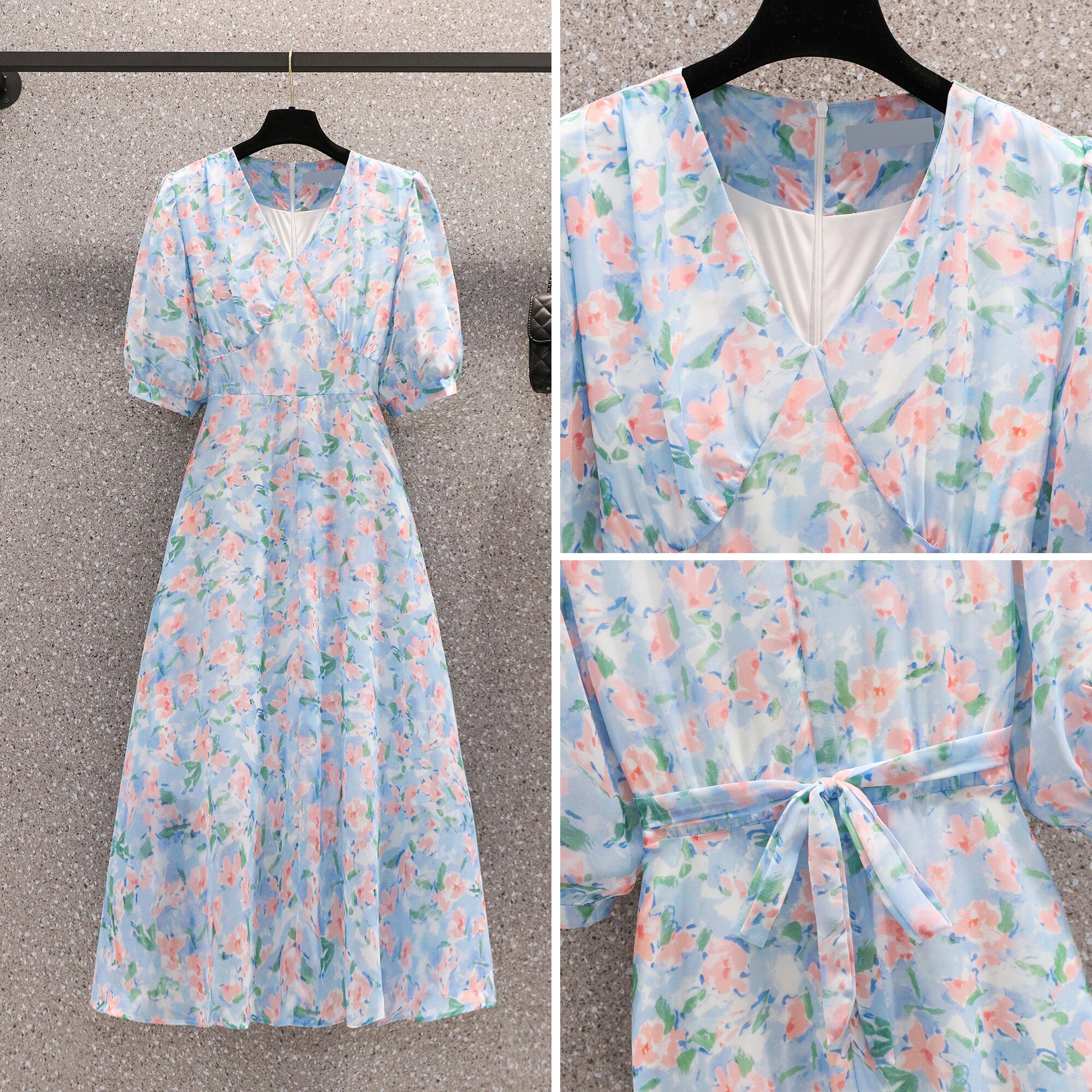プラスサイズの女性の脂肪姉妹夏フランス年齢軽減薄い花柄ドレスロングスカートシフォンドレスブルー腹カバースカート 大きめサイズ サマー 夏物 8884147359100833