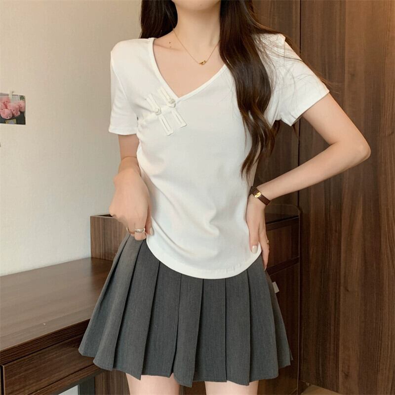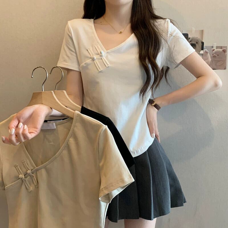 プラスサイズの婦人服 2023 夏服ファットシスターズ新しい中国風バックル斜め V ネック不規則な薄い半袖 T シャツトップ 大きめサイズ サマー 夏物 Vネック Tシャツ 8884160102299485