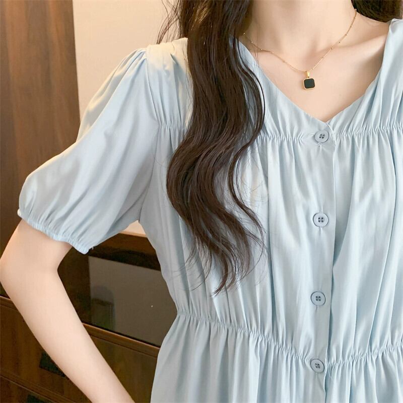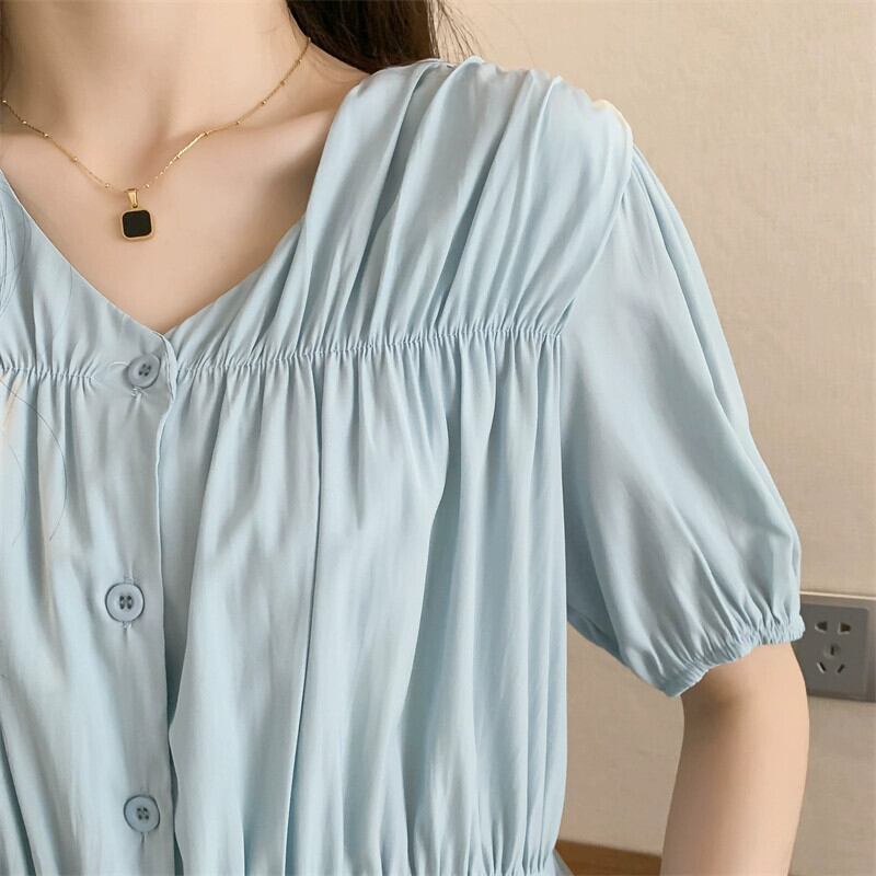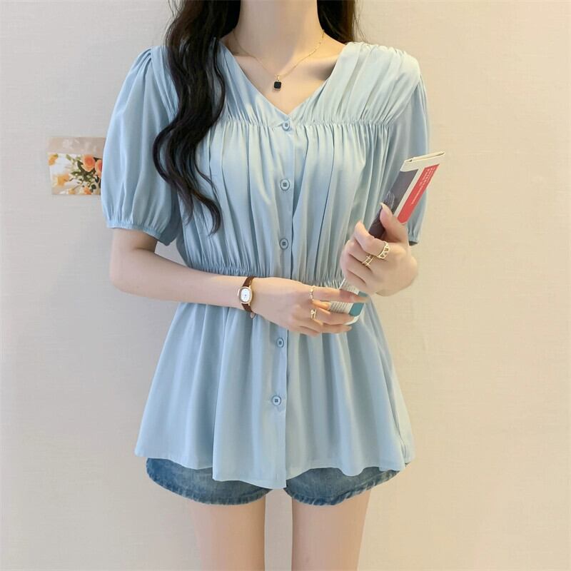 プラスサイズの婦人服 2023 夏服ファットシスター eign スタイルプリーツ V ネックトップス年齢を軽減し、お腹をカバーするデザインのニッチ シャツ 大きめサイズ サマー 夏物 Vネック 8884165186474675