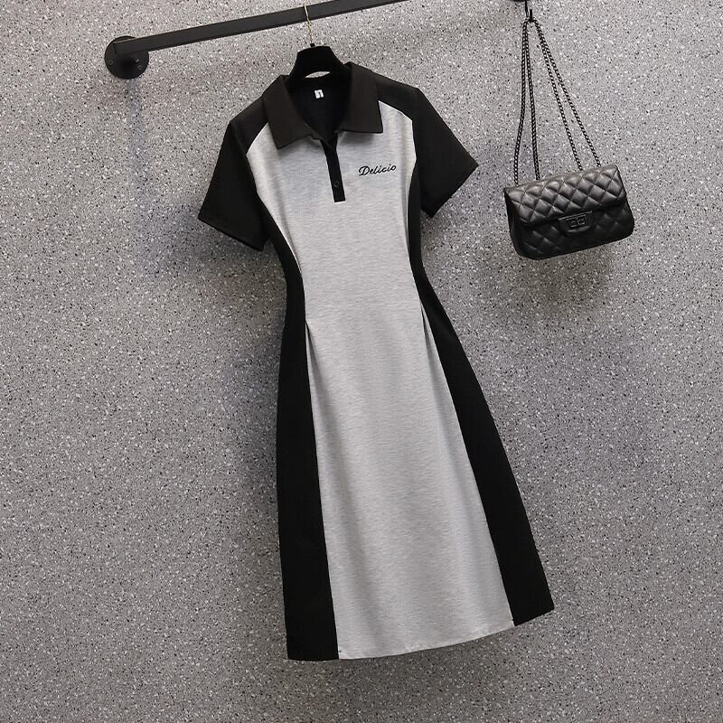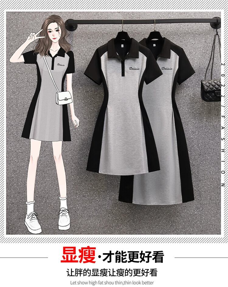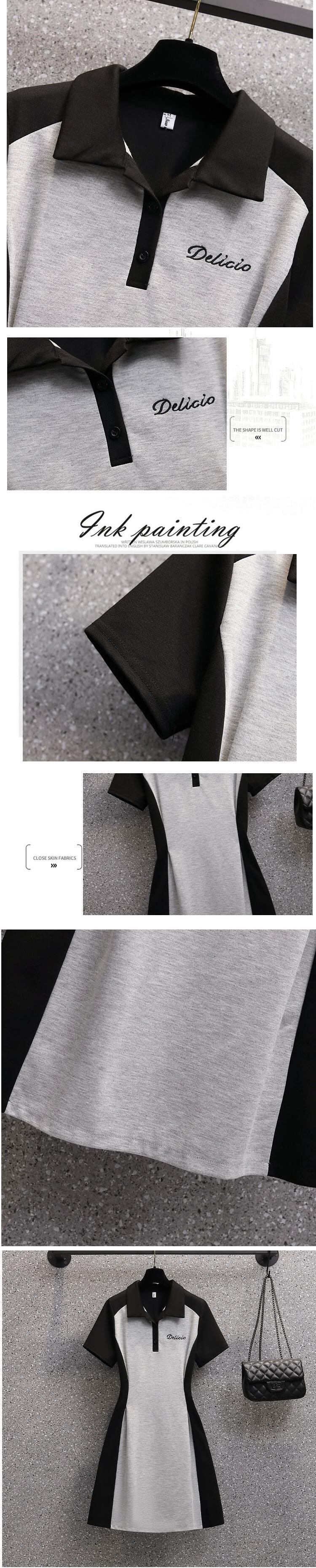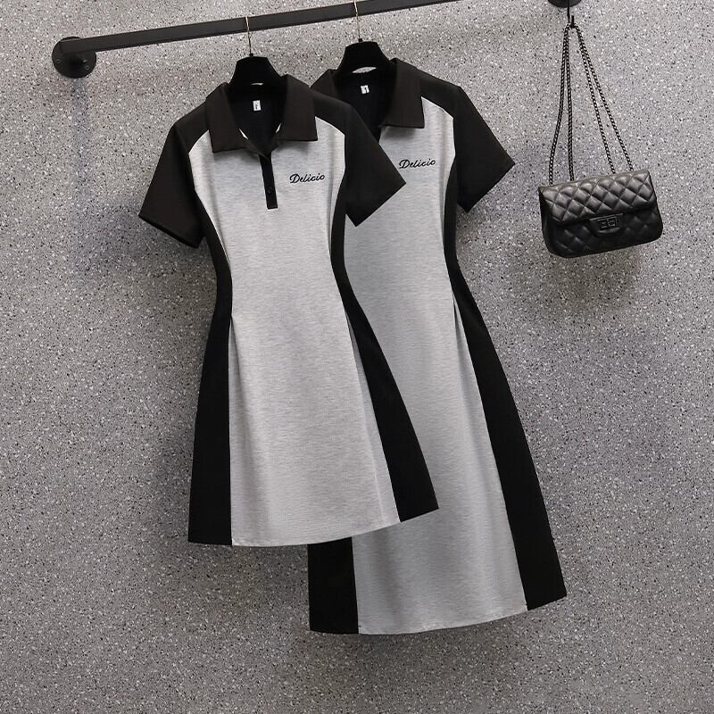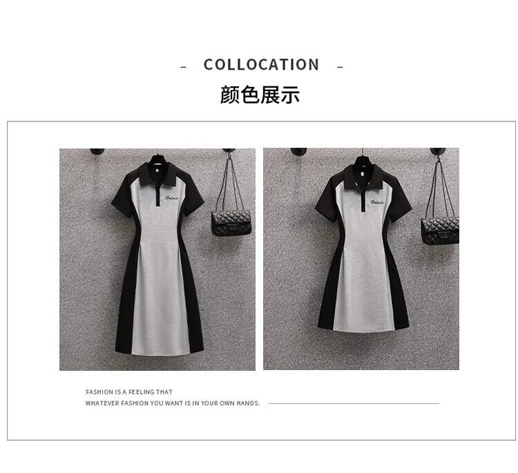 プラスサイズの婦人服 2023 ファットシスター夏新デザインセンス A ラインスカート痩身コントラストカラーポロ襟刺繍ドレス 大きめサイズ サマー 夏物 Aライン 88841645098031