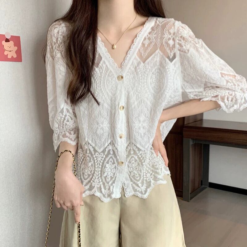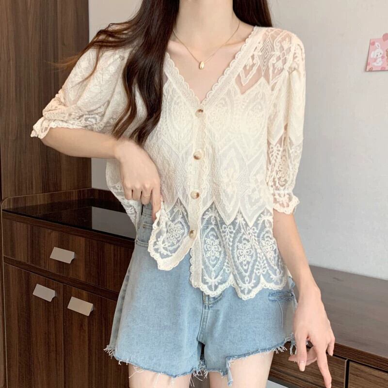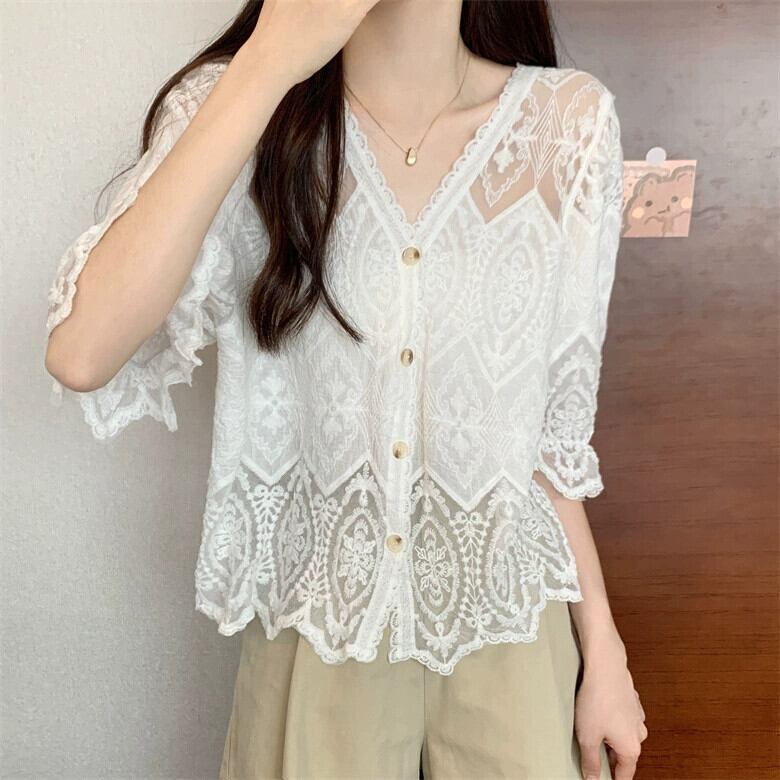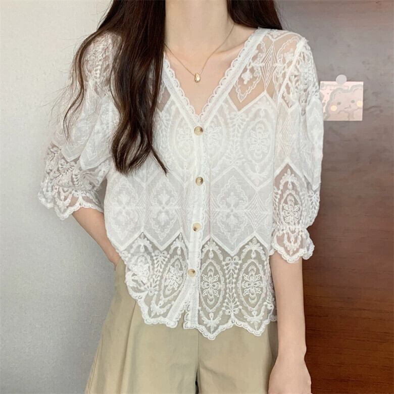 プラスサイズの婦人服 2023 夏服脂肪姉妹カジュアル気質フック花刺繍 V ネックシャツレースパフスリーブトップ 大きめサイズ サマー 夏物 Vネック フラワーデザイン 8884191551450606
