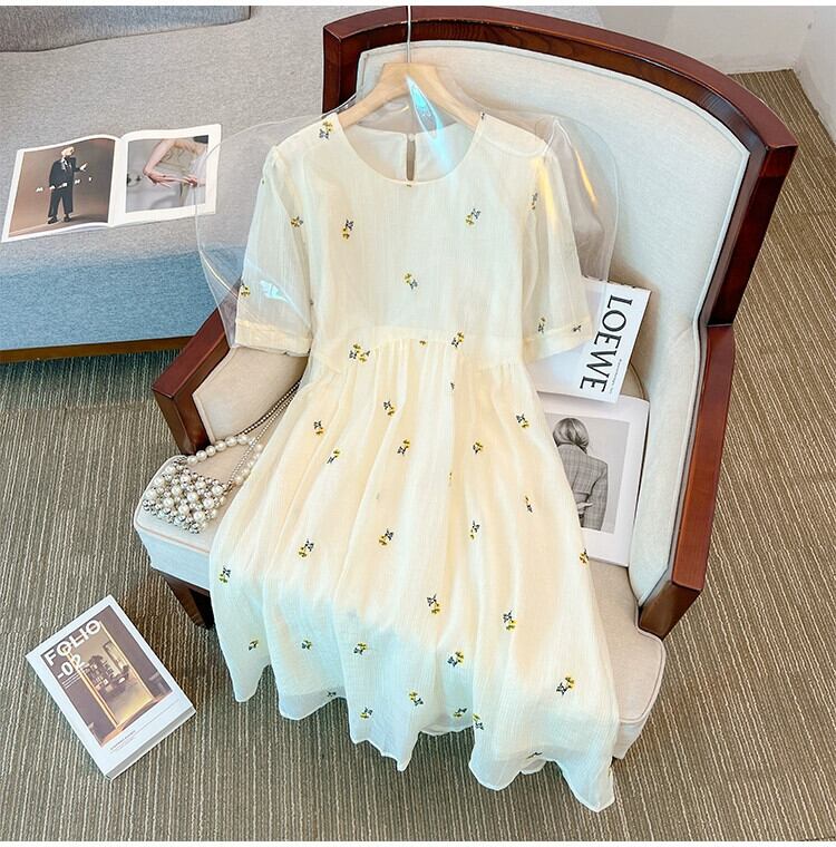 プラスサイズの婦人服 2023 流行の夏の新しいファットシスターファッションラウンドネックスカート高品質パフスリーブ刺繍ドレス 大きめサイズ サマー 夏物 Oネック 8884136031677103