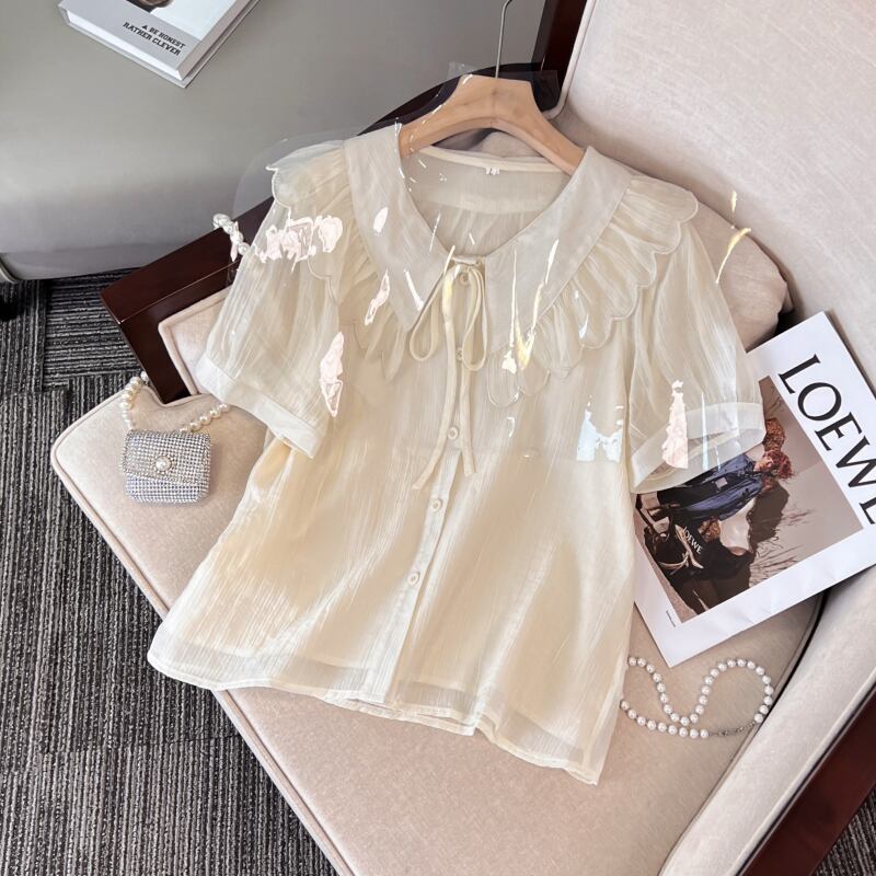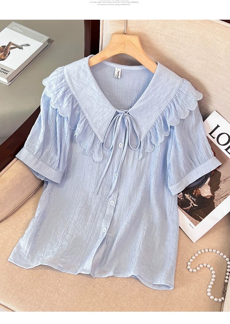 プラスサイズの婦人服トレンディな夏のファットシスターフリルドールカラーシフォンシャツは薄くて年齢を軽減するオールマッチトップファットMMシャツに見えます 大きめサイズ サマー 夏物 8884195840160465