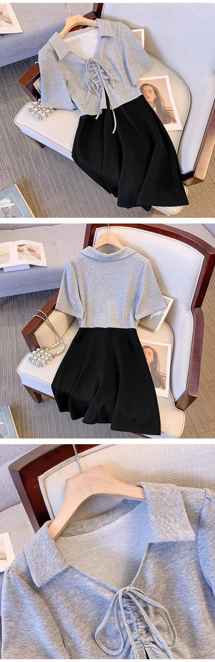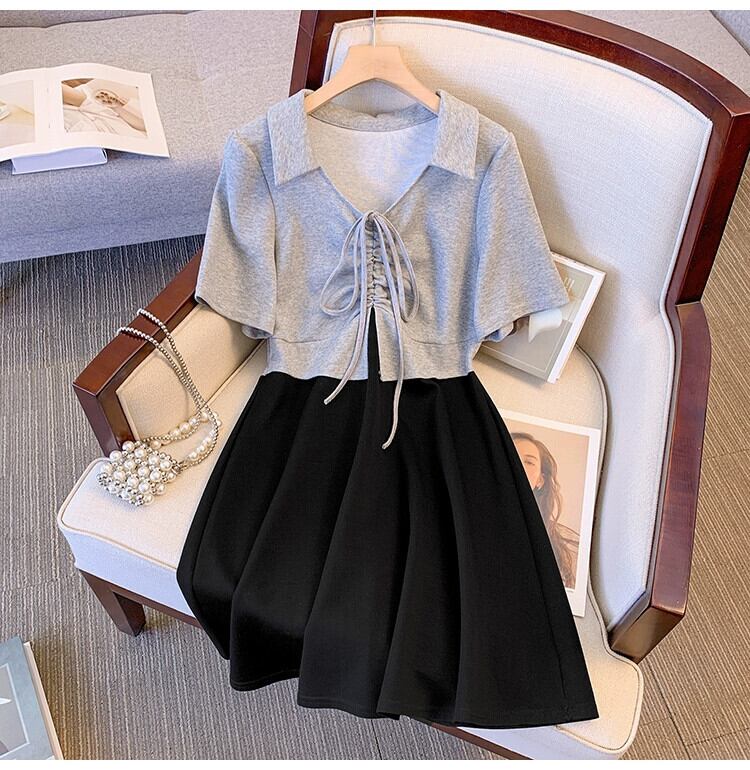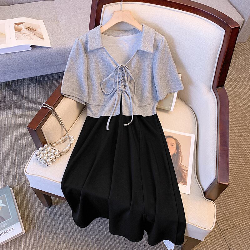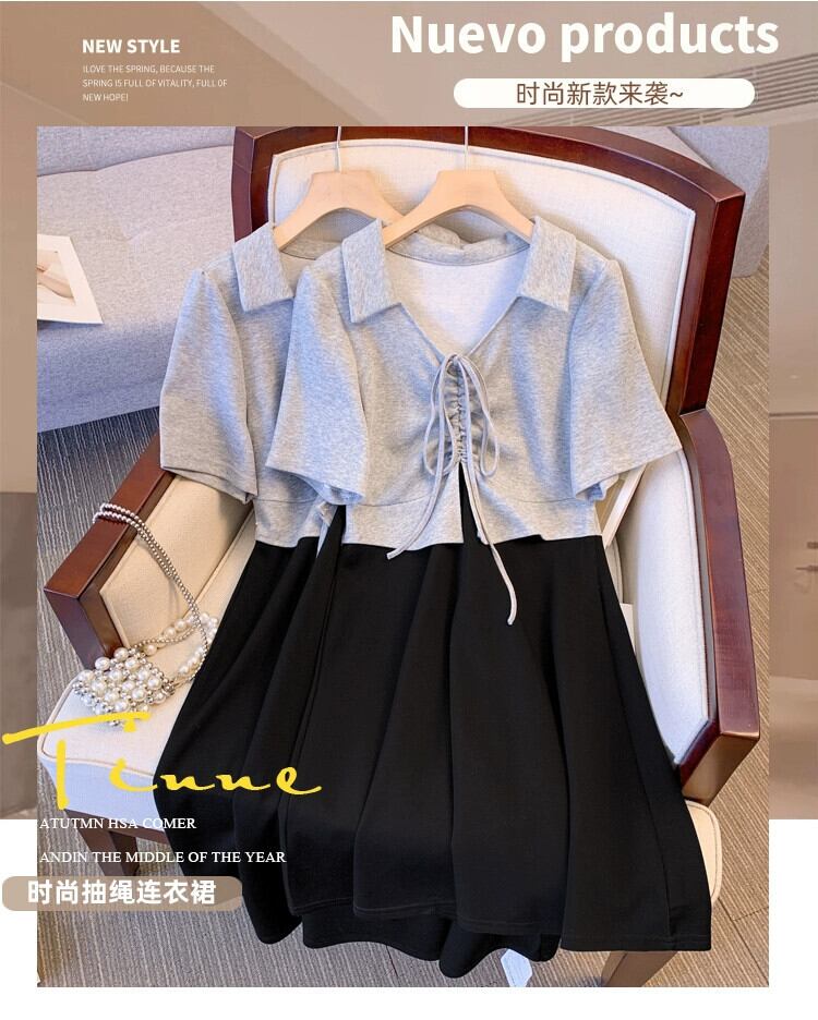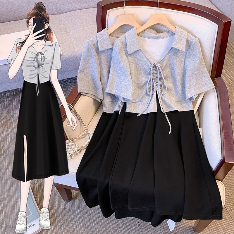 プラスサイズの婦人服 2023 トレンディな夏の新しいファットシスターフェイクツーピースコントラストカラードレスポロカラースリットスリムスカート 大きめサイズ サマー 夏物 8884138828382372