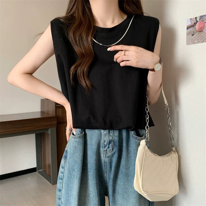 大きいサイズの婦人服 2023 ファットシスター夏新バージョンルーズラウンドネック肩パッド通勤カジュアルノースリーブベストトップ 大きめサイズ サマー 夏物 Oネック 8884195965797031