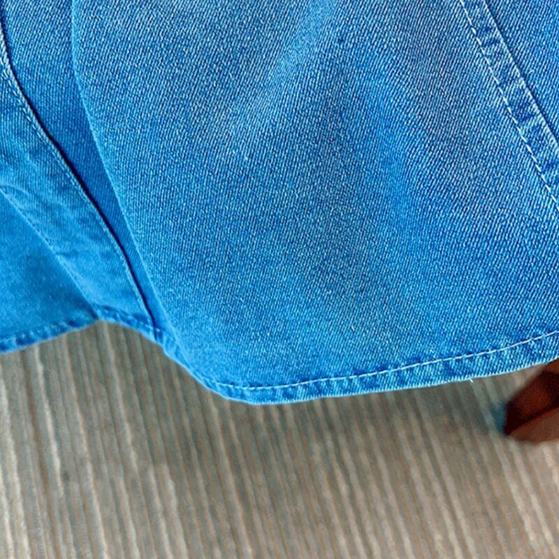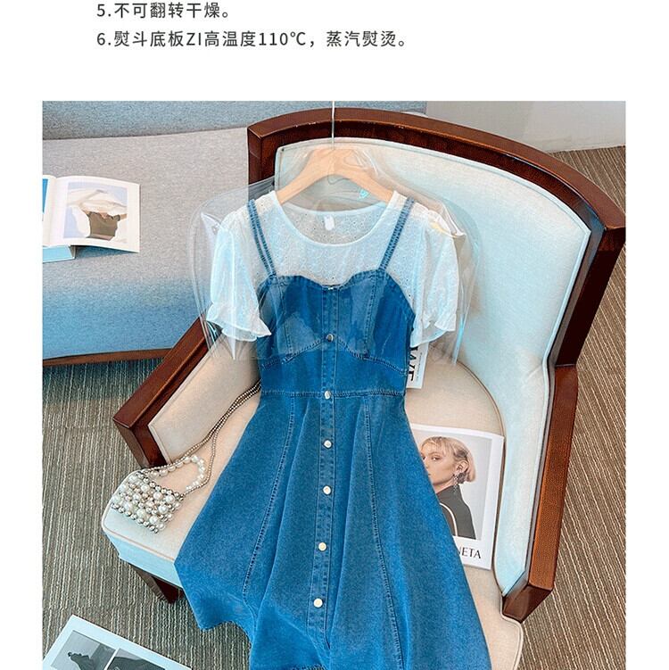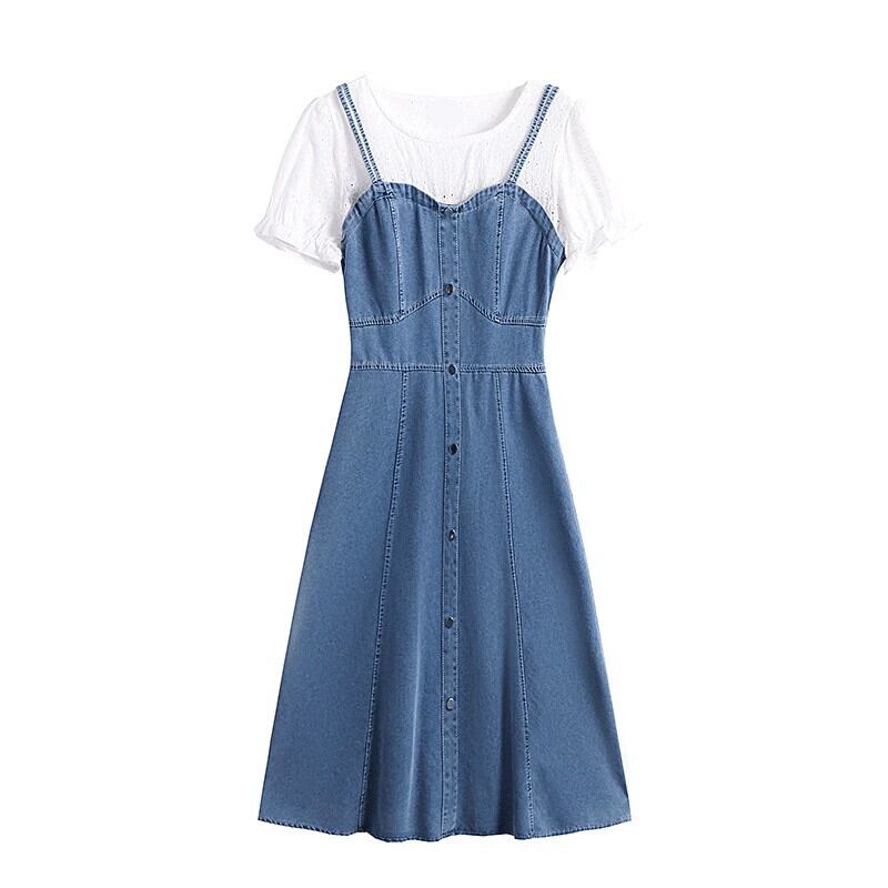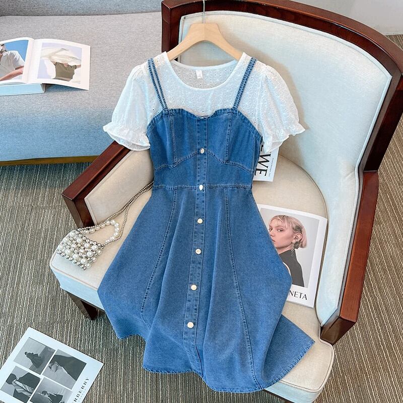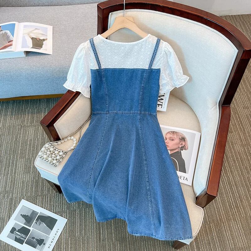 プラスサイズの婦人服 2023 夏脂肪姉妹 eign スタイル年齢削減スプライシング偽ツーピース A ラインスカートデザインデニムドレス 大きめサイズ サマー 夏物 Aライン 8884153960037732