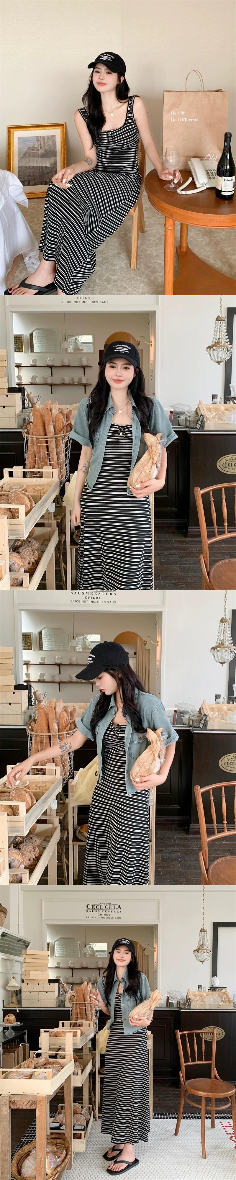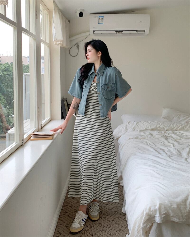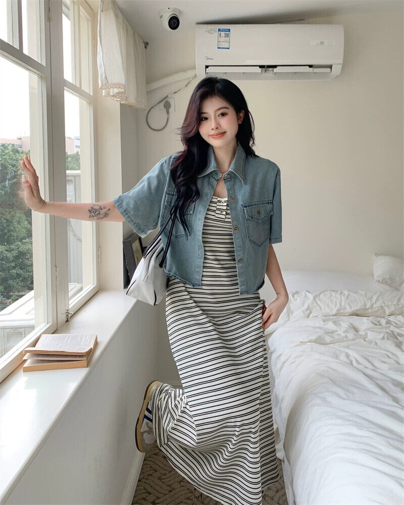プラスサイズの女性の 2023 サマードレスファットガールセンスデニムシャツスリムスリングドレス 2 点セット 大きめサイズ 夏物 8884126099926575