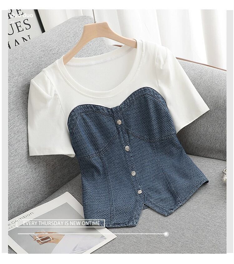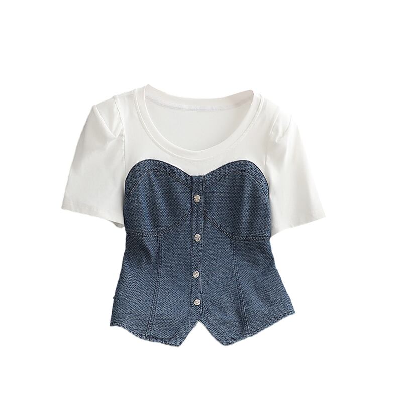 プラスサイズの婦人服 2023 脂肪姉妹夏の新しい気質ショルダーパッドステッチデニムデザインチューブトップ Tシャツトップ 大きめサイズ サマー 夏物 888414137054858