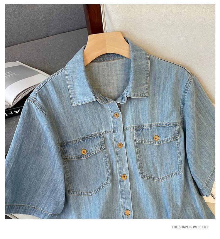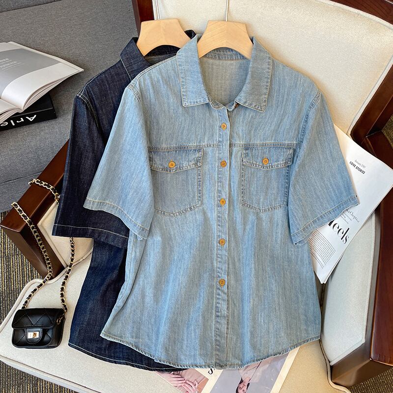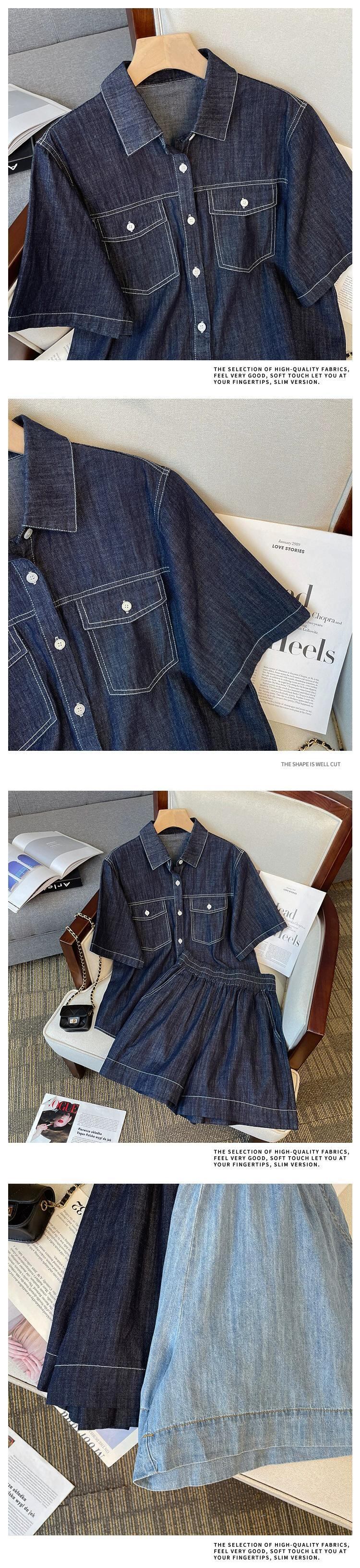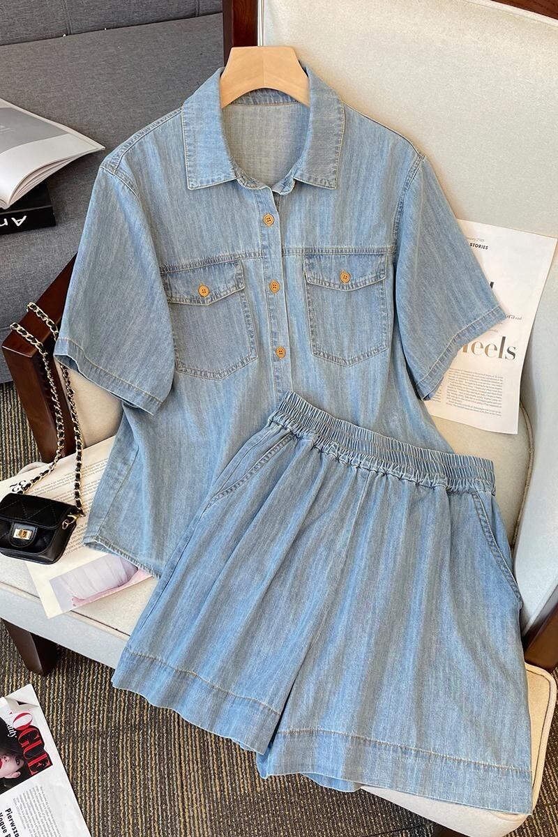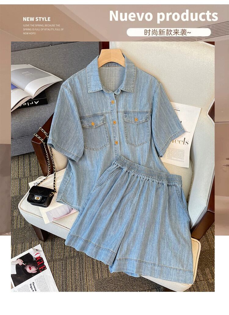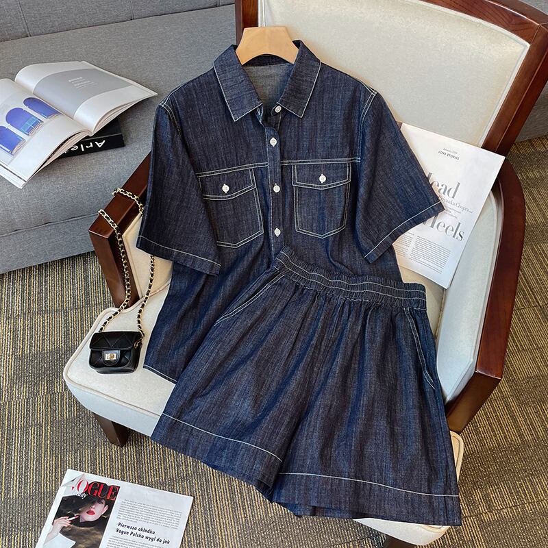 プラスサイズの婦人服2023夏服、太った妹が痩せて見える、カジュアルなウエスタンスタイルのデニムトップ、レトロなハイウエストショートパンツ、2点セット 大きめサイズ サマー 夏物 ショーツ ブルマー 8884115228104776