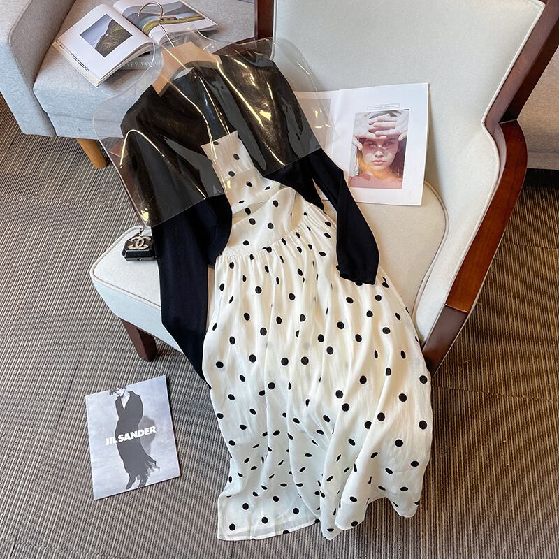 プラスサイズの婦人服 2023 ファットシスター夏新スタイルフランスの気質ウェーブポイント薄いサスペンダースカート日焼け止めカーディガン 2 点セット 大きめサイズ サマー 夏物 8884121030241820