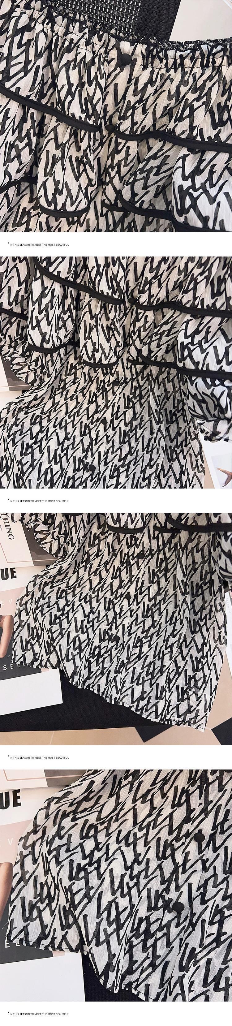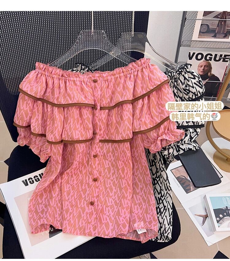 プラスサイズの婦人服 2023 ファットシスター夏の新しいファッション一言襟オフショルダーフリルプリントシャツ半袖シャツ 大きめサイズ サマー 夏物 8884126244344761