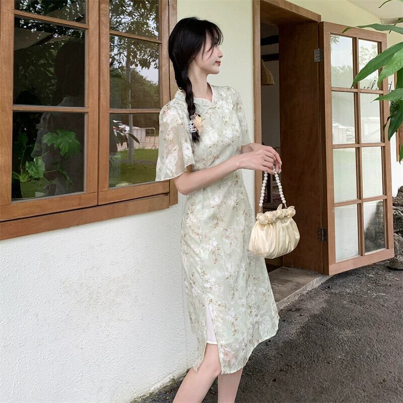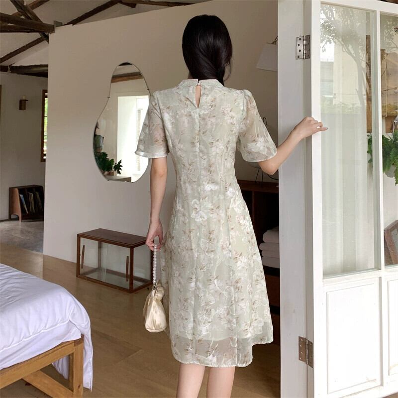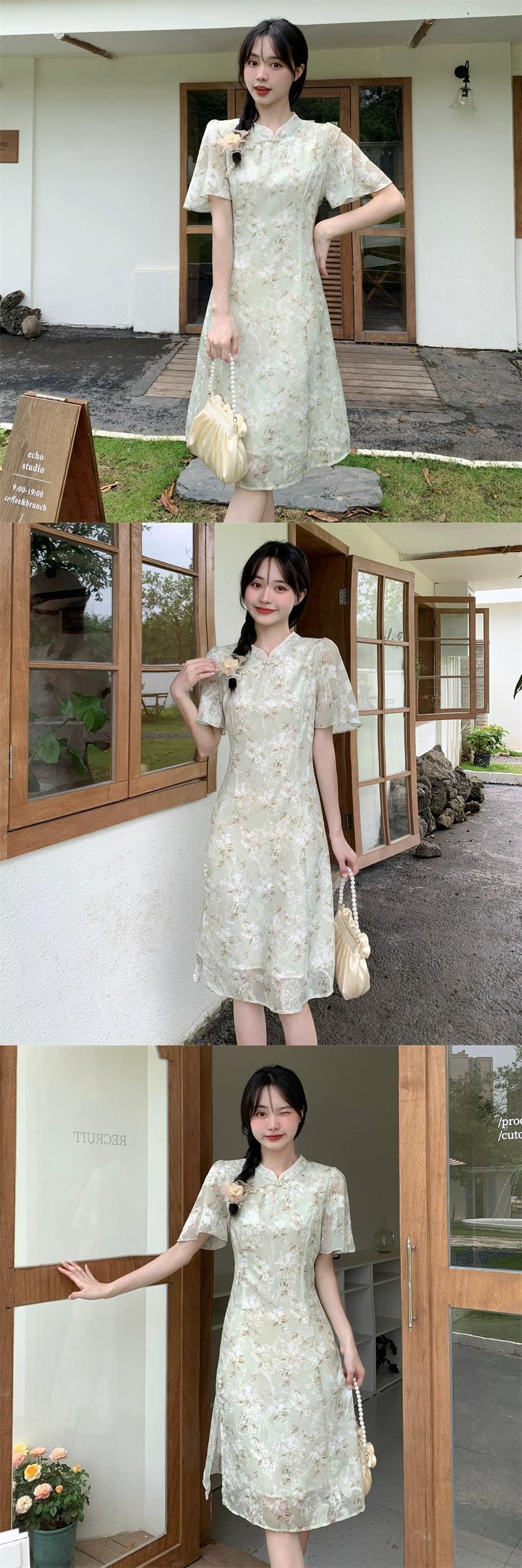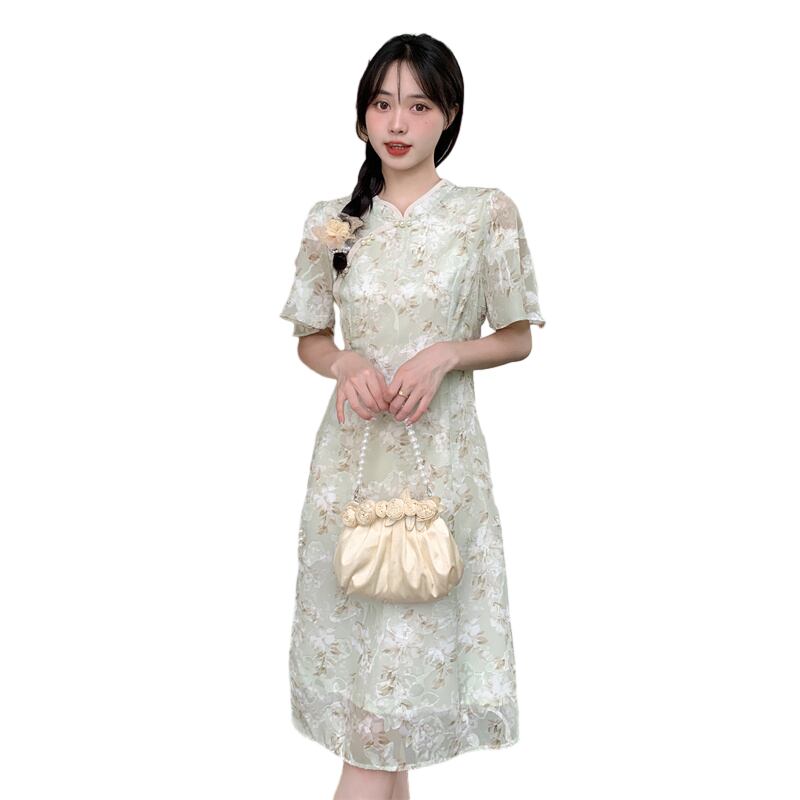 プラスサイズの婦人服 2023 脂肪姉妹夏新レトロ中国風のスタンドカラーチャイナドレススカートスリム半袖プリントドレス 大きめサイズ サマー 夏物 8884195179879730