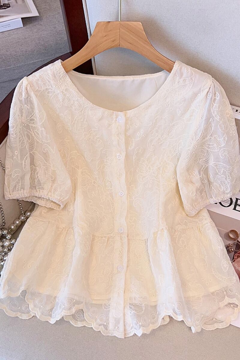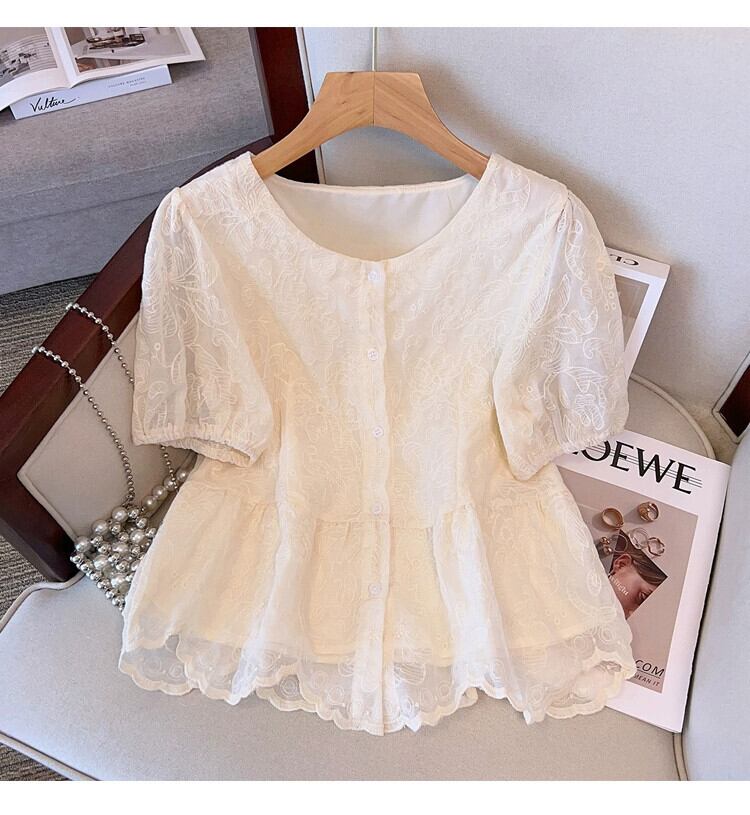 プラスサイズの婦人服 2023 ファットシスター夏の新しい甘いレースの裾優しい風小さなシャツ半袖トップ 大きめサイズ 大人ガーリー スウィート キュート カジュアル サマー 夏物 8884138764085270