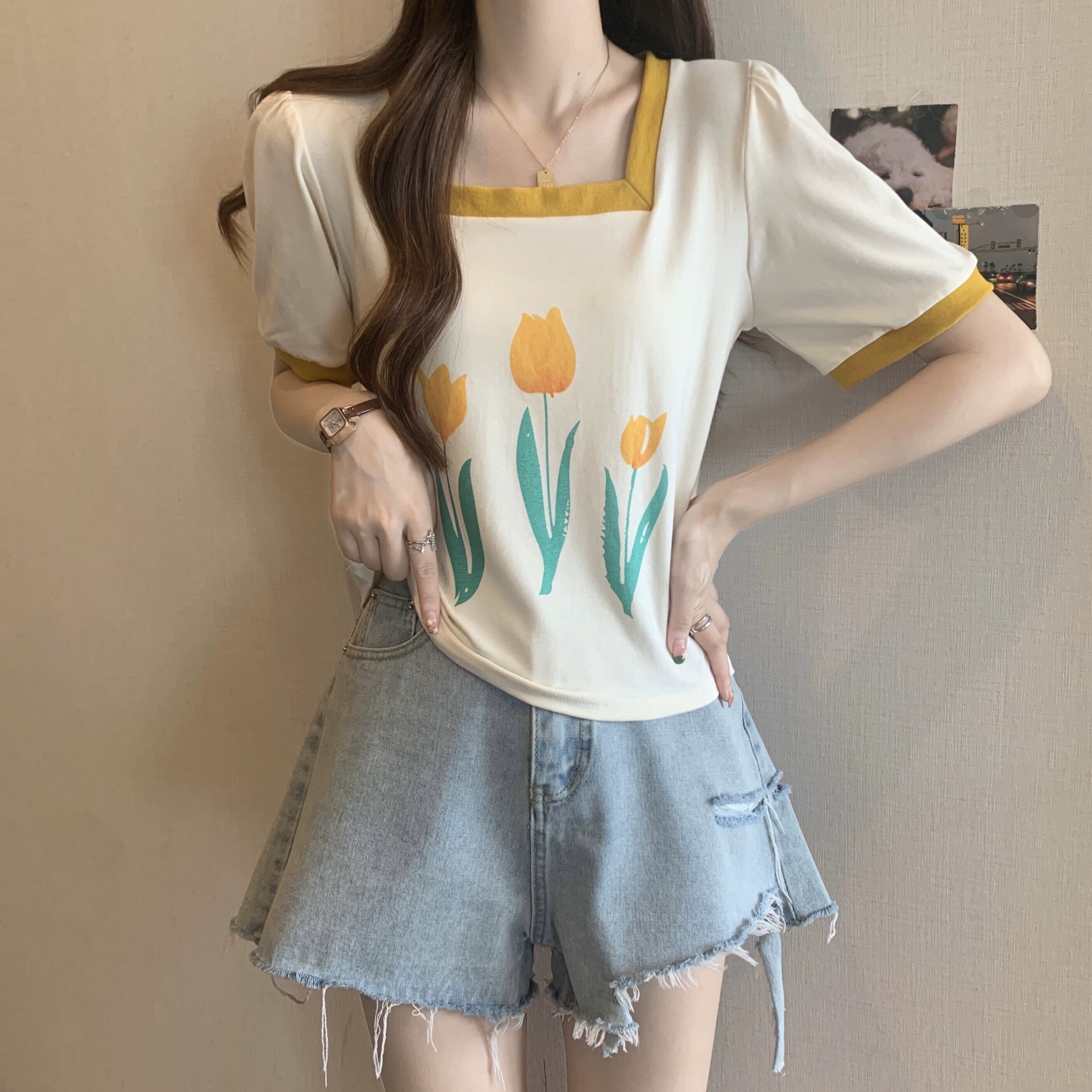プラスサイズの婦人服 2023 ファットシスター夏の新しいニッチデザインスクエアカラー Tシャツレトロな気質半袖トップ 大きめサイズ サマー 夏物 スクウェア 8884178922246966