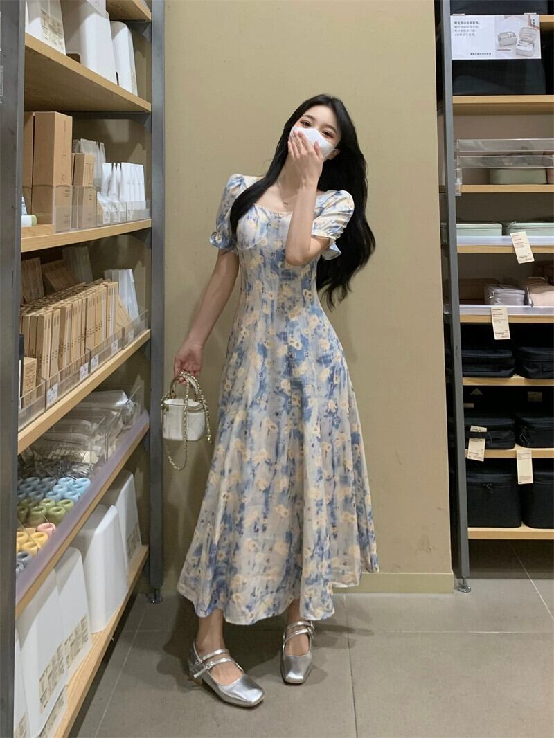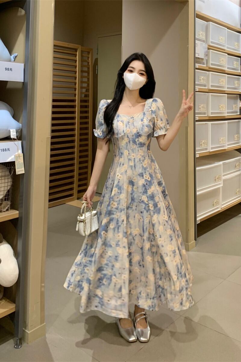 プラスサイズの婦人服 2023 流行の夏の新しいファットシスタースクエアカラー半袖スカートハイエンドニッチオールマッチ花柄ドレス 大きめサイズ サマー 夏物 スクウェア 8884182667360547