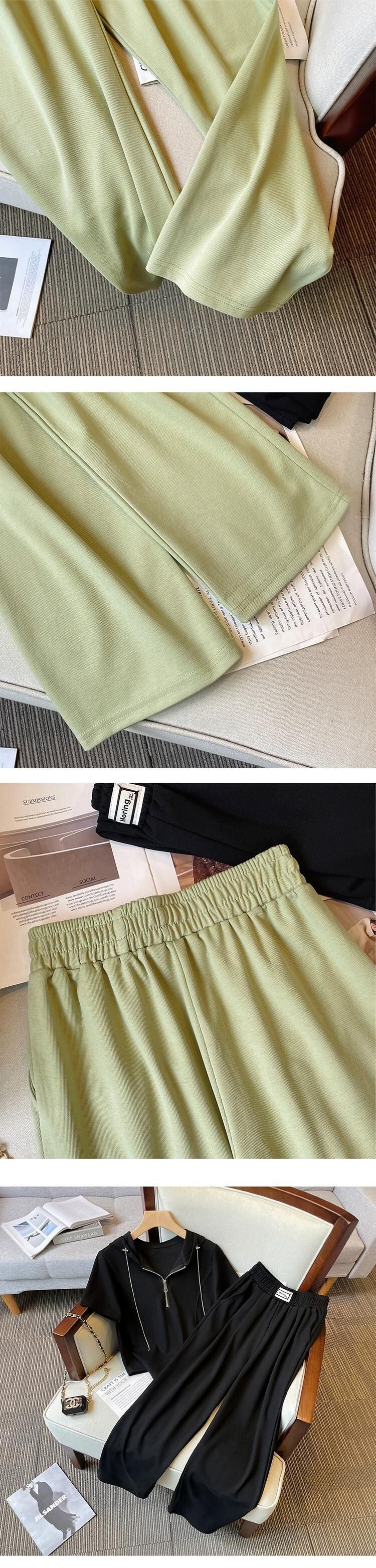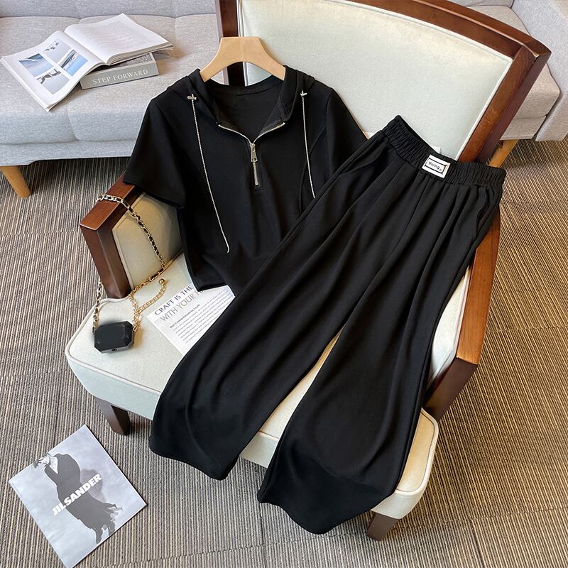 プラスサイズの婦人服 2023 ファットシスター夏の新しいファッションスーツフード付き年齢を減らす薄い T シャツワイドレッグパンツ 2 点セット 大きめサイズ サマー 夏物 Tシャツ 8884111471451331