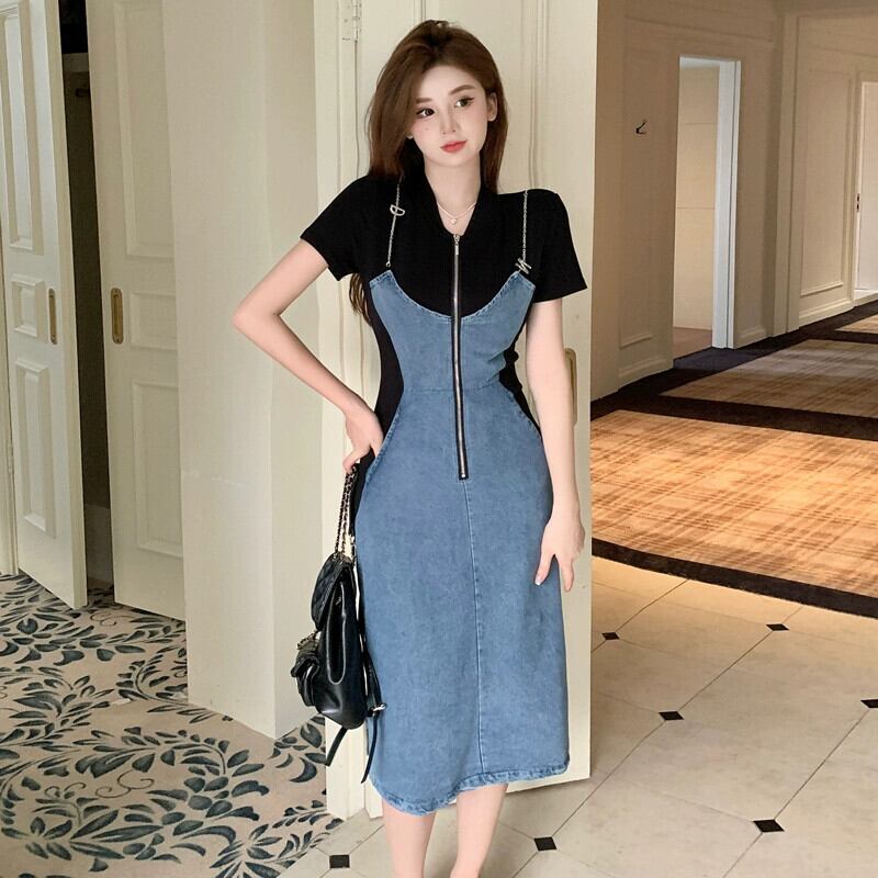 プラスサイズの婦人服 2023 夏服脂肪姉妹気質スプライシングデニム A ラインスカート偽 2 つのシックなニッチドレス 大きめサイズ サマー 夏物 Aライン 8884193848816676