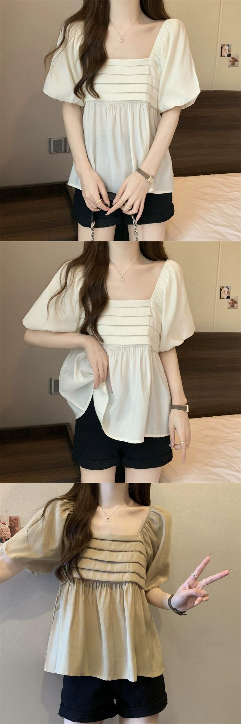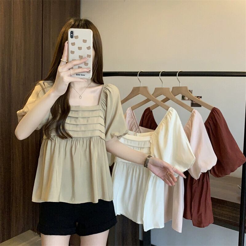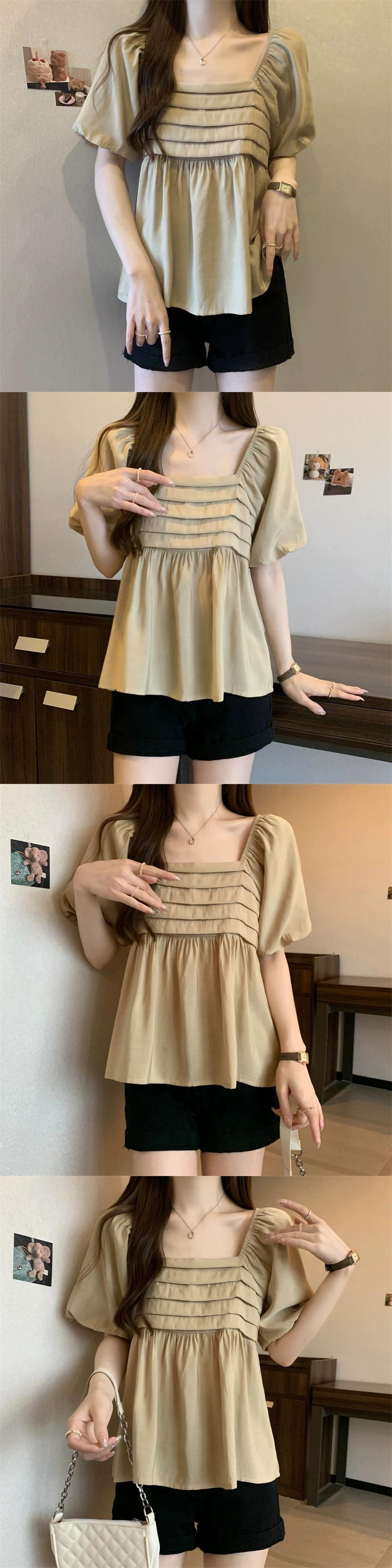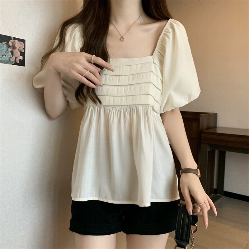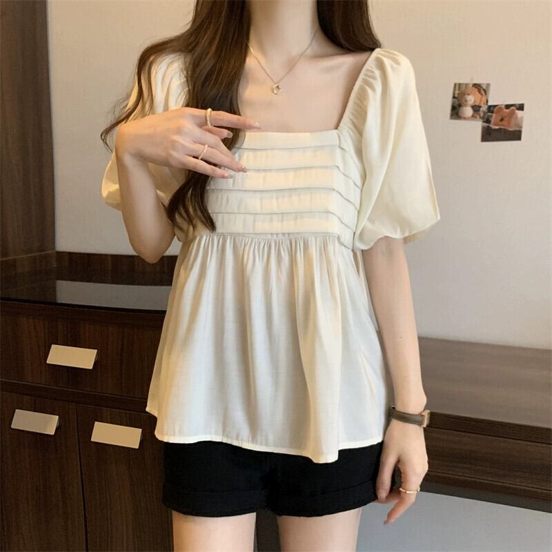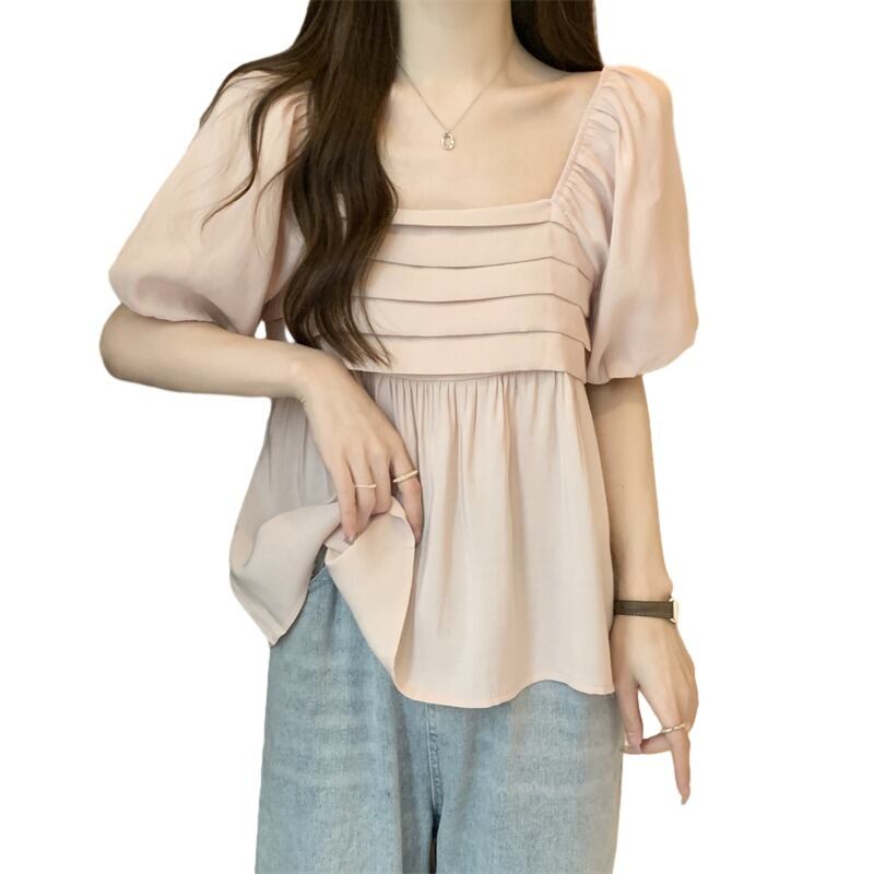 プラスサイズの婦人服 2023 夏服ファットシスターフレンチスタイルプリーツスクエアカラーパフスリーブシフォンシャツ痩身デザイントップ 大きめサイズ サマー 夏物 スクウェア 8884150346967557