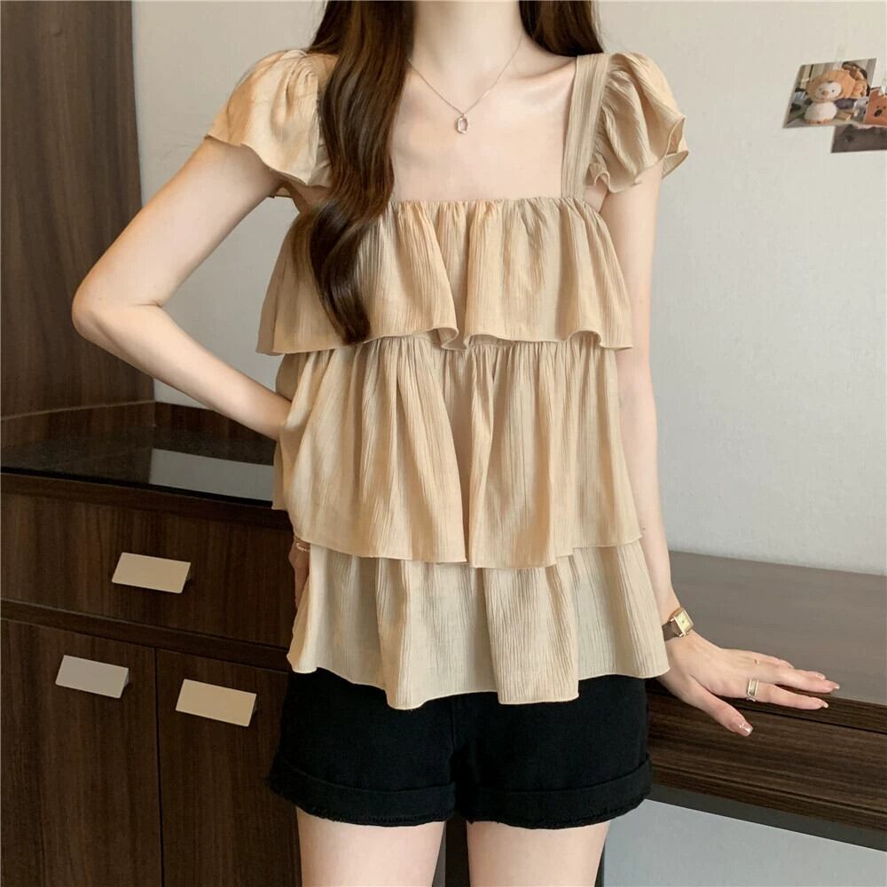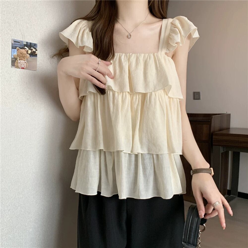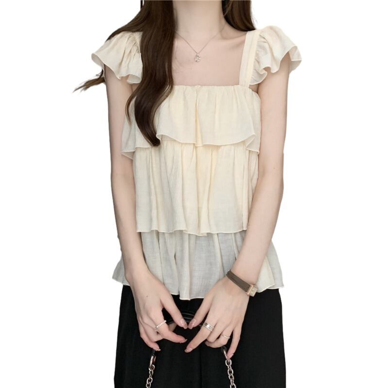 大きいサイズの婦人服 2023 夏服 太ったデザイン感のあるフライングスリーブとサスペンダーでお腹をカバーし、細く見せて着るデザイン感のあるトップス 大きめサイズ サマー 夏物 8884133544422217