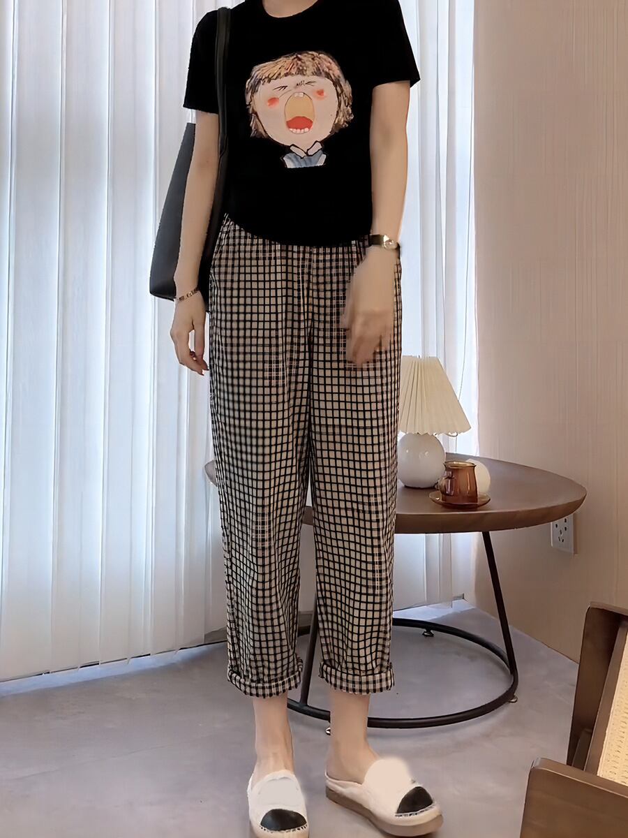 大きいサイズの婦人服、少し太ったお姉さん、2023年夏、ハイウエスト、小さい、梨型の体型、薄いセクション、チェック柄の9点ハーレムパンツ ハイウェスト 大きめサイズ サマー 夏物 8884169911902415