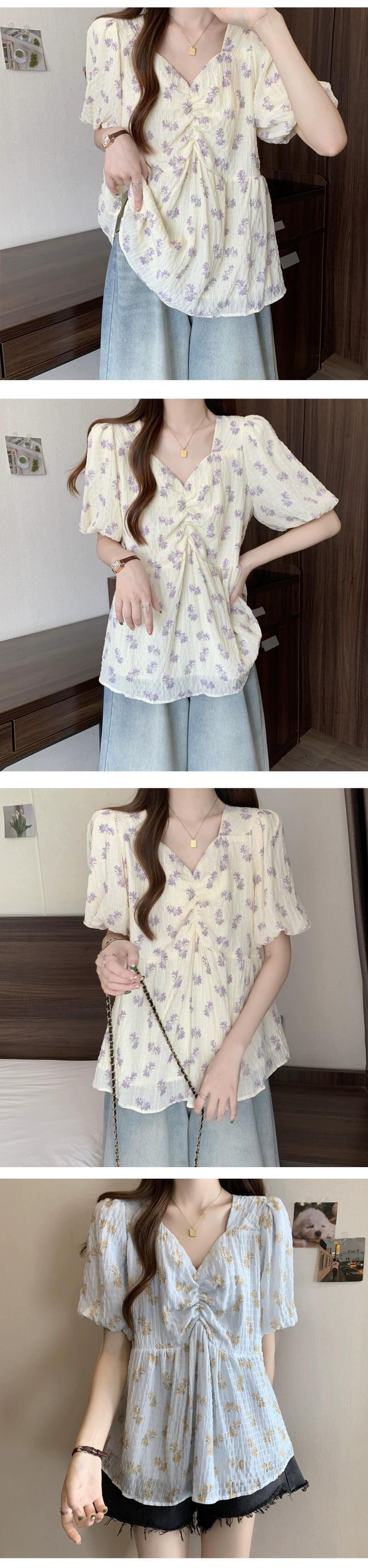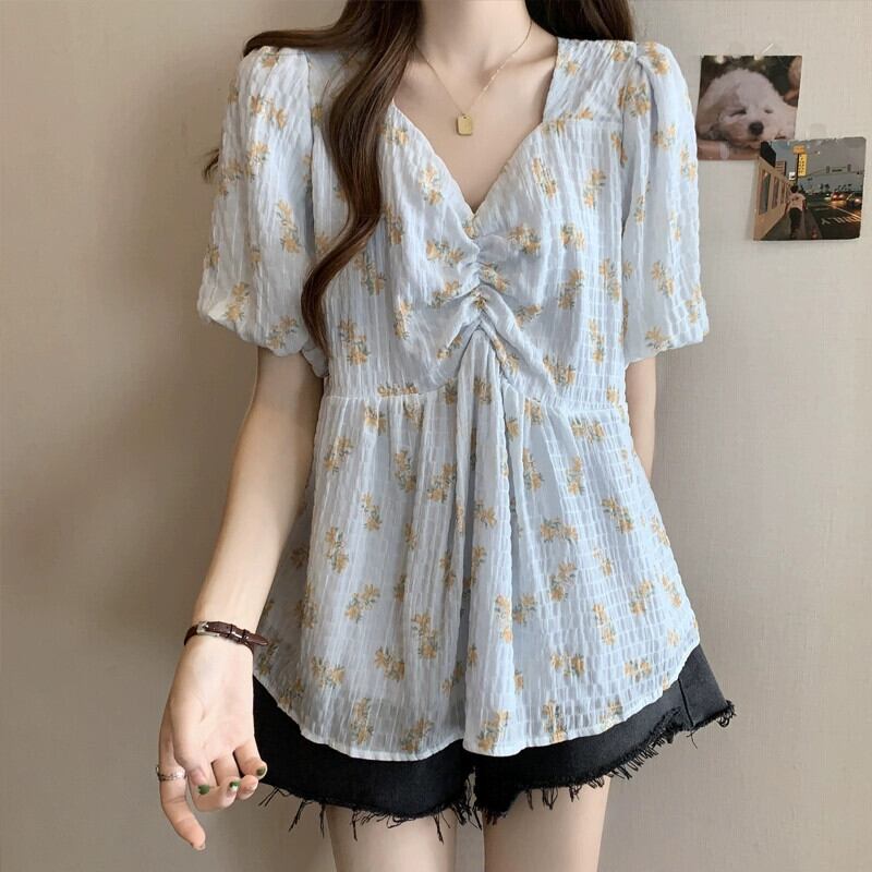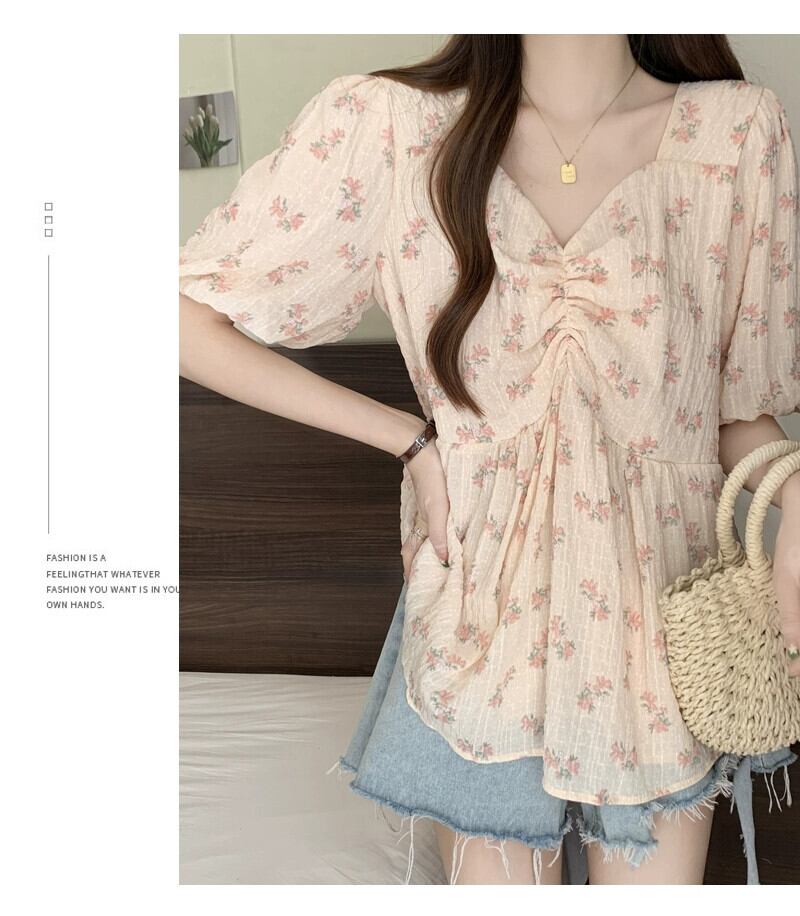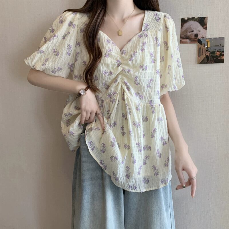 プラスサイズの女性の夏ファットシスターフレンチスクエアカラーパフスリーブシフォン半袖シャツお腹カバールーズ年齢軽減花柄トップス 大きめサイズ サマー 夏物 スクウェア 8884192835520920