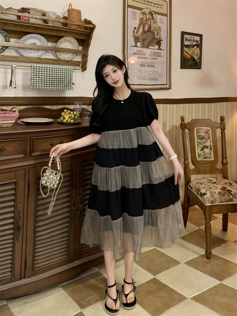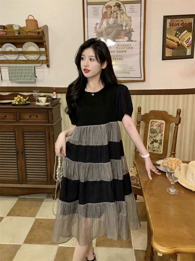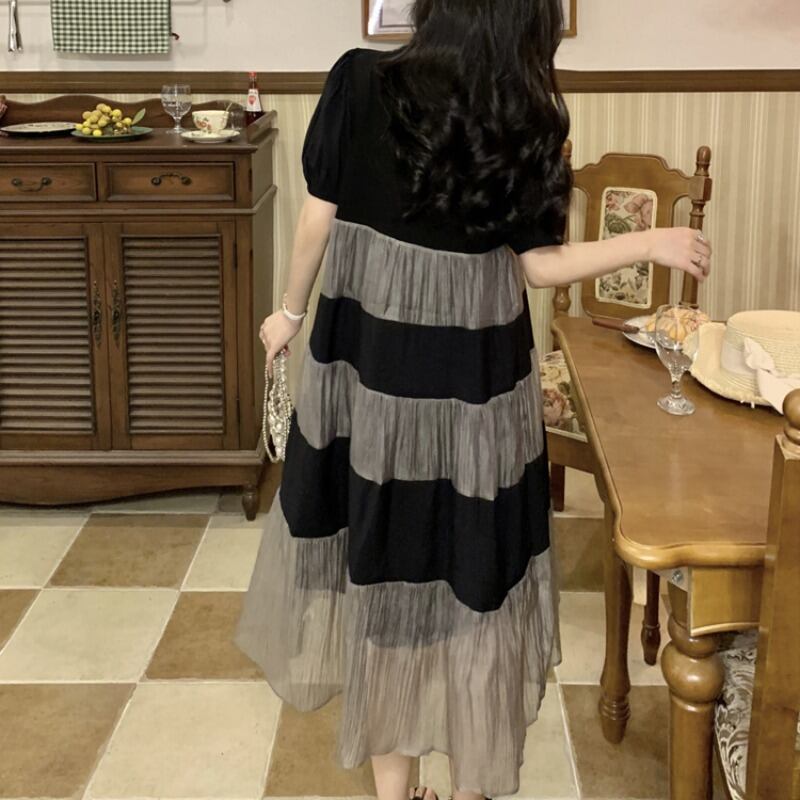 プラスサイズの婦人服 2023 流行の夏の新しい脂肪姉妹ファッションハイエンドモザイクケーキスカート痩身ルーズドレス 大きめサイズ サマー 夏物 8884157523609726