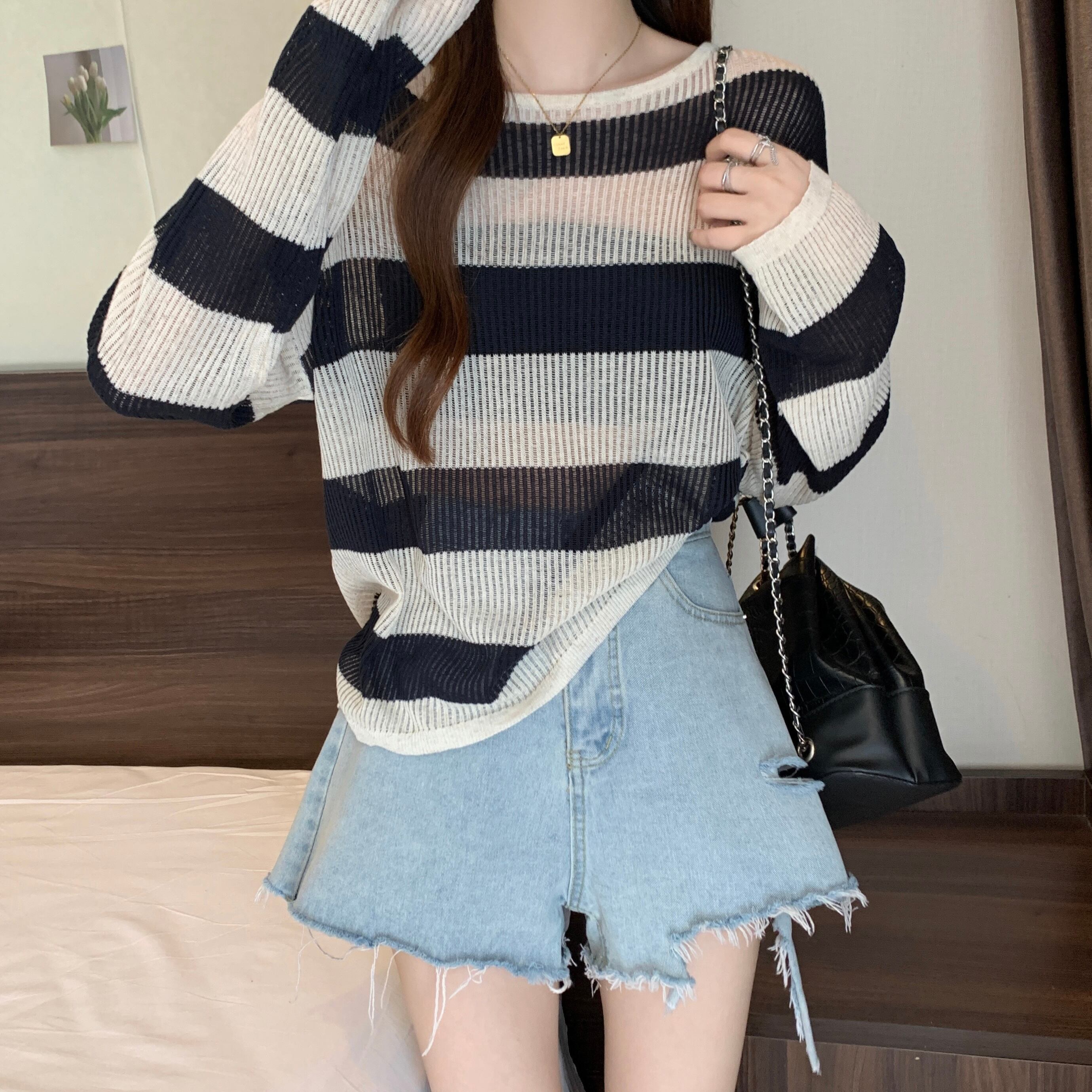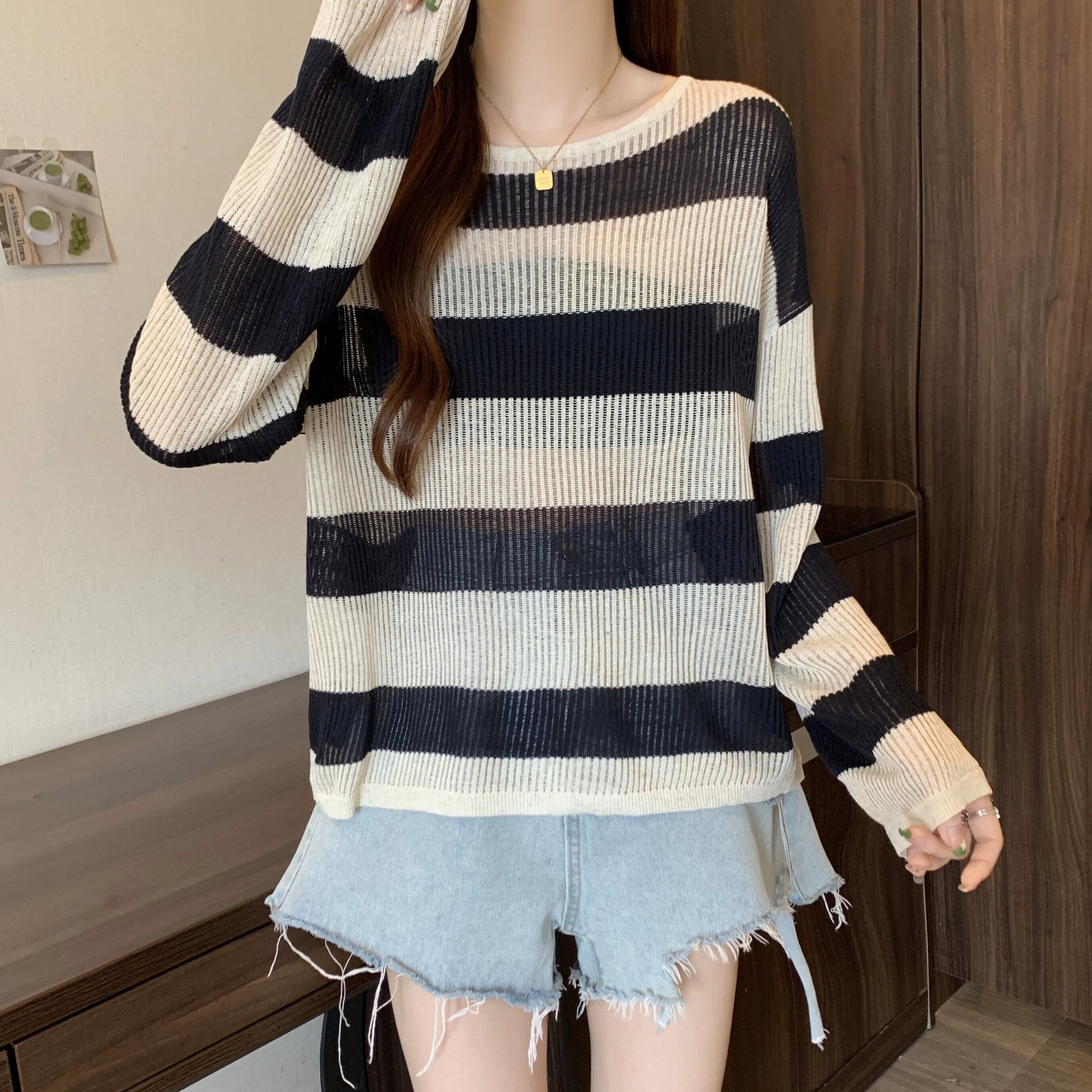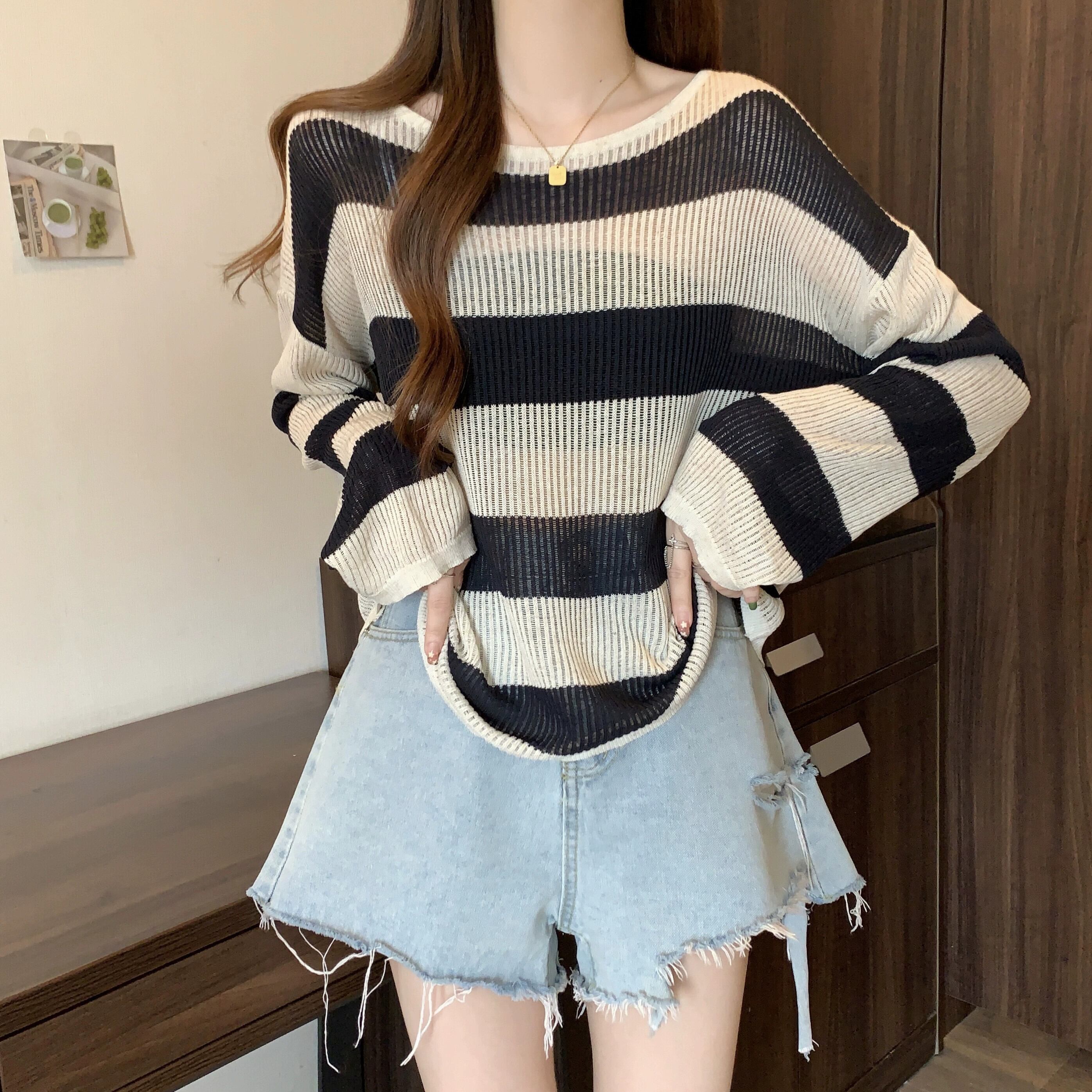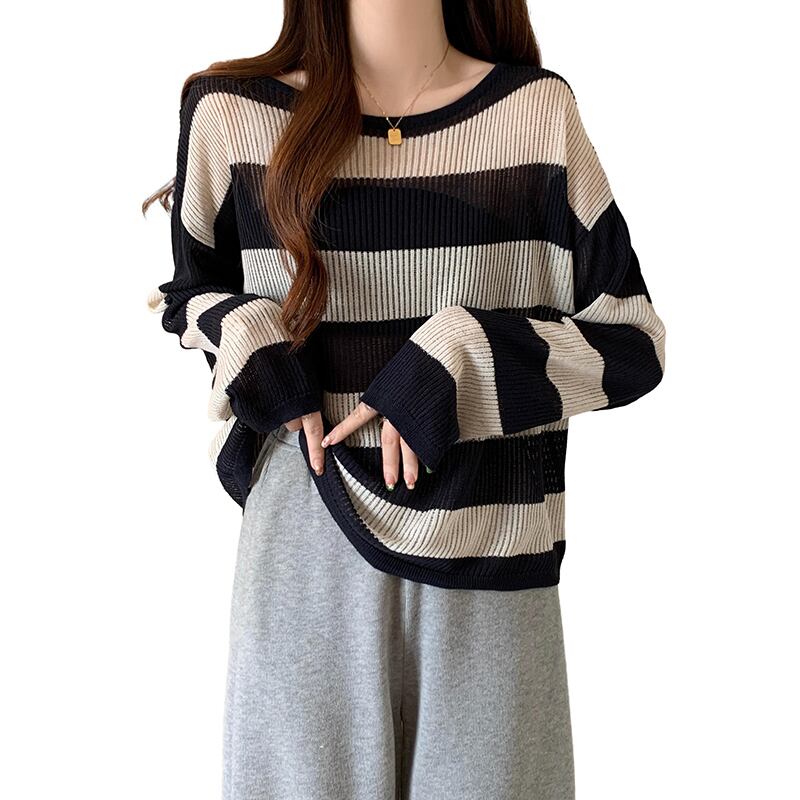 プラスサイズの婦人服 2023 脂肪姉妹夏の新バージョン緩い怠惰な日焼け止めシャツドロップショルダースリーブストライプブラウストップ 大きめサイズ サマー 夏物 8884161345909383
