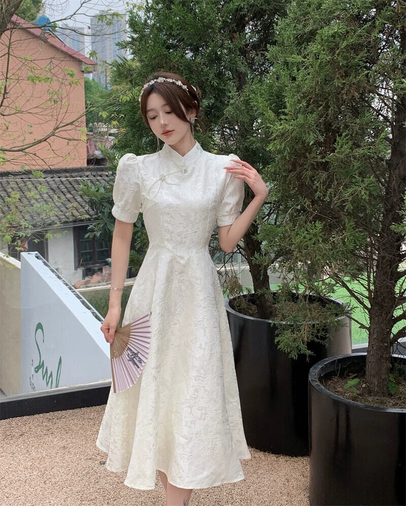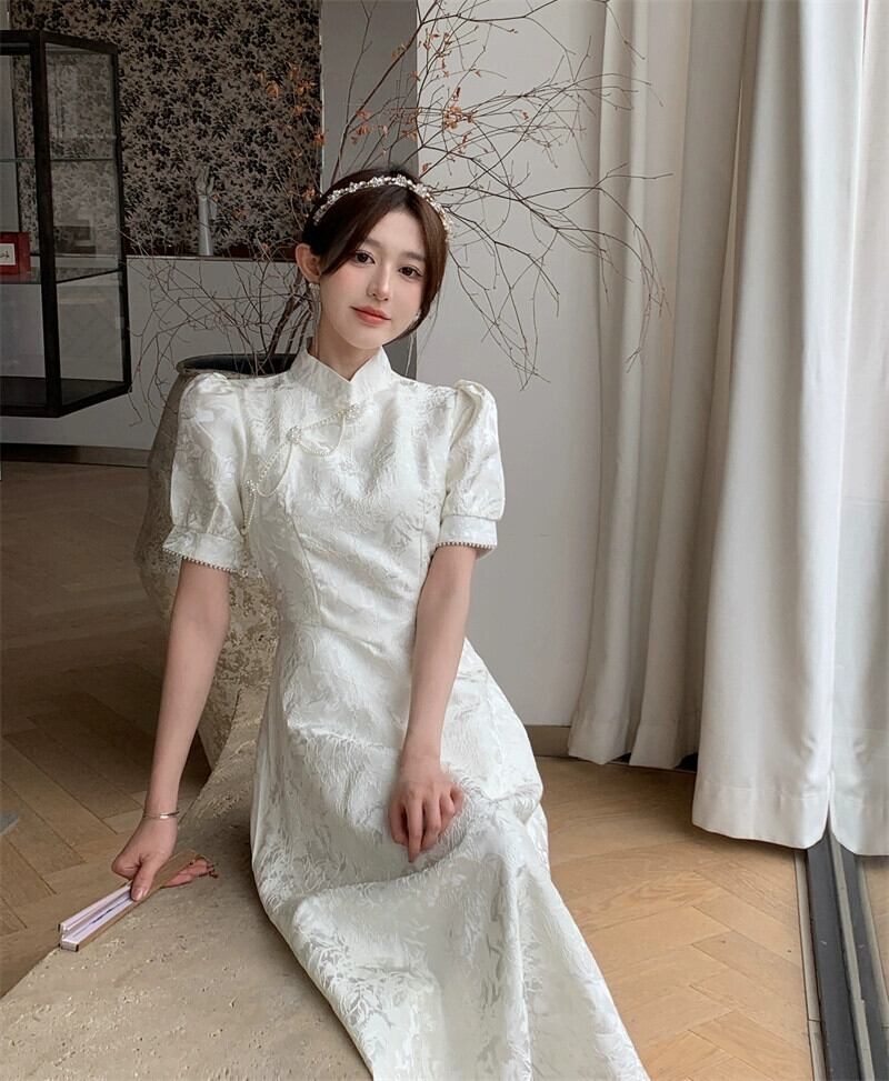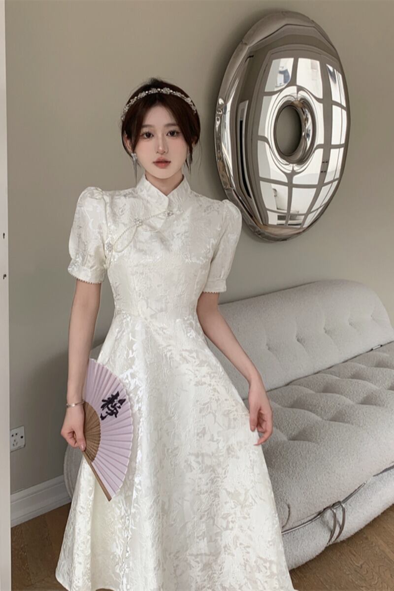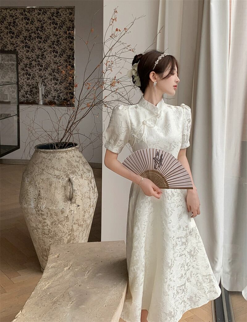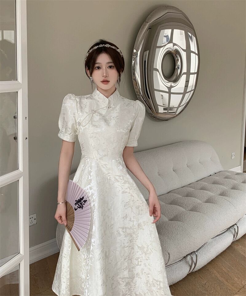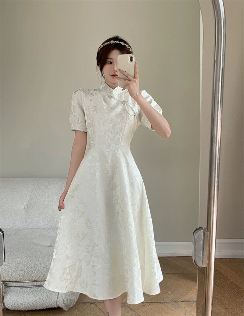 大きいサイズの女性の夏のレトロな国民風改善されたチャイナ ドレス新しいジャカード パール バックル ウエスト小さな白いドレス ロング スカート ホワイト 大きめサイズ サマー 夏物 真珠 8884192391343399