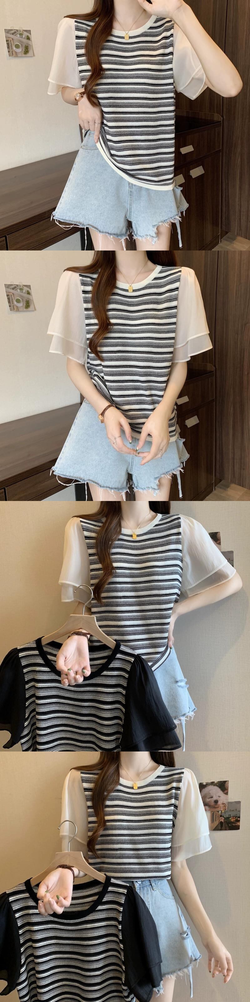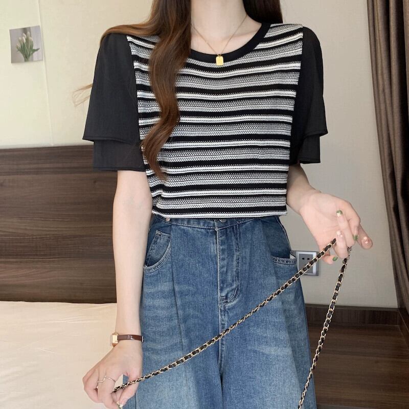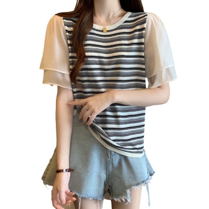 プラスサイズの婦人服 2023 夏服脂肪姉妹カジュアルスプライシングシフォンスリーブ Tシャツカバーベリーデザインストライプトップ 大きめサイズ サマー 夏物 8884125417831936
