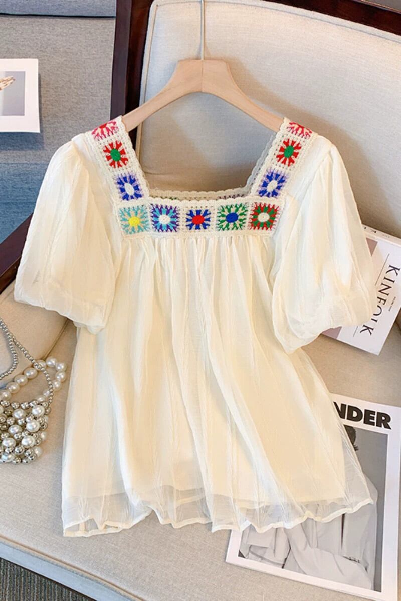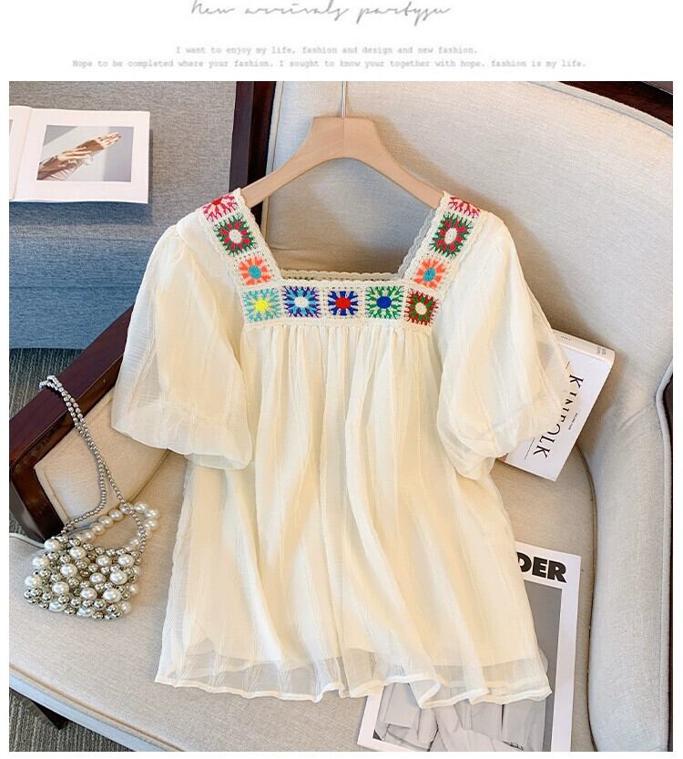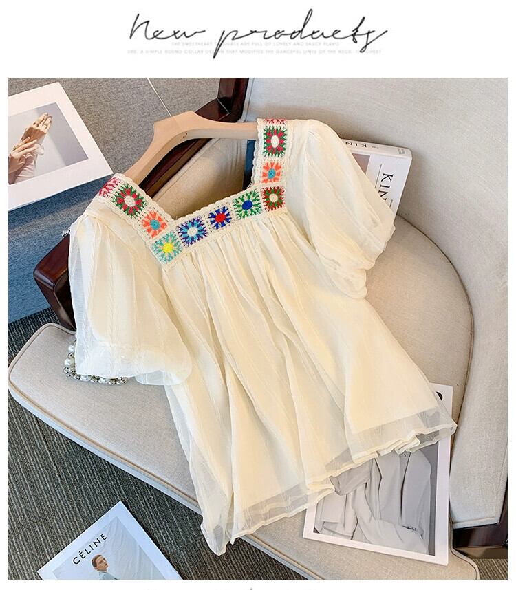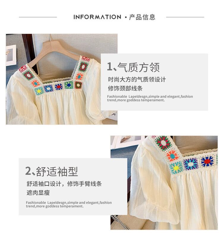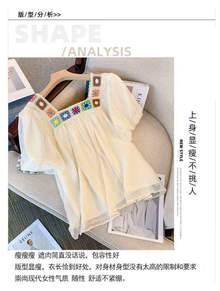 プラスサイズの婦人服 2023 夏服太った姉妹の年齢を減らすスクエアネックシフォンシャツお腹をカバーするデザイン感のあるフリルトップス 大きめサイズ サマー 夏物 スクウェア 8884170010474134