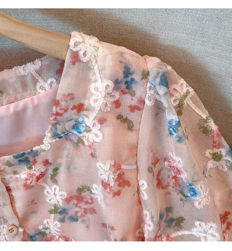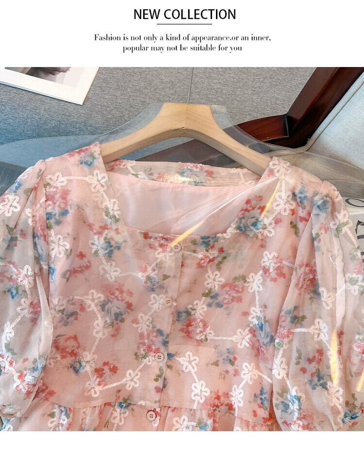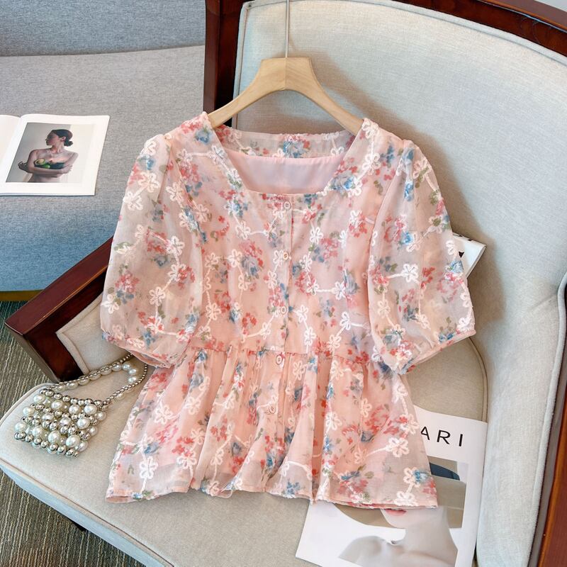 プラスサイズの女性の夏の新しい甘い花柄スクエアカラー半袖シャツデザインセンス年齢削減カバー腹痩身トップ 大きめサイズ 大人ガーリー スウィート キュート カジュアル サマー 夏物 スクウェア 8884187019346884