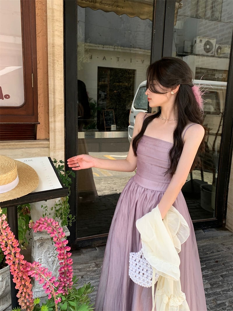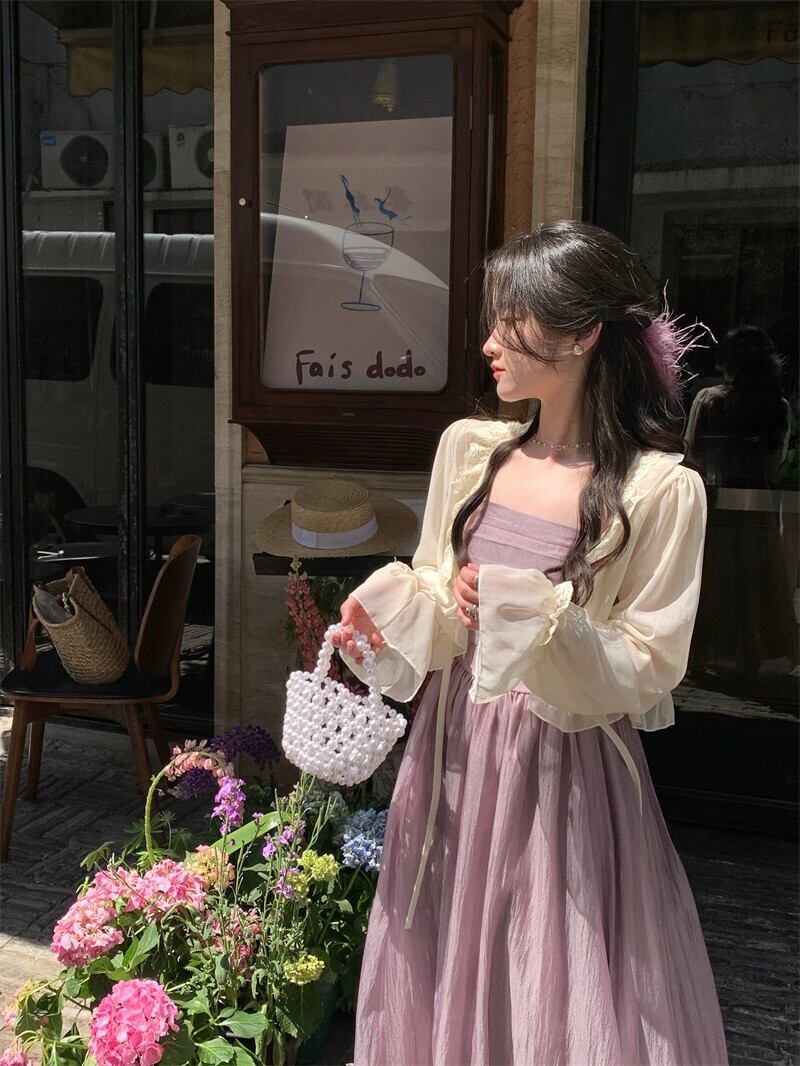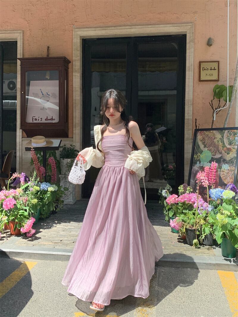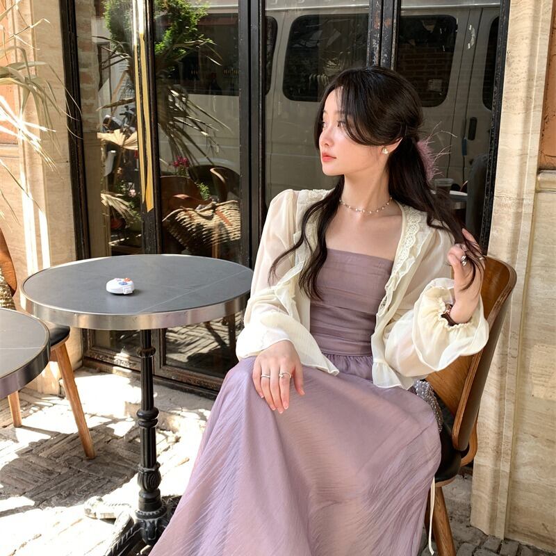 プラスサイズの妖精ドレス 2023 夏ロングセクションスリムで優しいスタイル紫色のサスペンダースカートカーディガントップスーツ 大きめサイズ サマー 夏物 パープル 8884135496317065