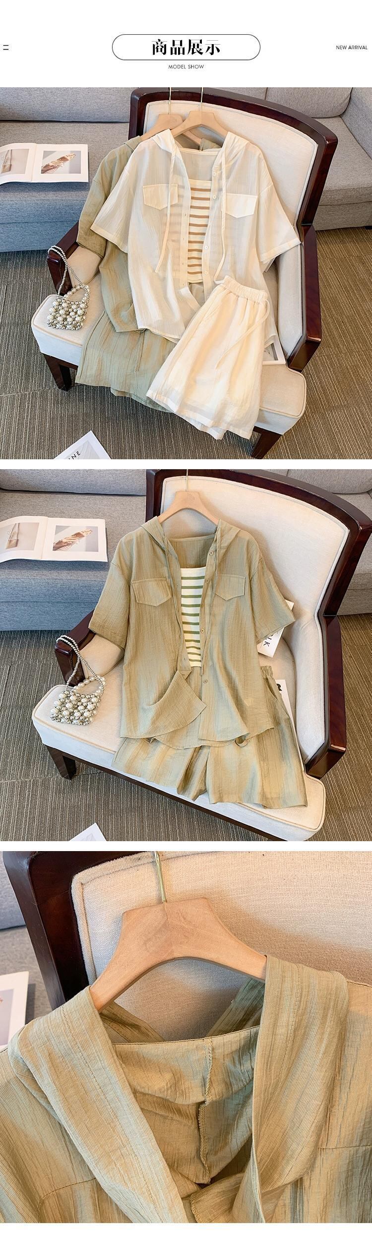 プラスサイズの婦人服 2023 脂肪姉妹夏の新ファッションスーツストライプキャミソールフード付きシャツ 3 点セット 大きめサイズ サマー 夏物 8884199215063808