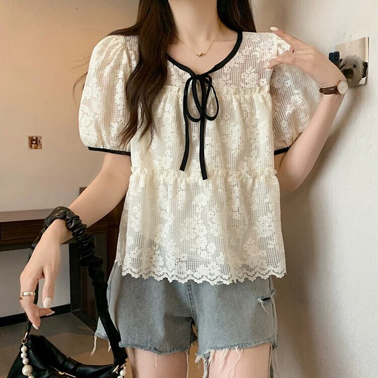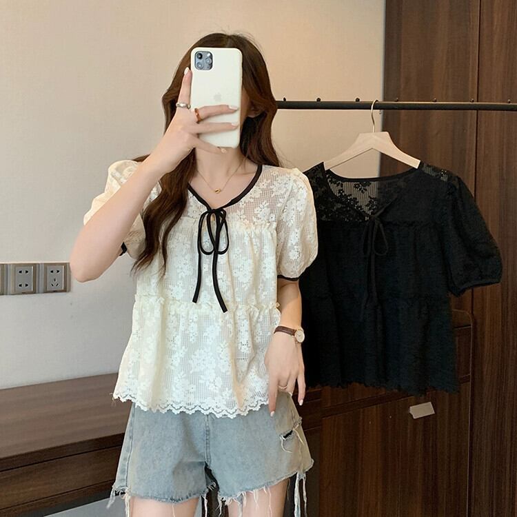 プラスサイズの婦人服 2023 脂肪姉妹夏服新しい優しいスタイルフレンチボウ菌レーストップ リボン 大きめサイズ サマー 夏物 888413668670544