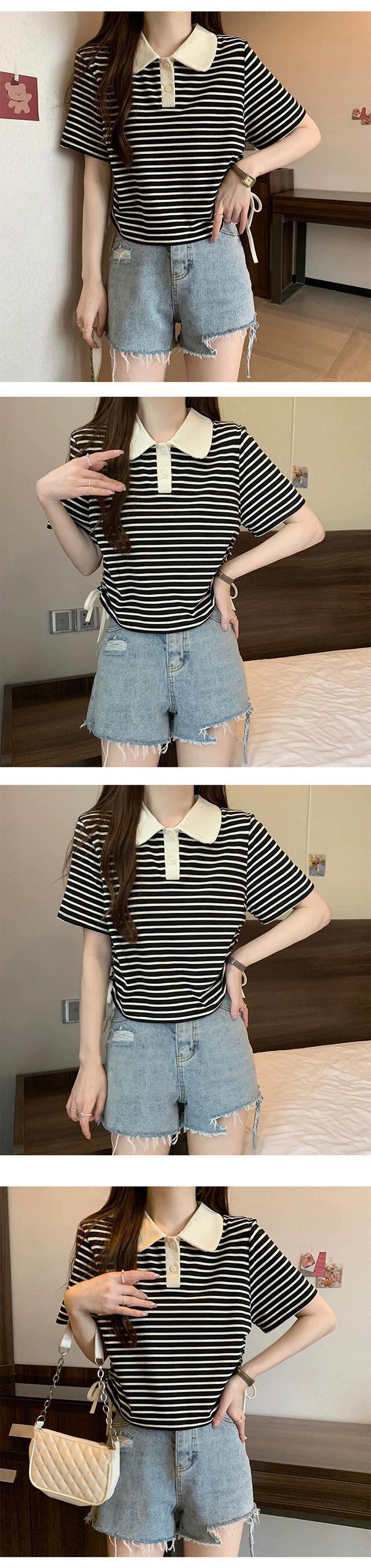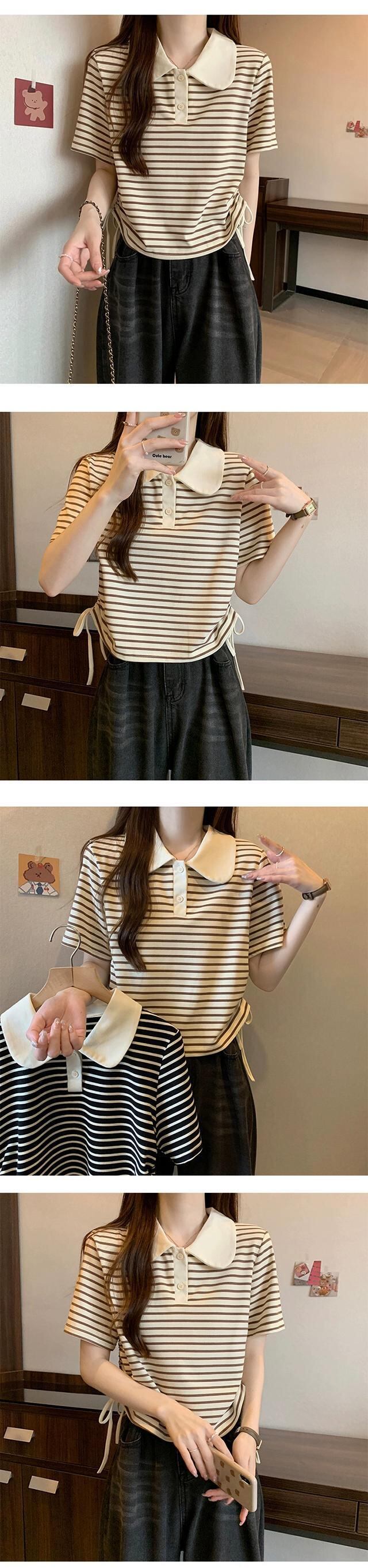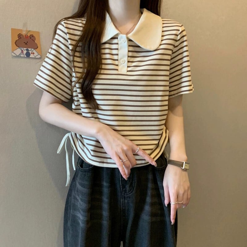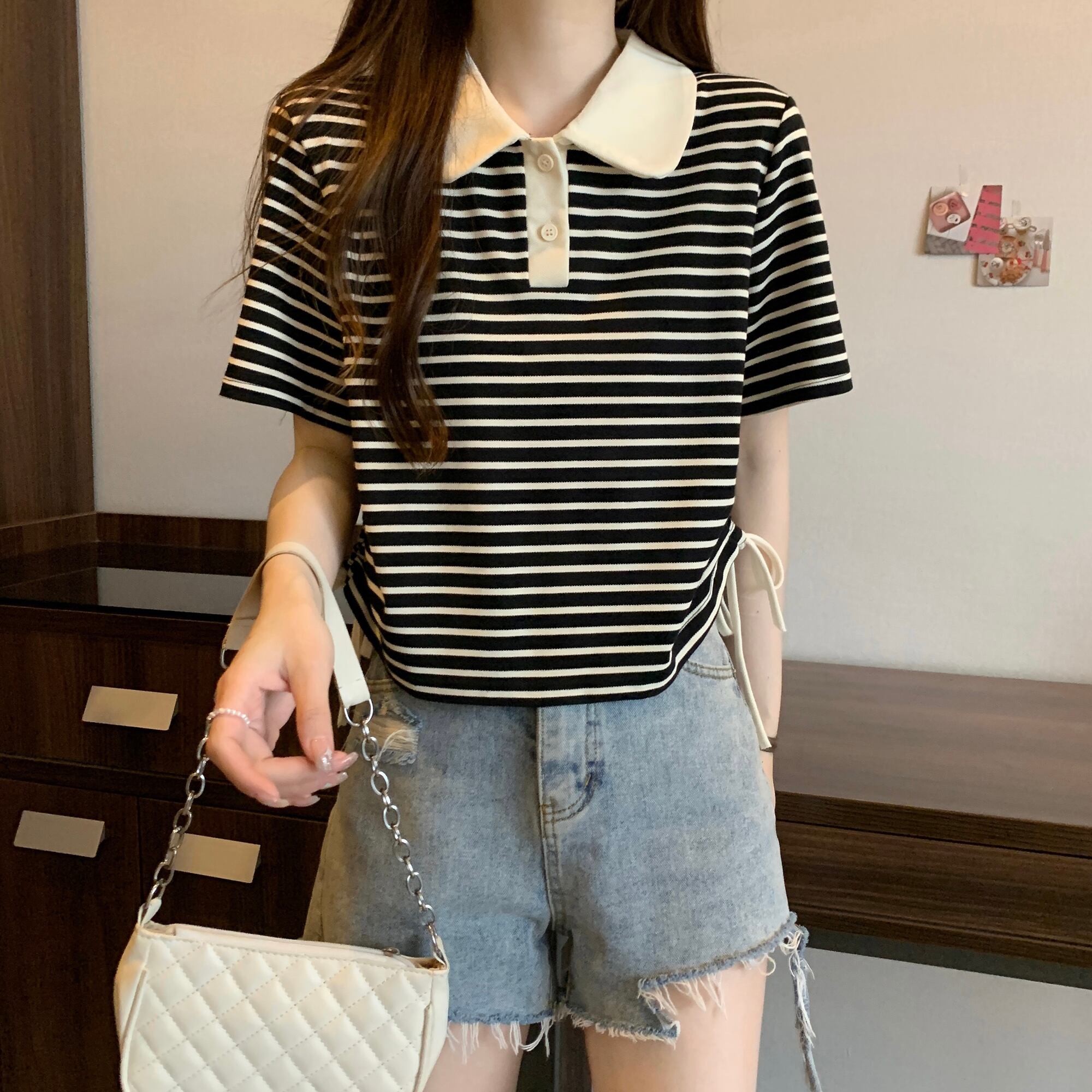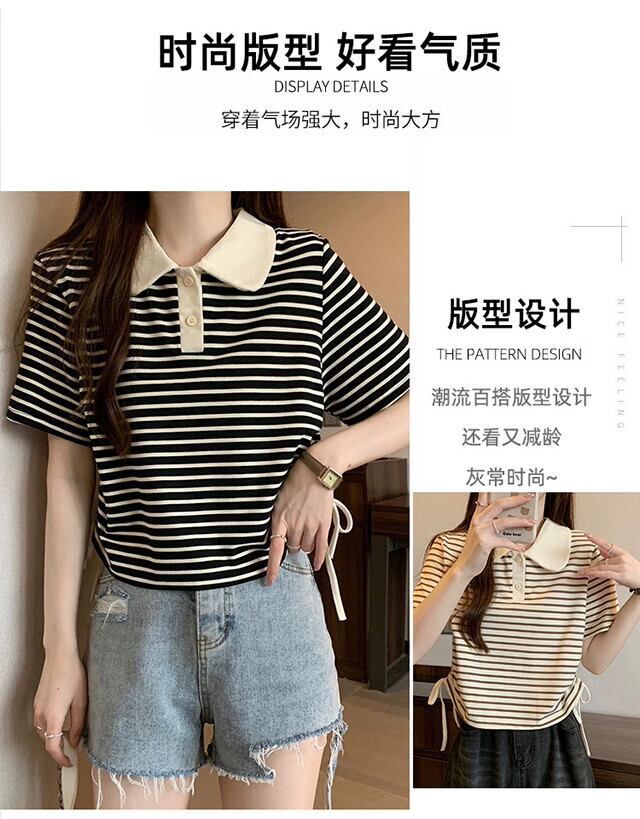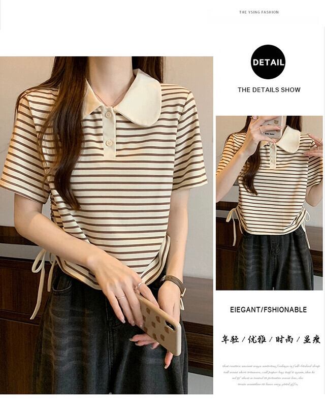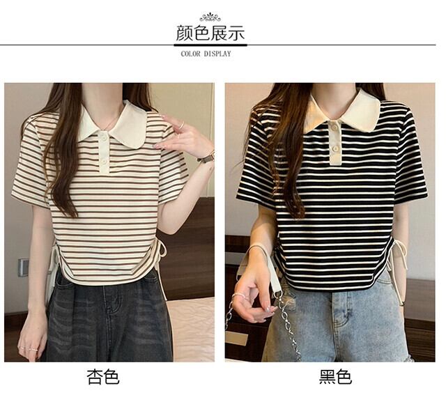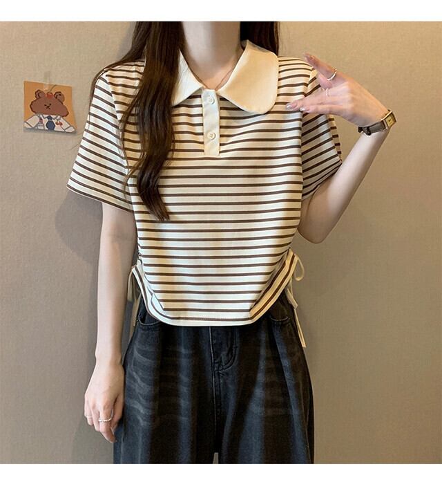 プラスサイズの女性の 2023 夏服ファットシスタールーズドールカラートップ巾着ストライプ半袖右肩 Tシャツ ショート ハーフスリーブ 大きめサイズ サマー 夏物 8884175785666485