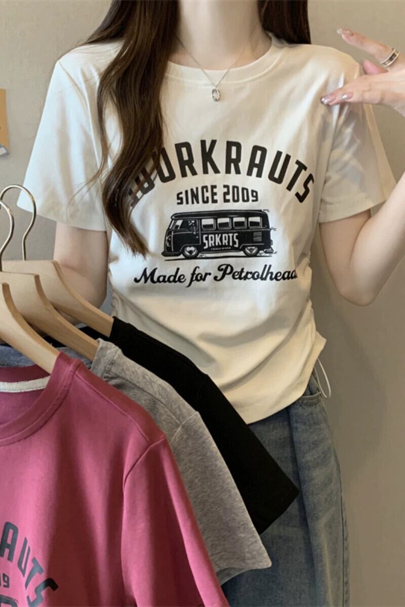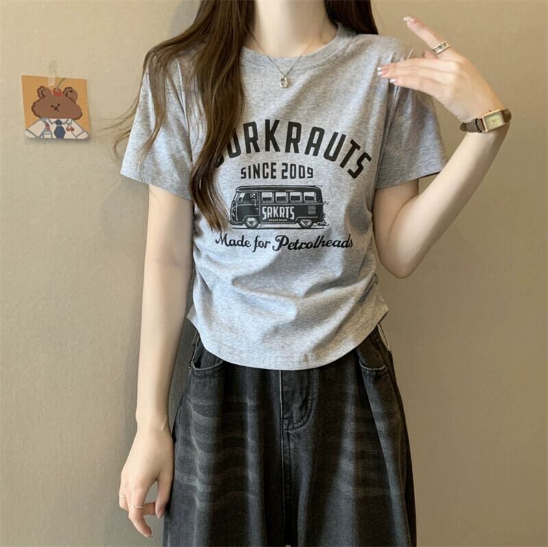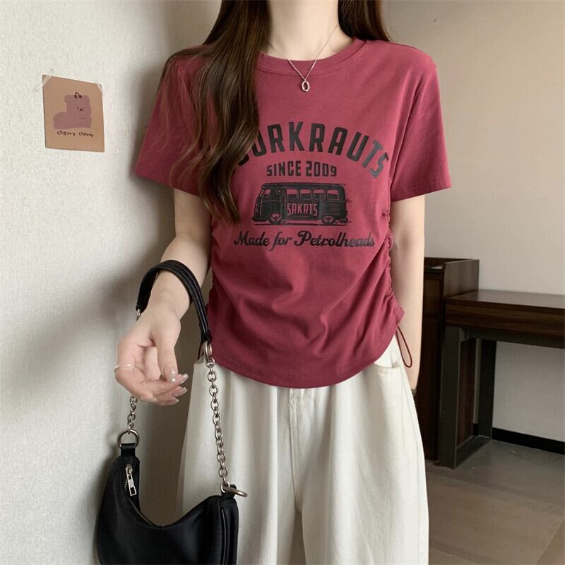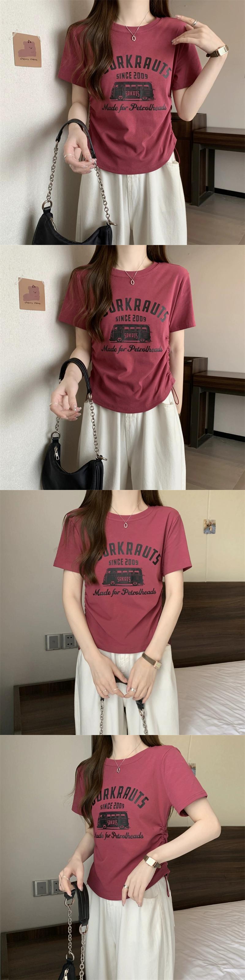 プラスサイズの婦人服 2023 ファットシスター夏の新しい多用途プリント半袖 Tシャツ痩身ルーズ腹カバー巾着トップ 大きめサイズ サマー 夏物 8884115752523994