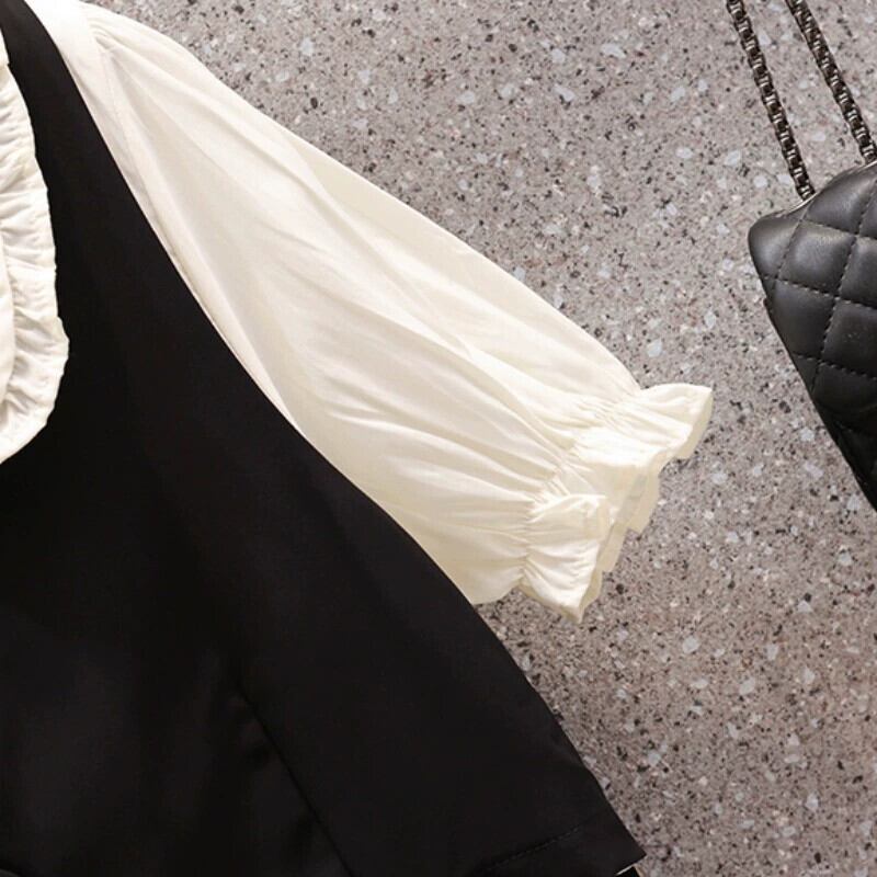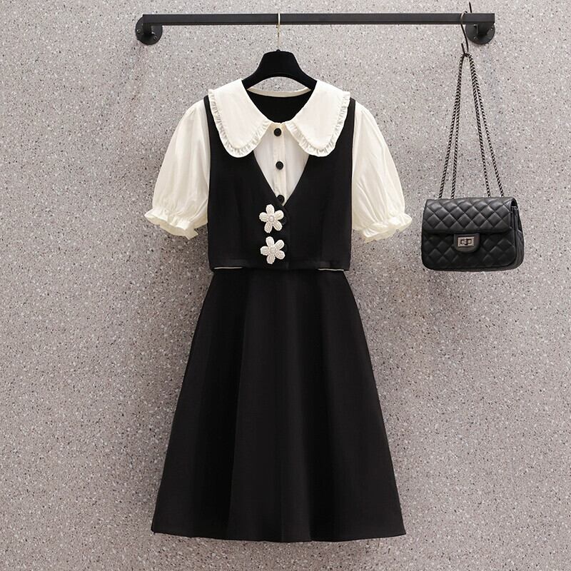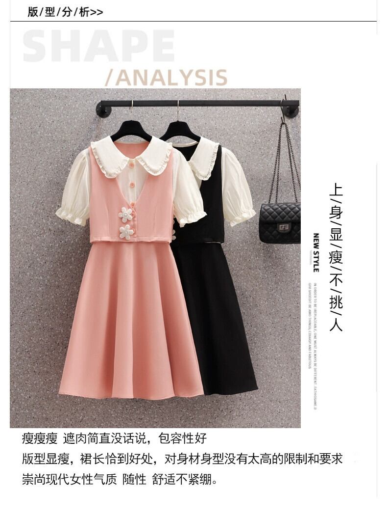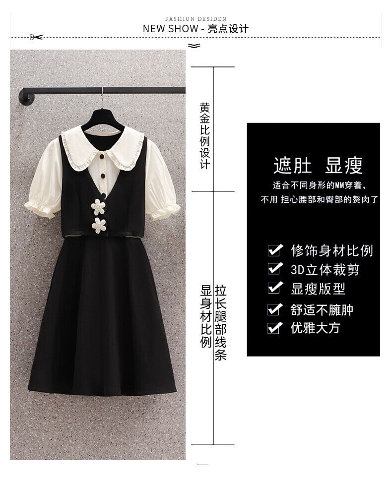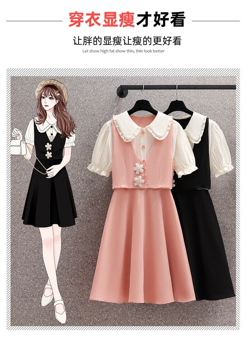プラスサイズの女性の 2023 夏服脂肪フランス年齢軽減 A ラインスカート人形の襟偽ツーピースデザインのドレス 大きめサイズ サマー 夏物 Aライン 8884120802221197