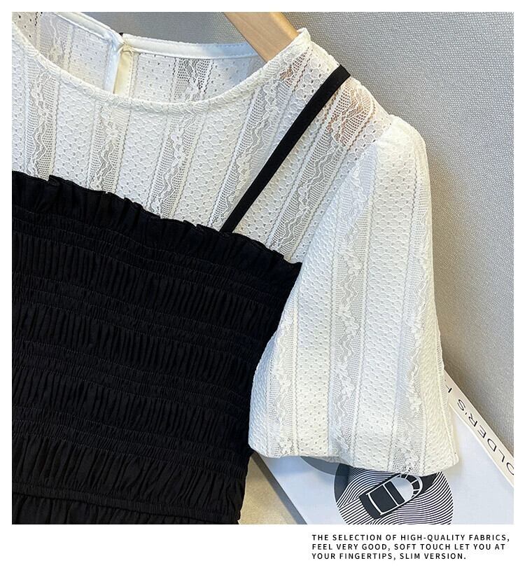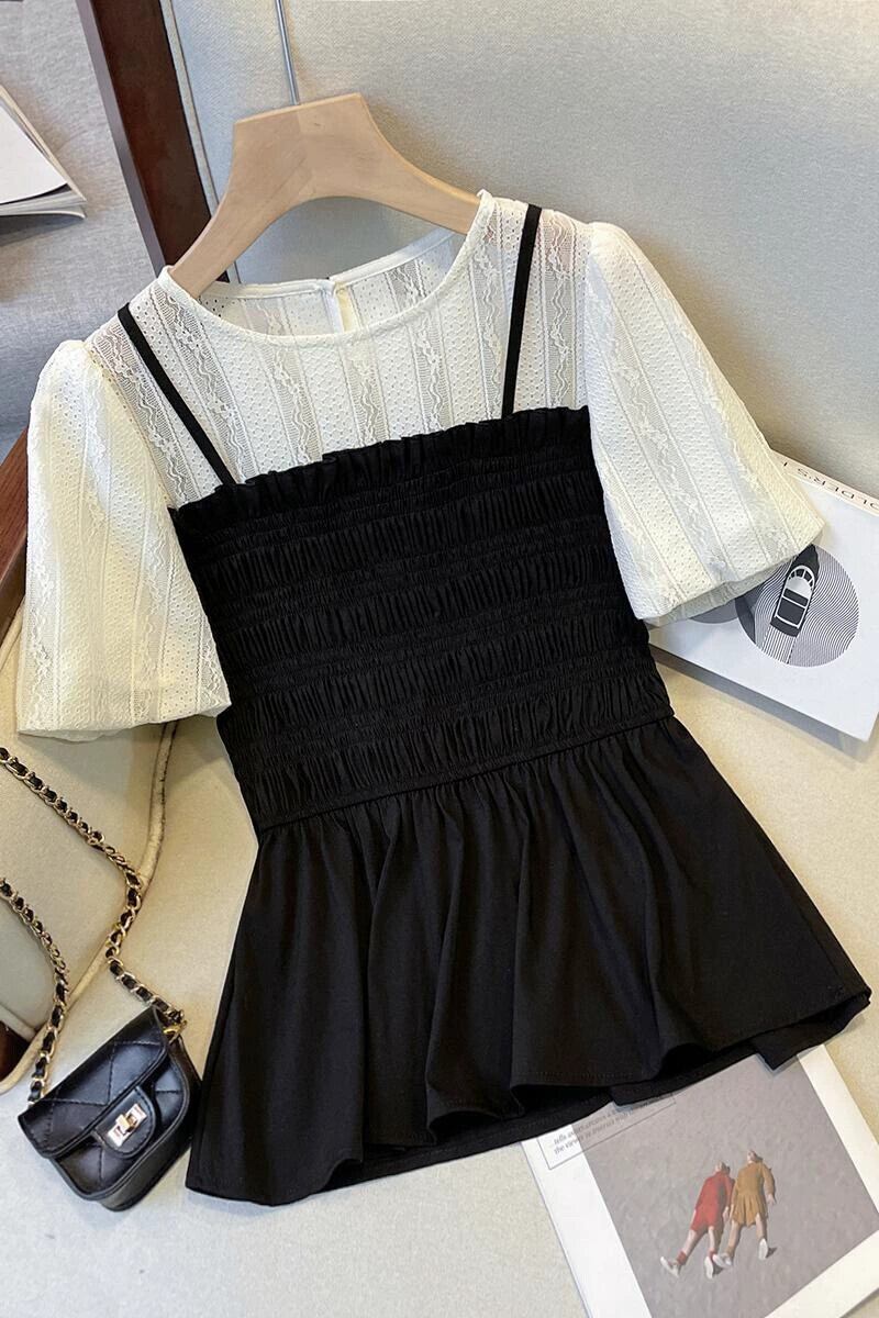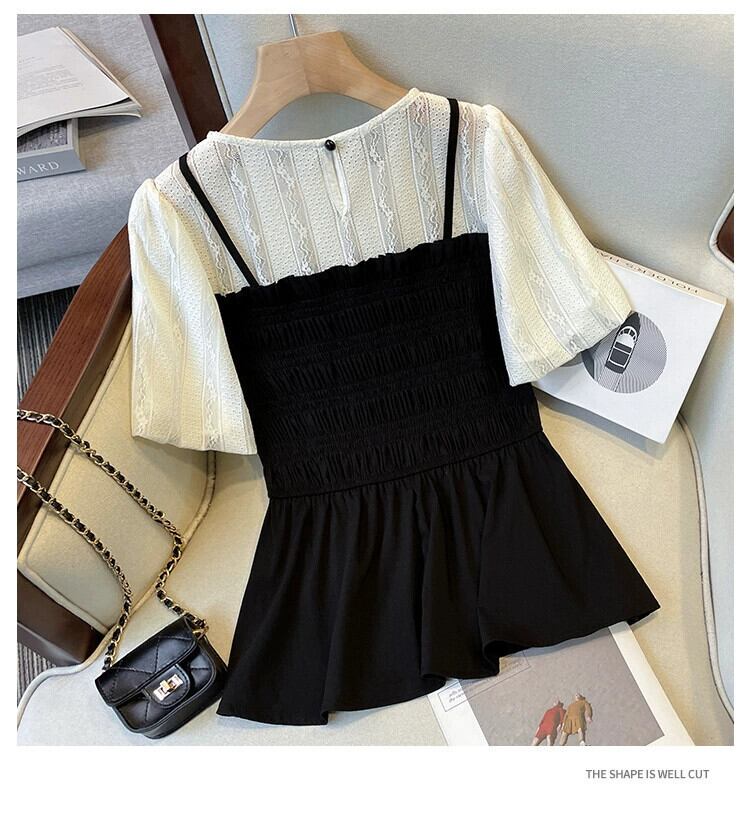 プラスサイズの女性の 2023 夏の新しいスタイル脂肪姉妹ウエスト痩身シックなパフスリーブフェイクツーピースファッショナブルなトップス 大きめサイズ サマー 夏物 8884159213186502
