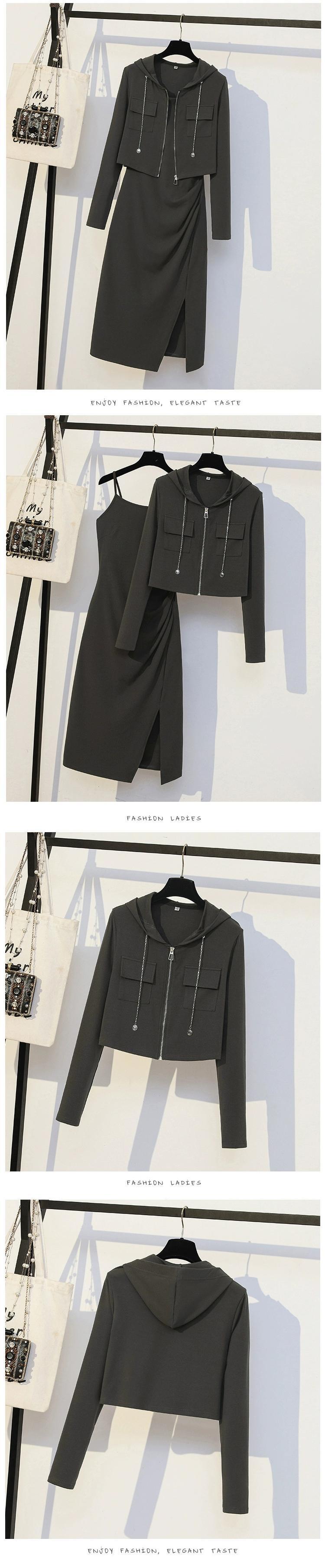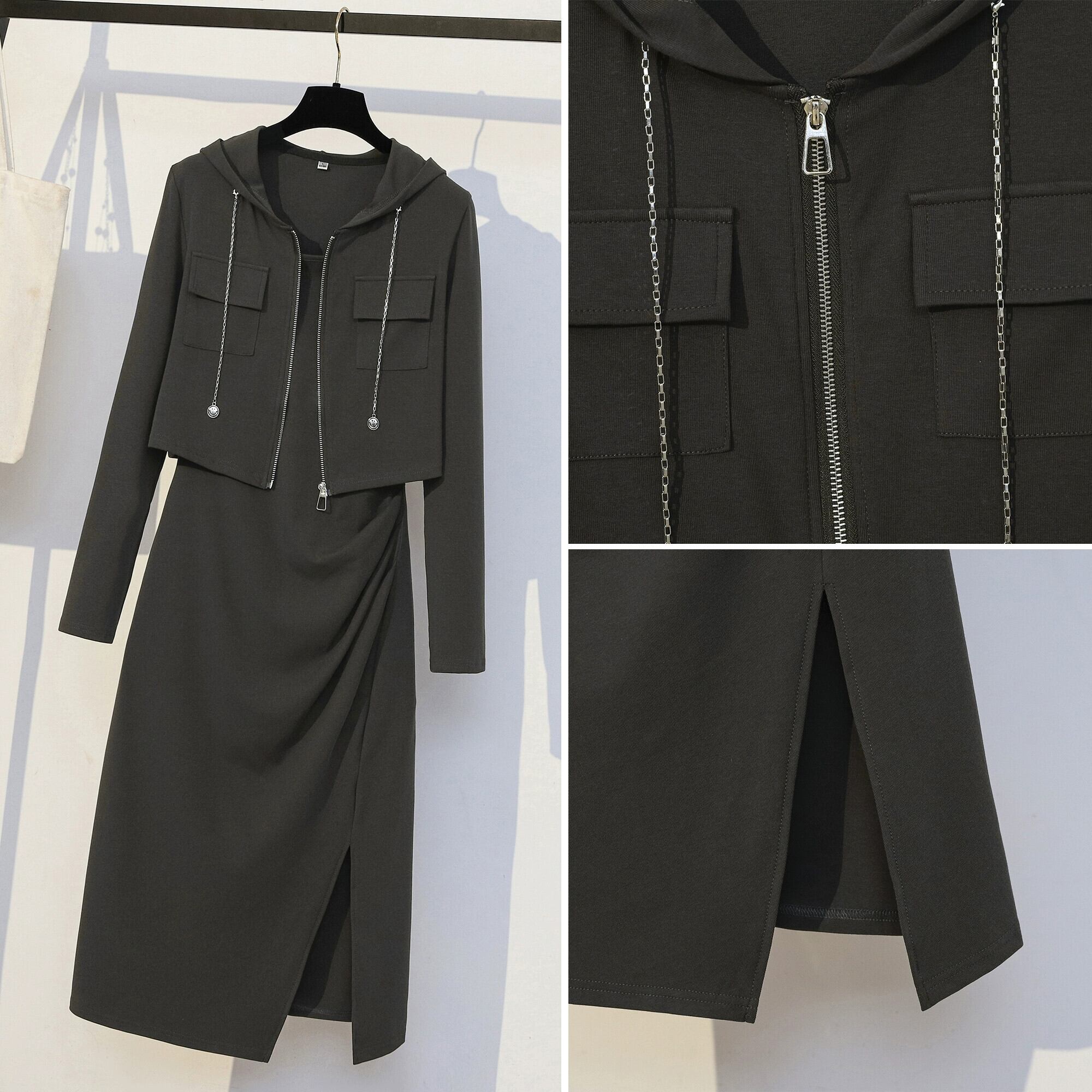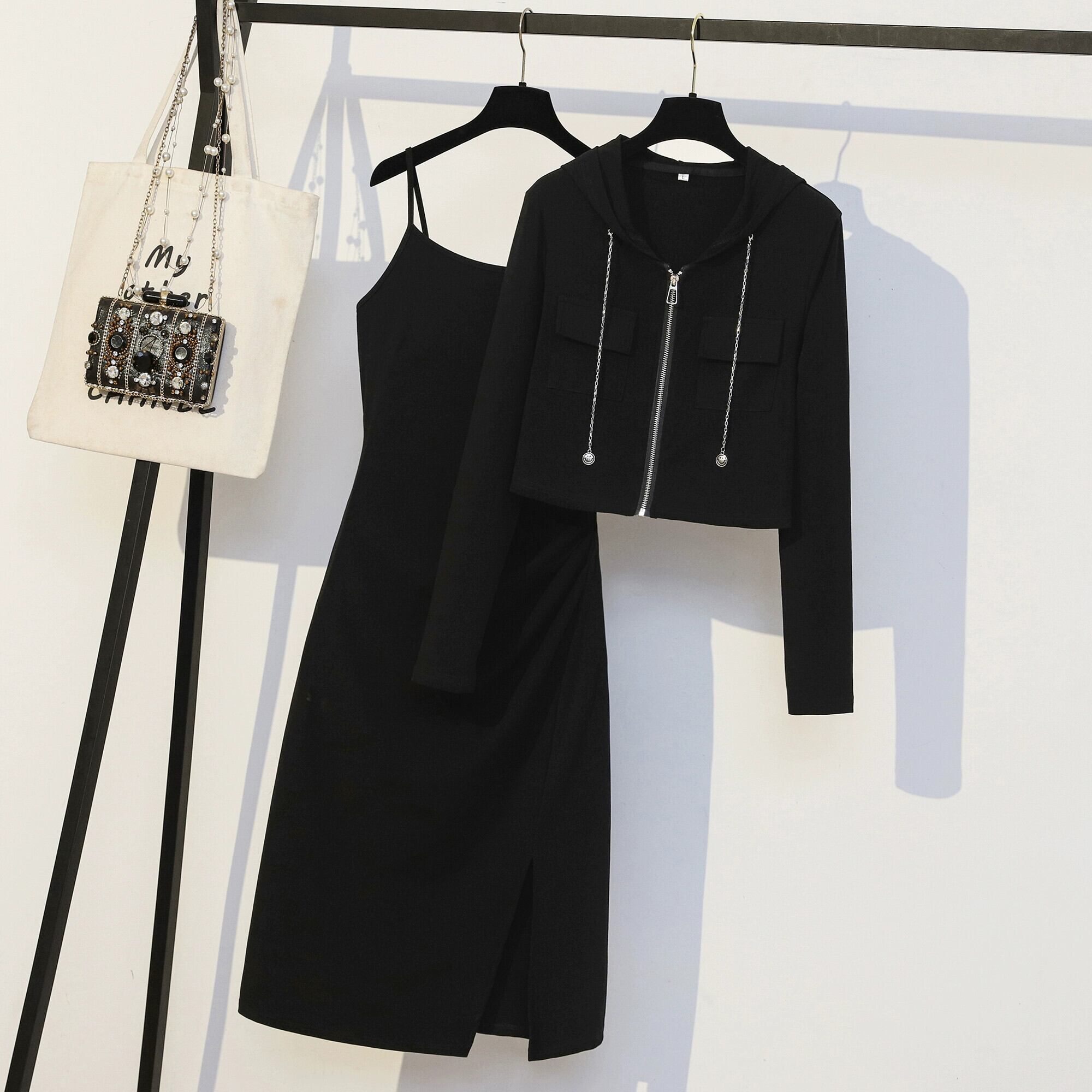 プラスサイズの婦人服 2023 ファットシスター秋の新ファッションスーツスリットスリムサスペンダースカートフード付きジャケット 2 点セット 大きめサイズ オータム 秋物 8884146464103891