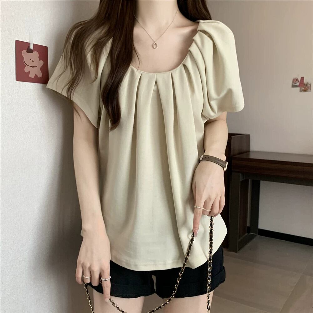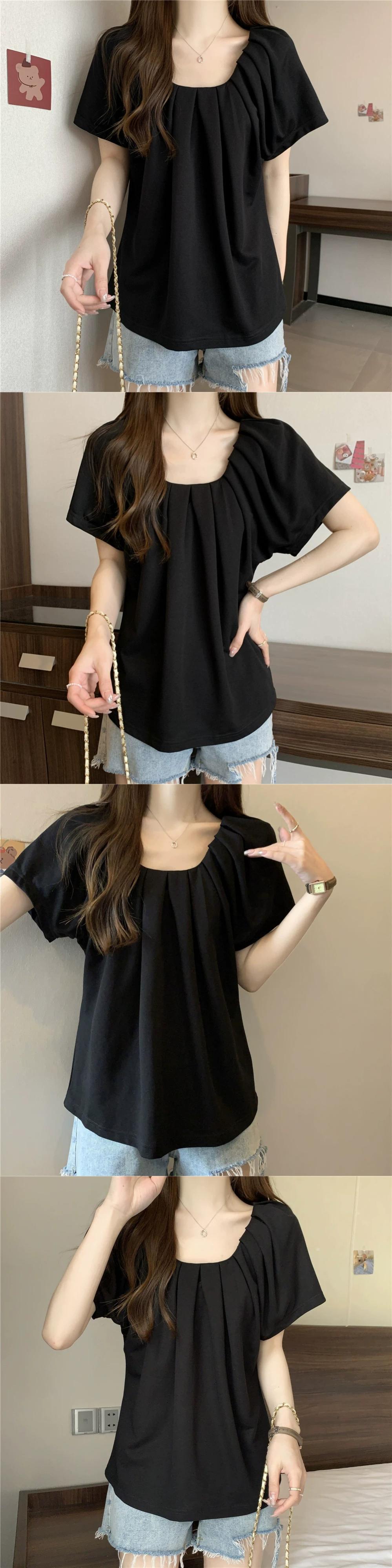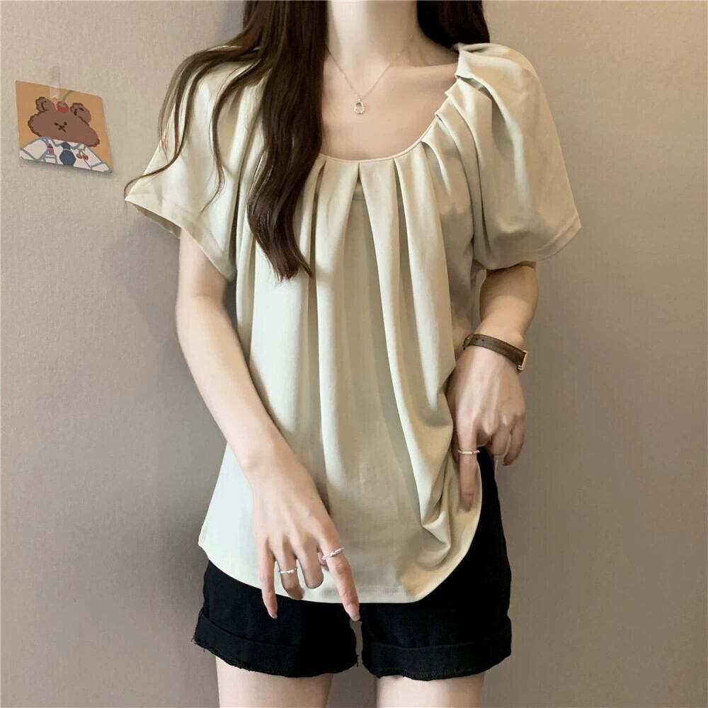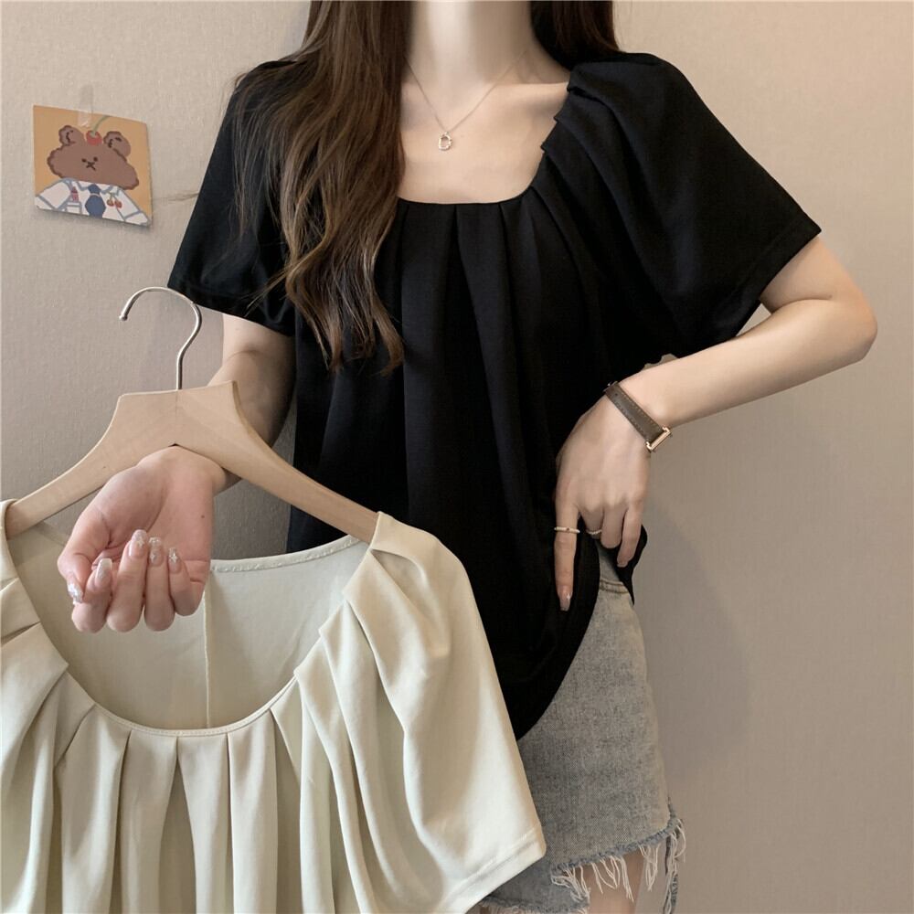 プラスサイズの婦人服 2023 ファットシスター夏服新デザインスクエアカラープリーツ半袖 Tシャツシンプルなルーズシャツ 大きめサイズ サマー 夏物 スクウェア 8884150676113625