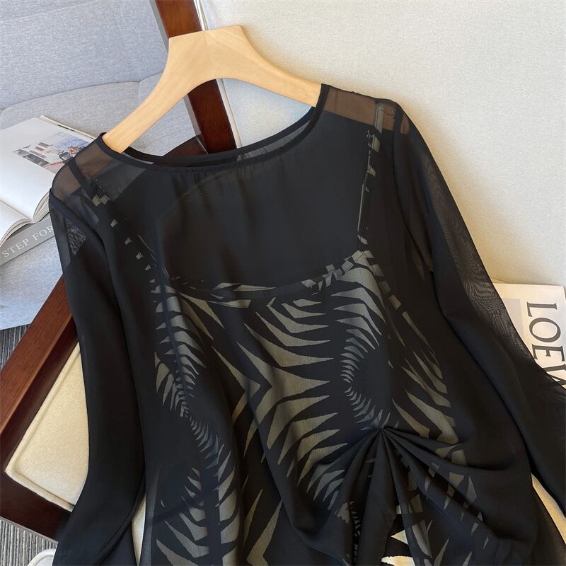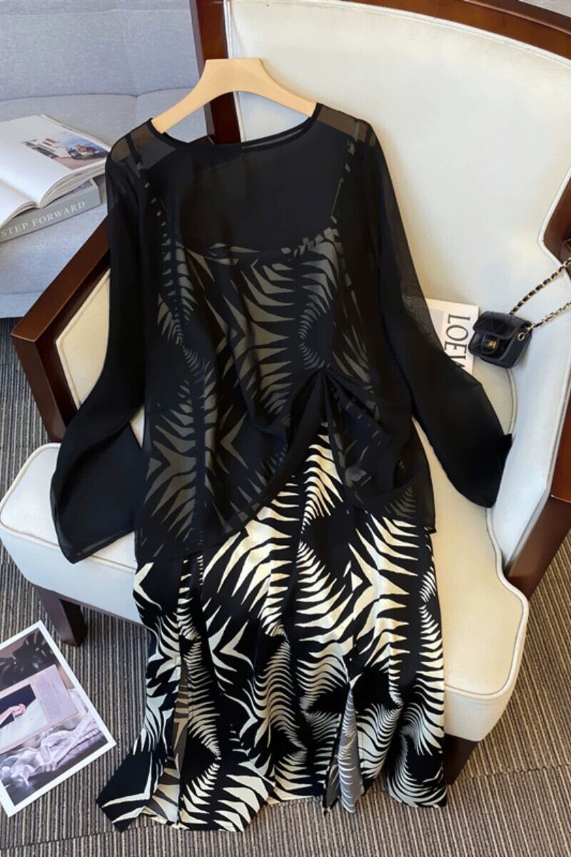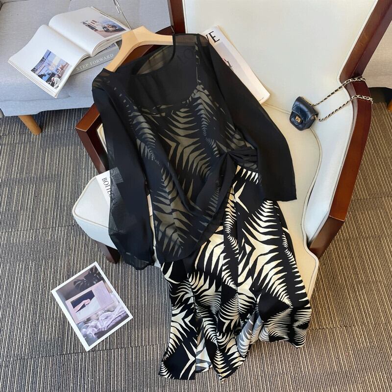 プラスサイズの婦人服 2023 脂肪姉妹夏の新ファッション痩身ツーピースシフォン日焼け防止トップサスペンダースカートスーツ 大きめサイズ サマー 夏物 8884188610920723