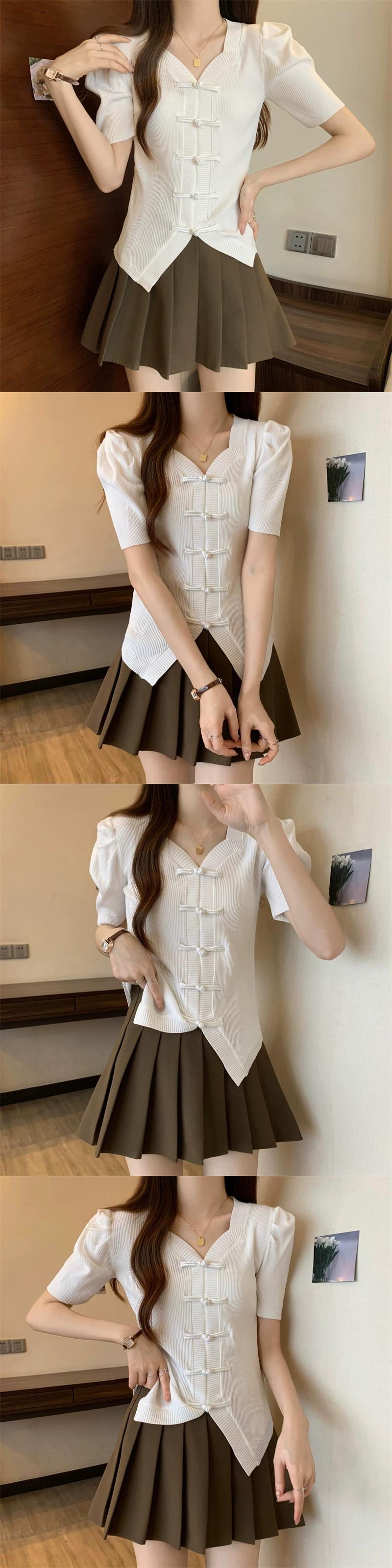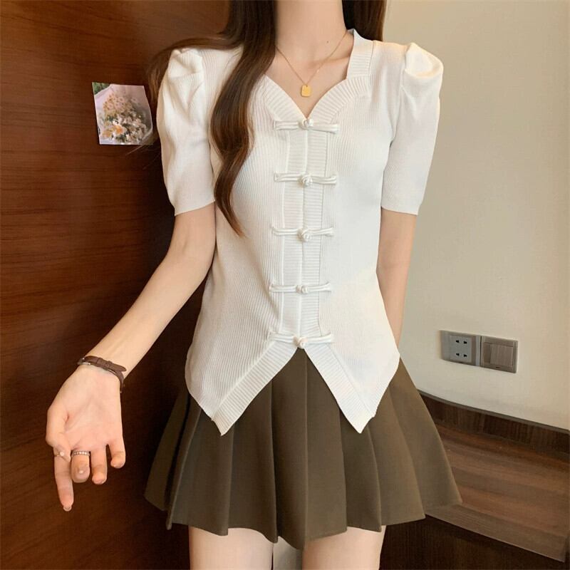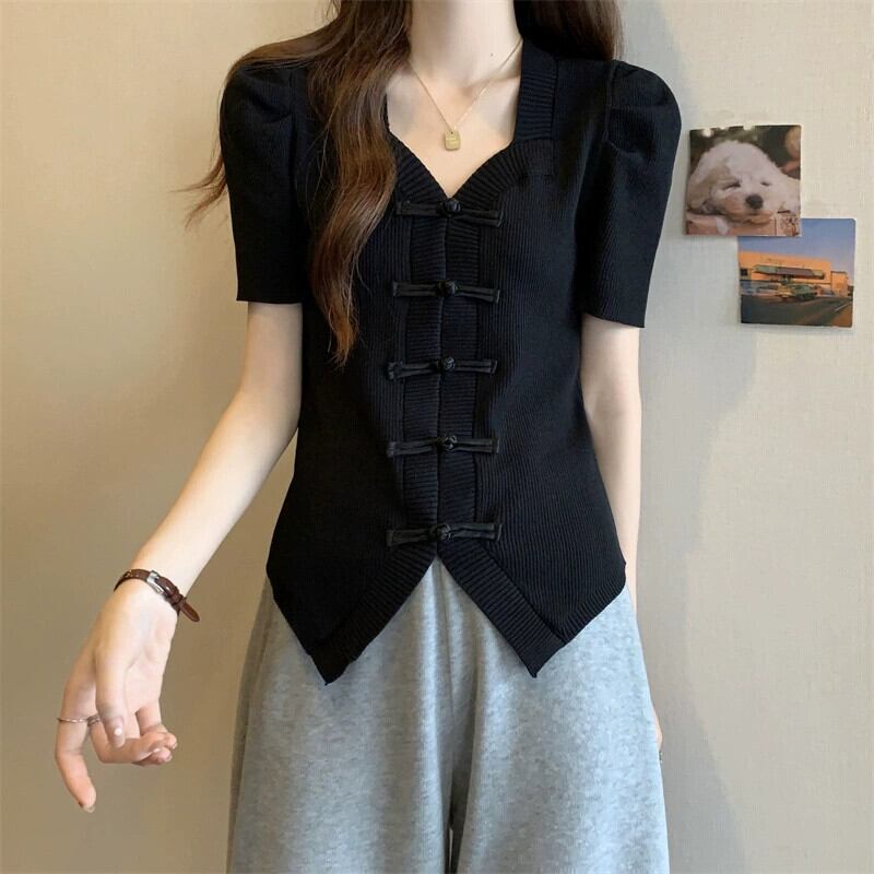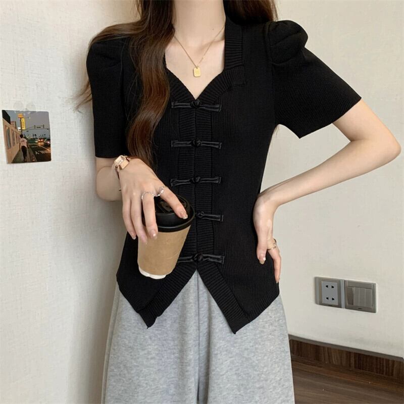 プラスサイズの女性の 2023 ファットシスター夏スタイル中国のレトロな国家プレートボタンパフスリーブアイスシルクセータートップ 大きめサイズ サマー 夏物 8884118026576127