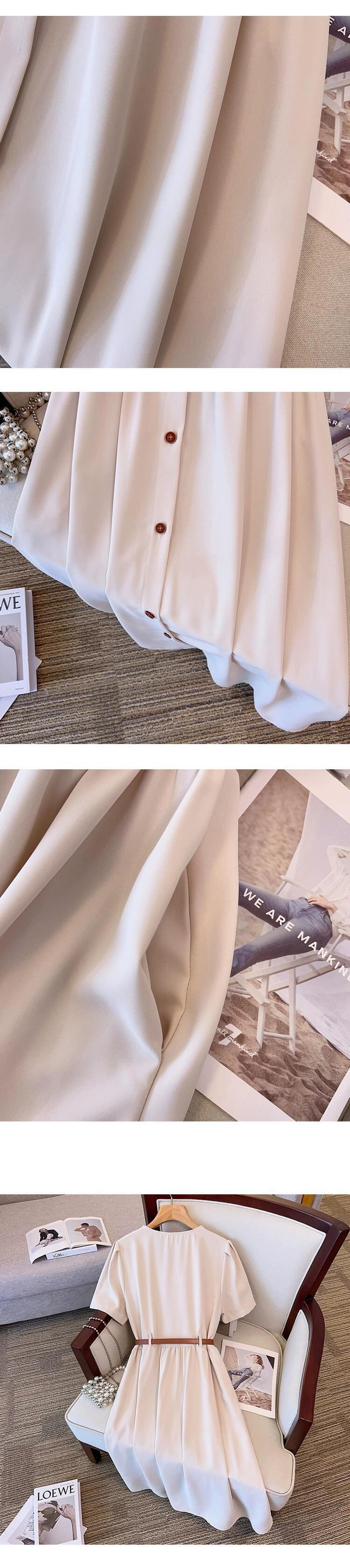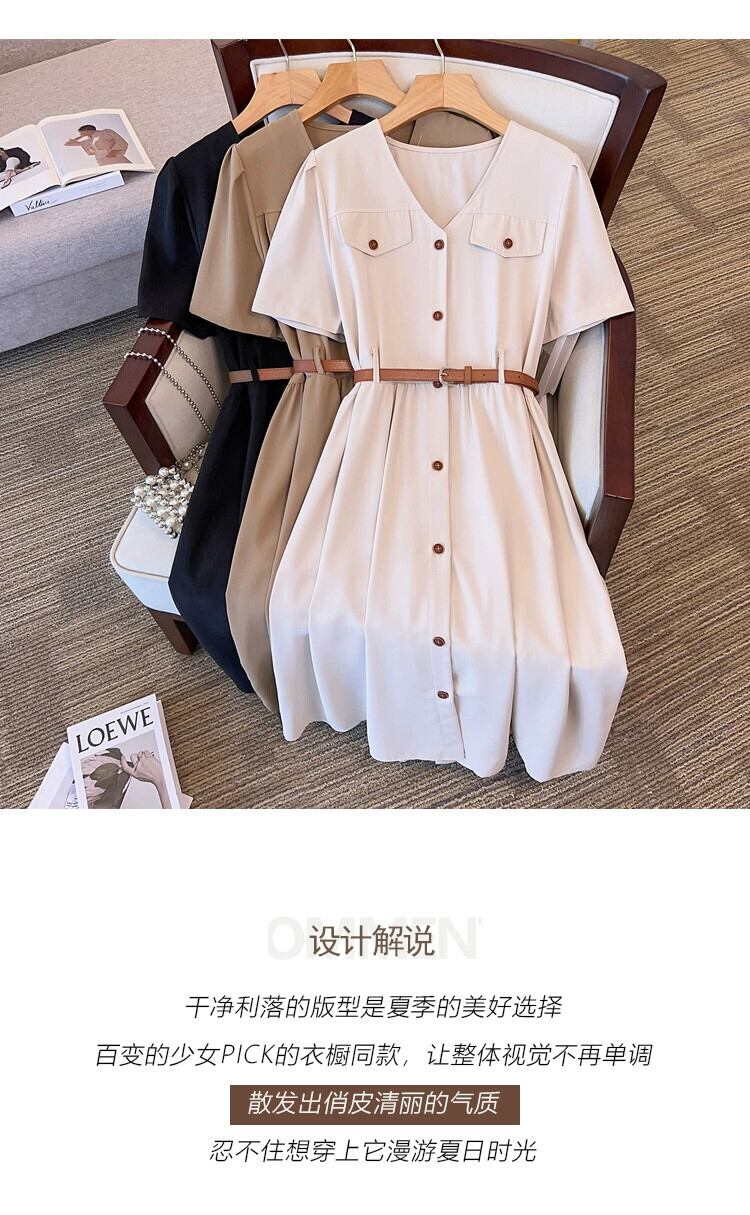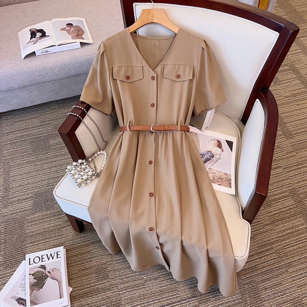 プラスサイズの婦人服 2023 脂肪姉妹夏服新しいフレンチシンプルな V ネック気質カジュアルスカートベルトドレス 大きめサイズ サマー 夏物 ハーネス Vネック 8884118364524211