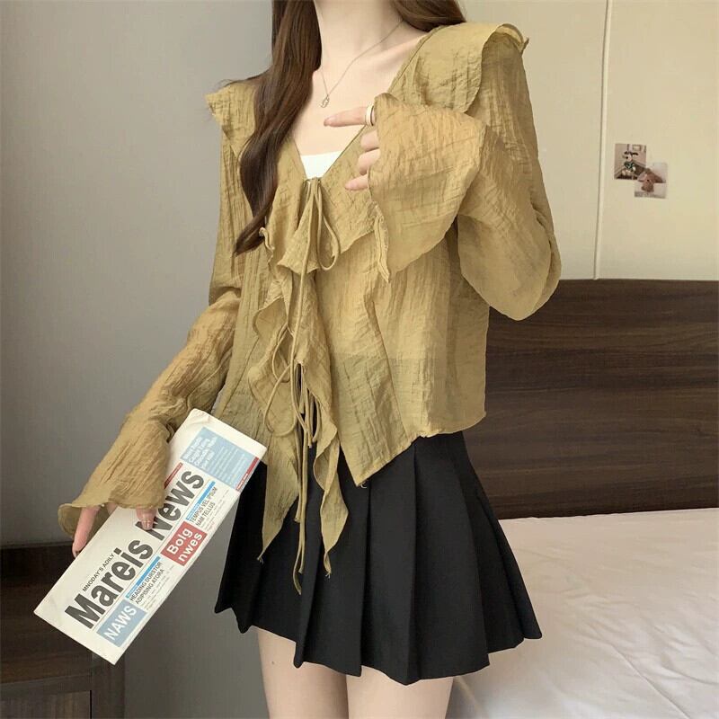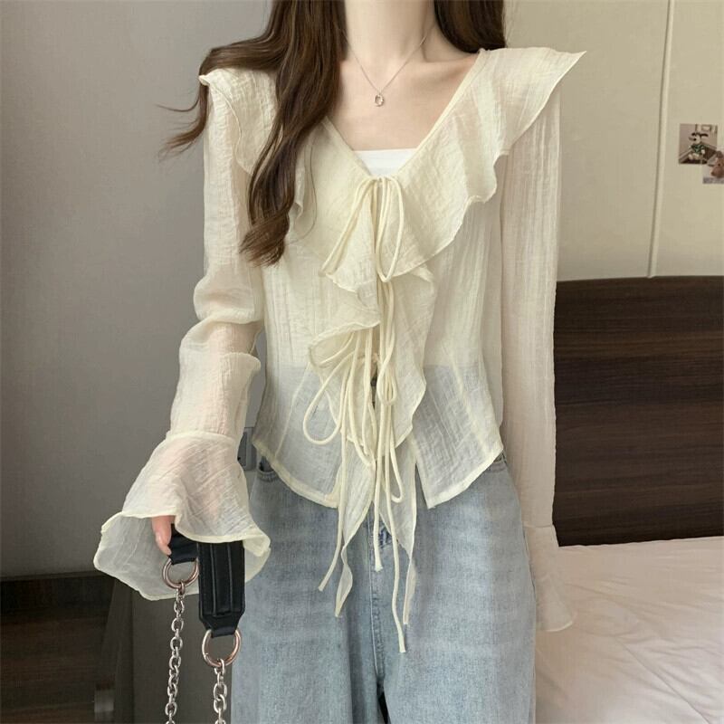 プラスサイズの婦人服 2023 流行の夏の新しいファットシスターフリル V ネックレースアップ日焼け防止トップショール長袖シャツ ロング 大きめサイズ サマー 夏物 Vネック 8884198563931970