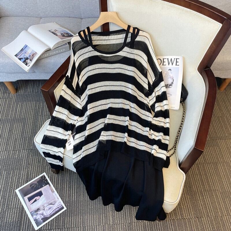プラスサイズの婦人服 2023 脂肪姉妹夏の新しいスタイル緩い気質ツーピースセットニット日焼け止めシャツサスペンダースカートツーピースセット 大きめサイズ サマー 夏物 8884182254322674