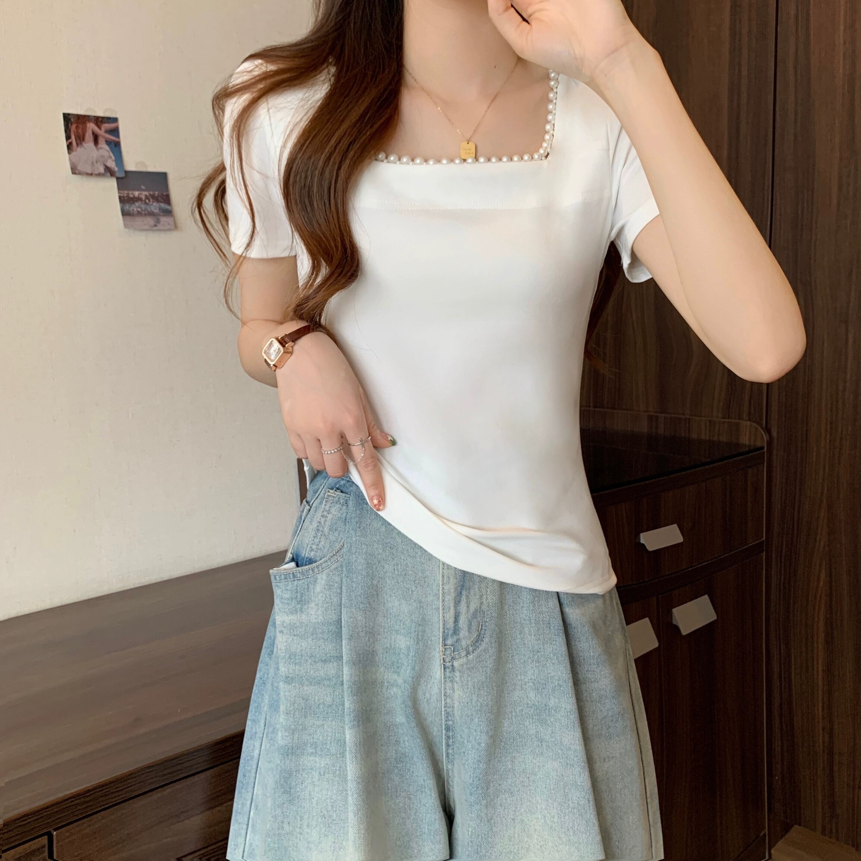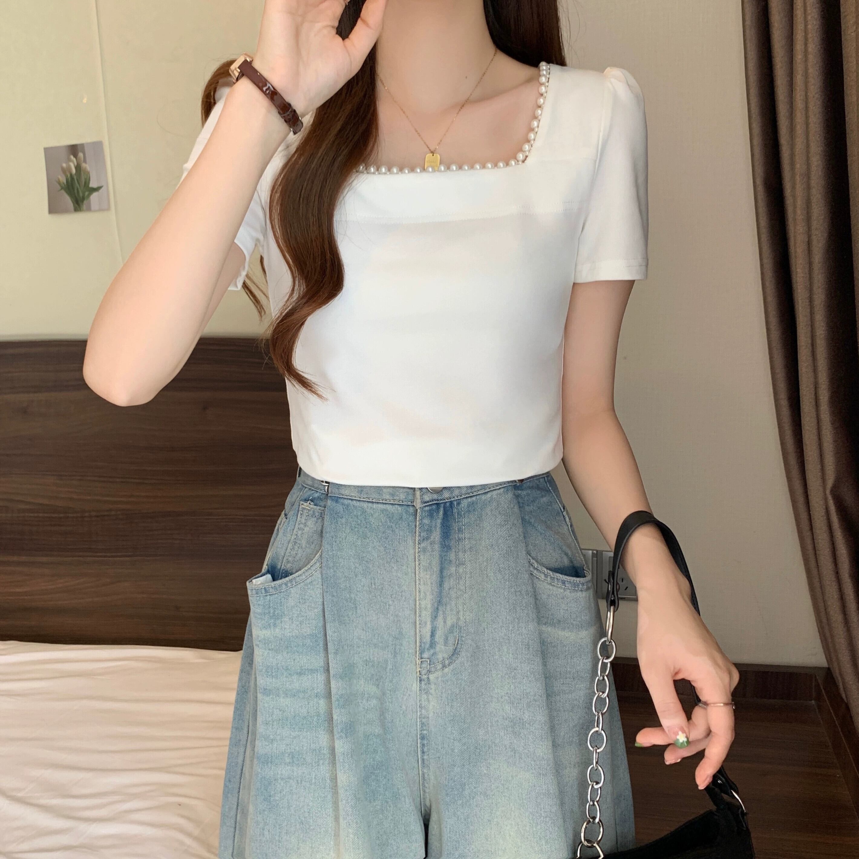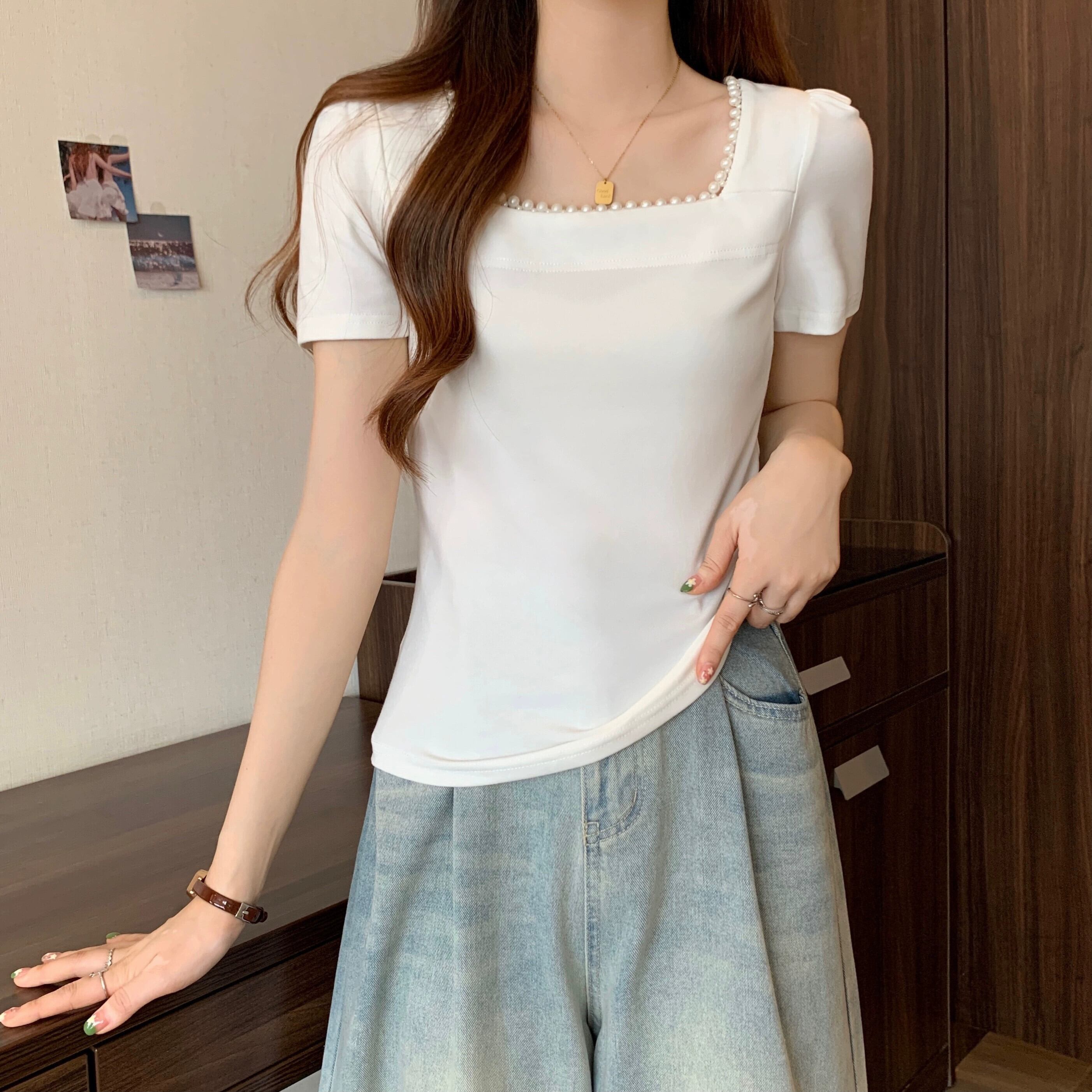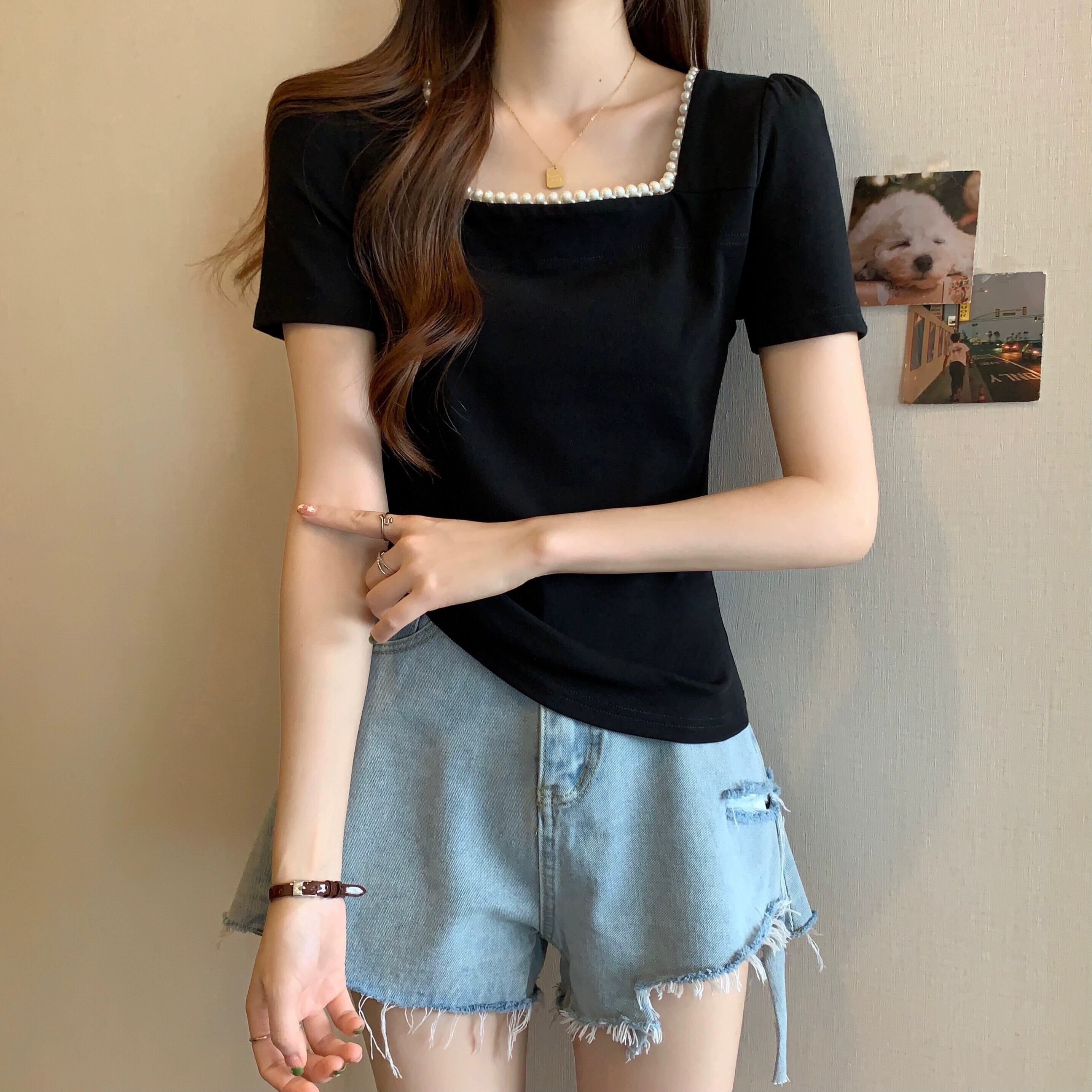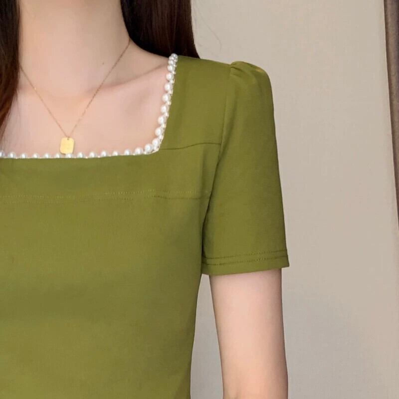 プラスサイズの女性の 2023 夏服ファットシスターフレンチパールステッチスクエアネック Tシャツ右肩半袖トップ ショート ハーフスリーブ 大きめサイズ サマー 夏物 真珠 スクウェア 8884144901690449