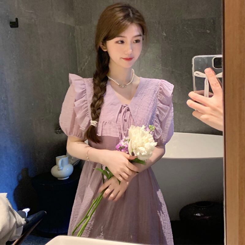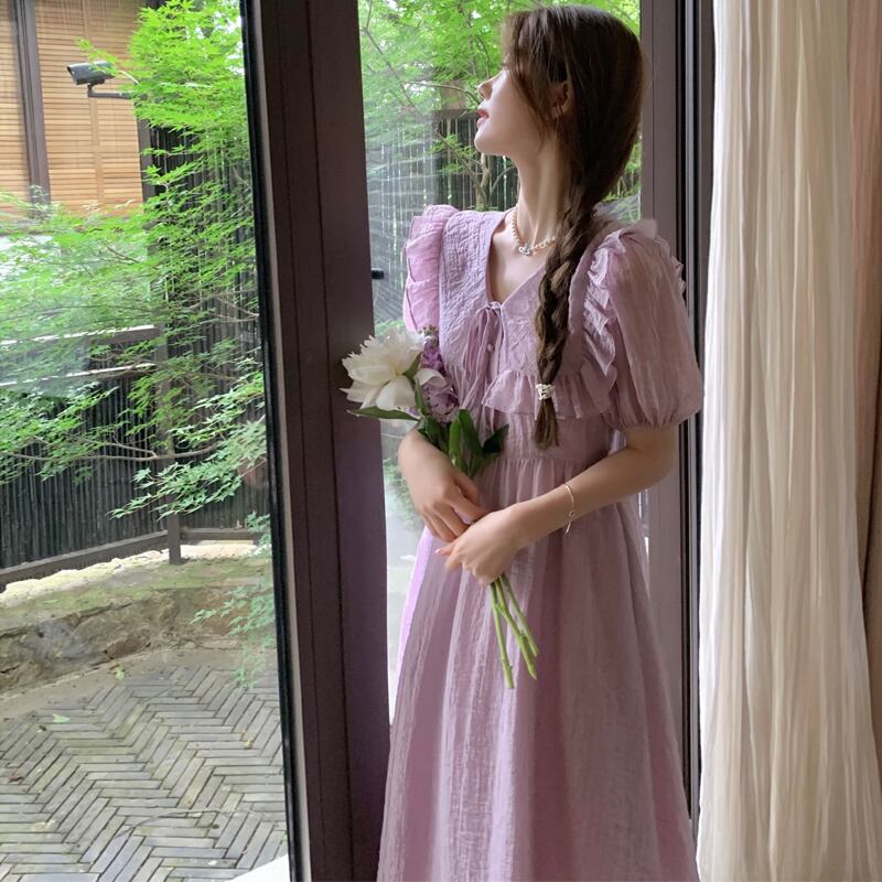 プラスサイズの脂肪姉妹紫色のドレスの女性の夏 2023 フレンチ v ネックウエストフリル妖精優しいロングスカート 大きめサイズ サマー 夏物 Vネック パープル 8884126134481596