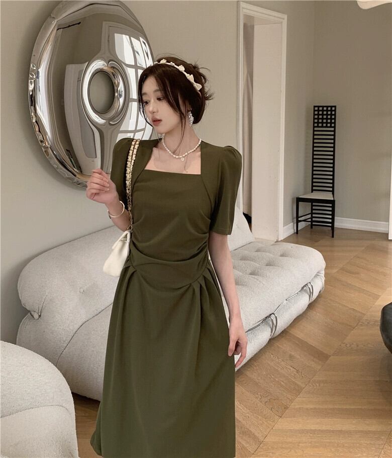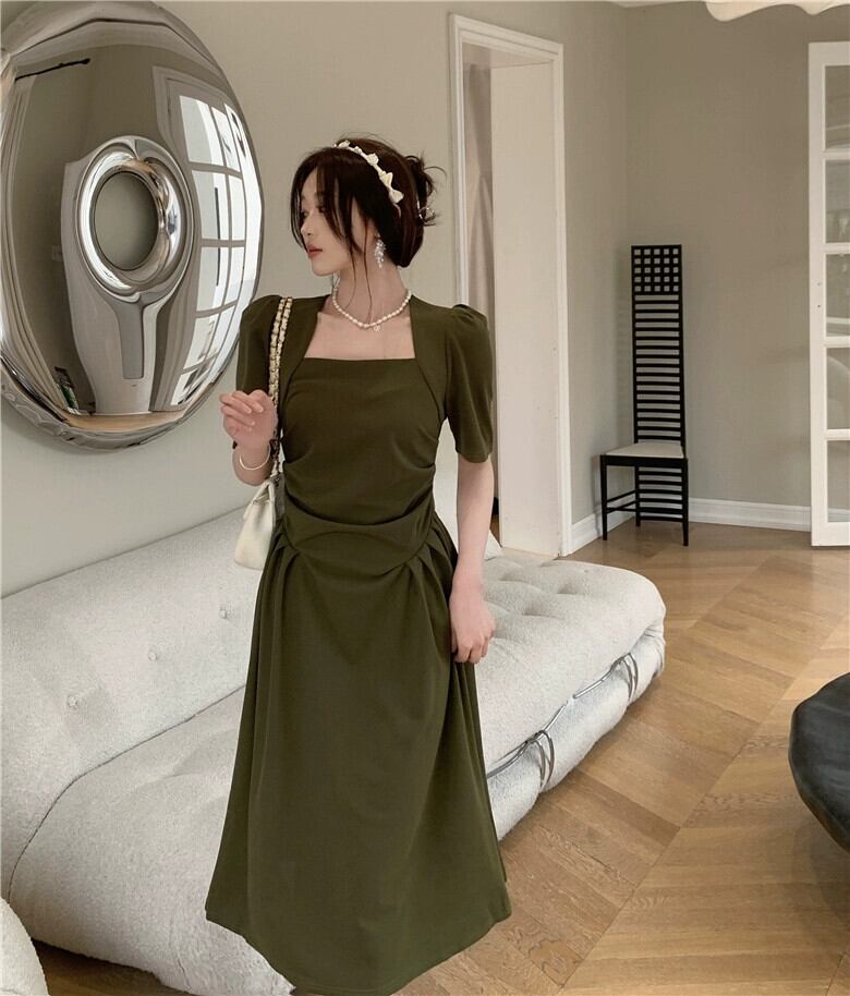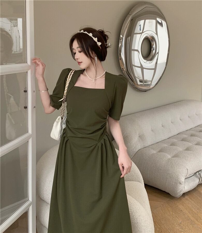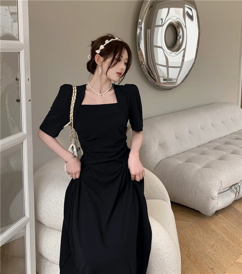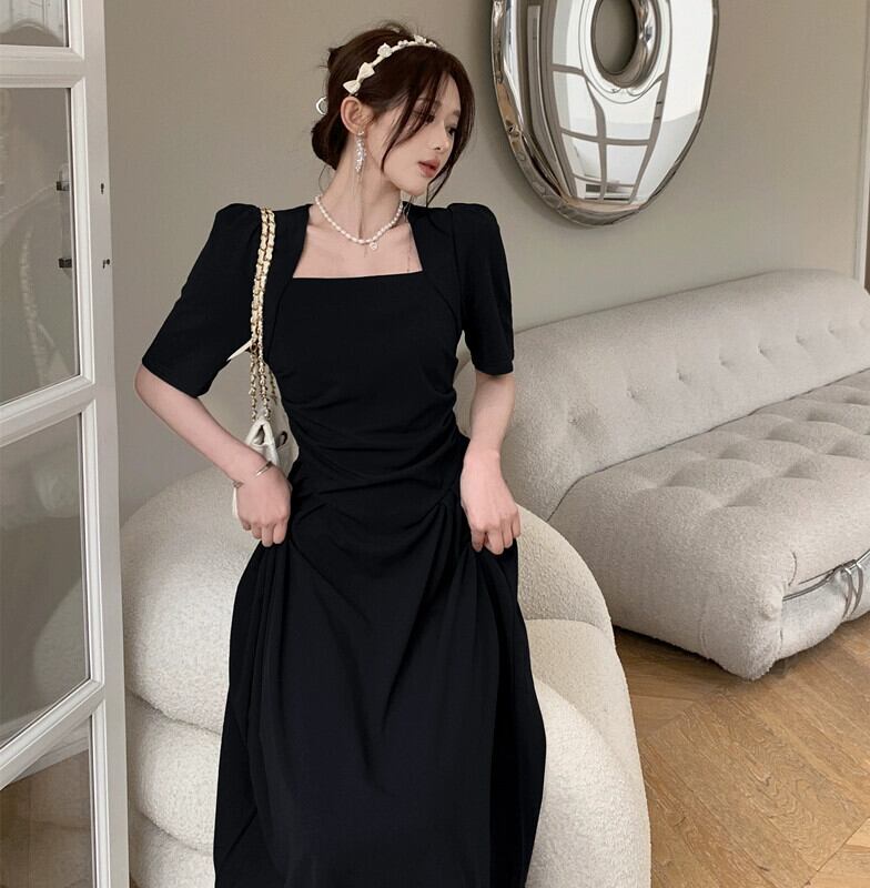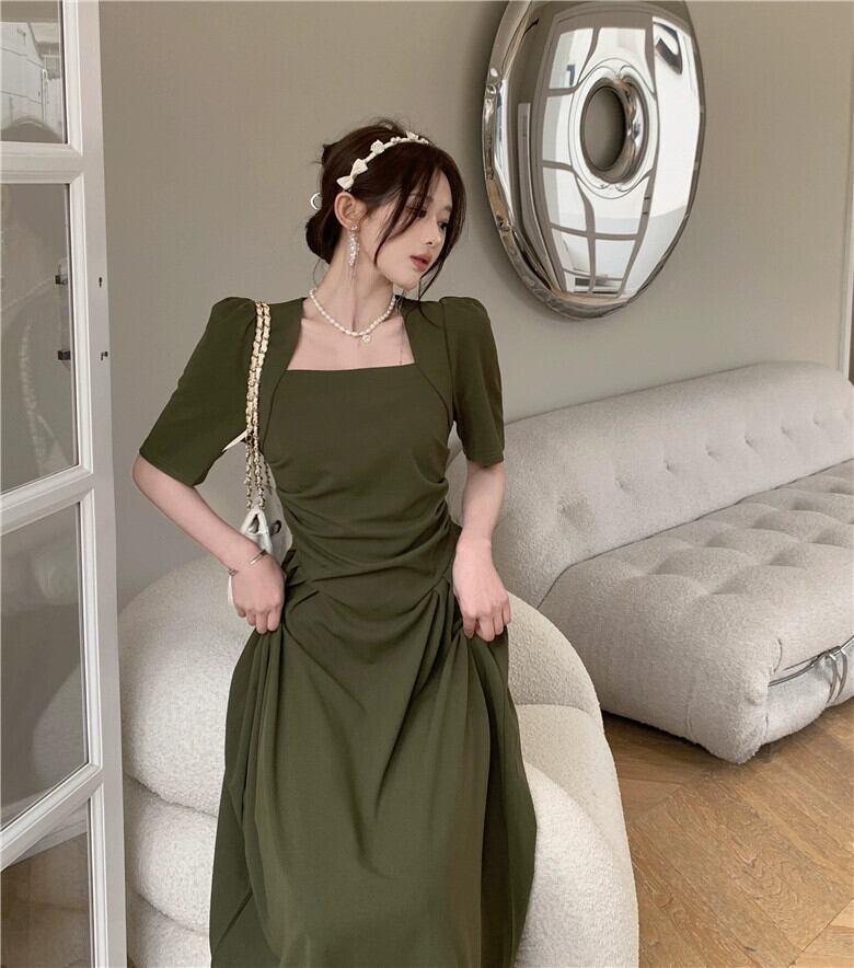 2023 夏プラスサイズの女性のフレンチスタイル痩身気質ロングスカート脂肪ウエストとスクエアカラーのハイエンドの肌カバードレス 大きめサイズ サマー 夏物 スクウェア 8884184370529383